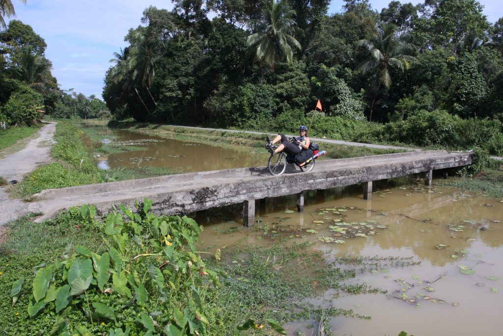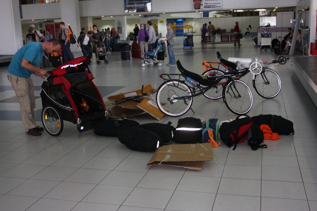 Om 5:30 gaat de wekker. De laatste dag wordt de eerste dag dat we in het donker rijden. 3 weken hebben we onze grote fietslampen bij ons, en nu dat we ze nodig hebben is een set batterijen leeg doordat Simeon er mee heeft gespeeld. Zonder straatverlichting, in het pikkedonker, met maar een koplamp wil Els de binnendoor weg naar het vliegveld nemen want die gaat ongeveer daarlangs. Ik merk wel dat ik de minst avontuurlijke van de drie ben, en gelukkig stemt Els toe dat we de hoofdweg nemen. Op deze weg staan gelukkig nu en dan een lantaarnpaal en een bord waar het vliegveld is. Op het vliegveld gaan de schuifdeuren voor ons open, en ik kan zo de vertrekhal inrijden. Iedereen zit geamuseerd naar ons te kijken als we de fietsen uit elkaar halen, behalve de schoonmaaksters die hun vloer al vies zien worden. Als eerste zijn we weer op het vliegveld, en als laatste checken we in.