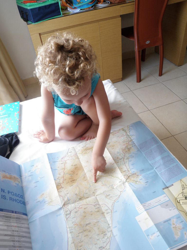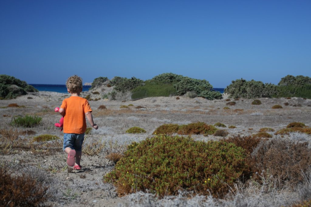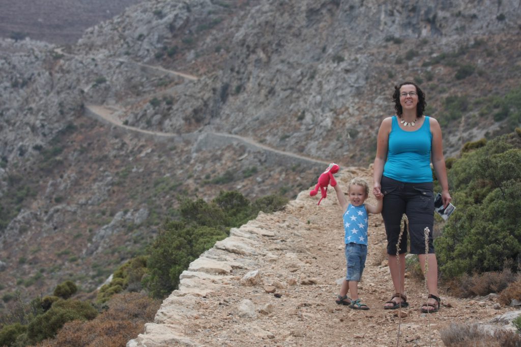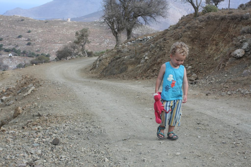 De eerste dag eindigde ook met de eerste lekke band. In een band van de fietskar zit een grote doorn, die gelijk maar twee gaten in de band heeft gemaakt. Gelukkig is de volgende dag meer berg af dan op, maar het blijft nog steeds zwaar want het gaat natuurlijk niet gelijkmatig naar beneden, een stukje omlaag en dan weer omhoog totdat we weer helemaal bij de kust zitten, in Apolakia. Zover we naar links en rechts kunnen kijken zien we een uitgestrekt strand met helemaal niemand erop. Een zalig plekje om even uit te waaien en te zitten. Maar te veel wind en golven om de zee in te gaan. Via Katavia gaan we naar de oostkant van het eiland, en hoe verder we weer naar het noorden gaan, des te drukker het wordt. In Kiotari vinden we een lekker plekje aan het strand om een paar dagen te blijven. Simeon is weer de charmeur die in winkels lolly’s krijgt, en in ons hotel koekjes krijgt van de eigenares. “Hoe heet die mevrouw ook alweer”.. “Mevrouw Anna”. “O ja, ik ga even op zoek naar Mevrouw Anna. Mevrouw Anna ik ben hier!!.” Simeon is ook wel met thuis bezig. “Als we weer thuis zijn, in het huis met 1 wc”… in tegenstelling met dit huisje twee wc’s en twee douches. De wereld van het reizen is wel erg veranderd. Lang geleden, toen we net begonnen, bestond er nog geen internet, en plozen we postkantoren uit naar onze post in de afdeling post-restante. Nu zitten we met de laptop op het terras, en een wifi verbinding alsof we thuis zijn. We boeken online de boot tickets naar de volgende 3 eilanden, en boeken ook gelijk wat hotels, zodat we niet hoeven te zoeken als we aankomen.