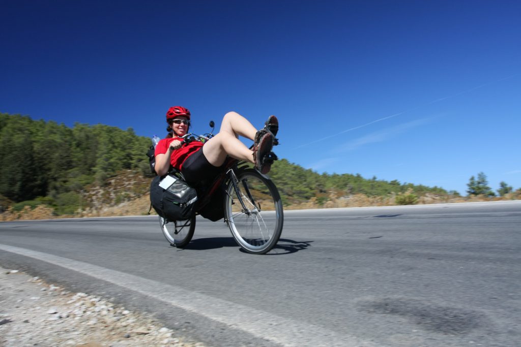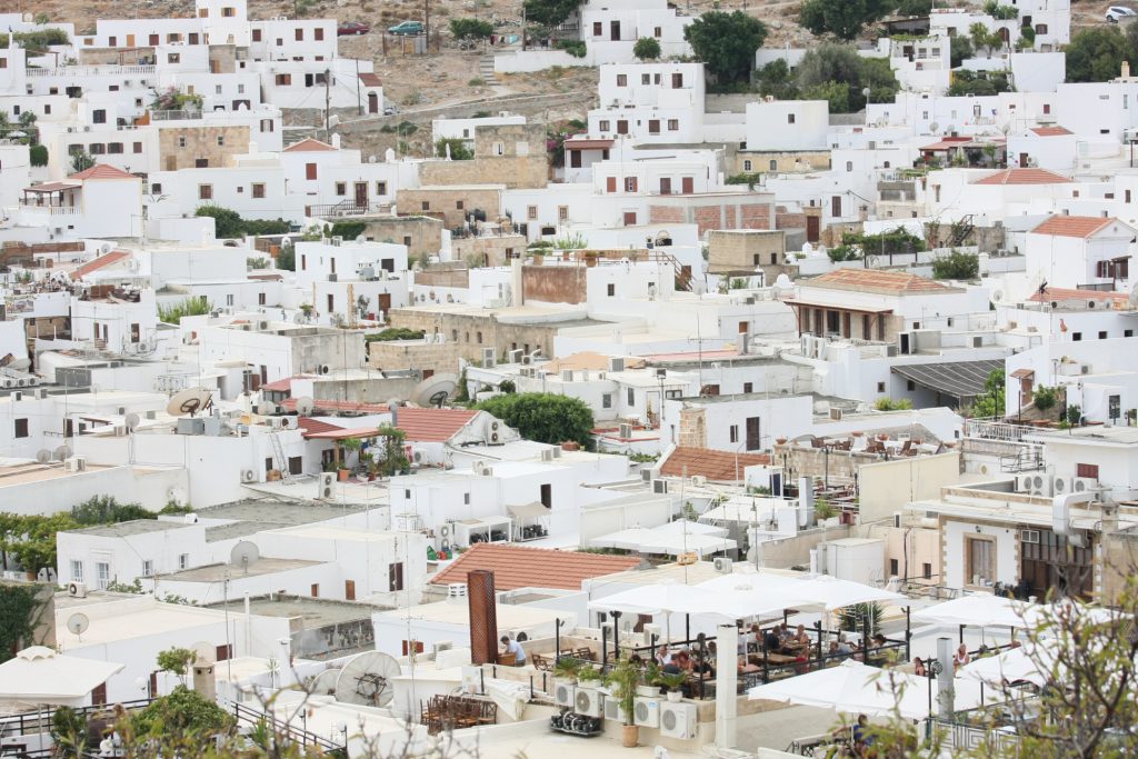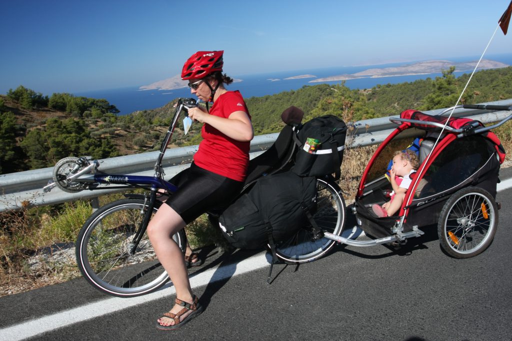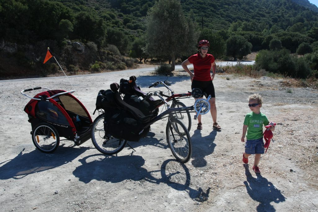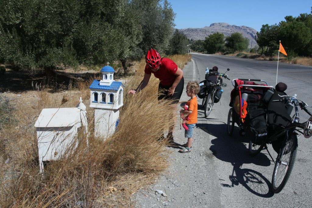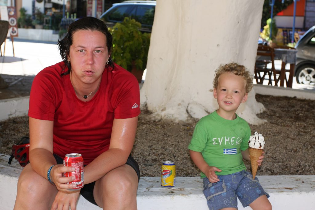 Rhodos stad.De eerste kilometers op de fiets gaan makkelijk. De weg loopt langs de kust, en is heel vlak. We kunnen er alleen niet lang van genieten, want we hebben het in ons kop gehaald om bergop te gaan. Op de kaart hadden we een mooie weg uitgezocht. Dat het een mooie weg is herleiden we aan de groene kleur van de weg. We hebben de weg alleen nooit gevonden. Veel wegen zijn hier nog onbestraat, en een klein kiezelpad heeft op onze kaart al de classificatie van weg. Met een fiets van 25 kilo, 25 kilo aan tassen, een kar van 13 kilo, een jongetje van 15 en nog 8 kilo fotospullen en nog eens 4 liter aan water is de optie van een grindpad niet echt een reële, we blijven lekker op het asfalt. Ik heb net een stukje over snelle en langzame spieren zitten lezen, en realiseer me dat dit de goede training is om mijn zwakkere langzame spieren te trainen. Als ik in het eerste dorp bergop aankom ben ik helemaal bezweet en voel ik mijn spieren omdat ik me uit de naad heb zitten fietsen. Dit is toch wel wat anders dan naar boven rijden met een 7 kilo wegend fietsje zonder bepakking. Simeon zit inmiddels aan een super groot ijsje als Els ook boven komt. Zij is zelfs bergop op een racefiets niet gewend, en rijdt alleen maar in de polder. Met een rood hoofd giet ze eerst een cola naar binnen, en na een half uur uitblazen bedenkt ze dat ze hier ook wel wil eten. Haar benen branden na iedere minuut helemaal weg waarna ze even moest lopen, of rusten. Tot een stijgingspercentage van 10% gaat het net, maar steiler mag Simeon uit de kar, en lopen we samen verder.