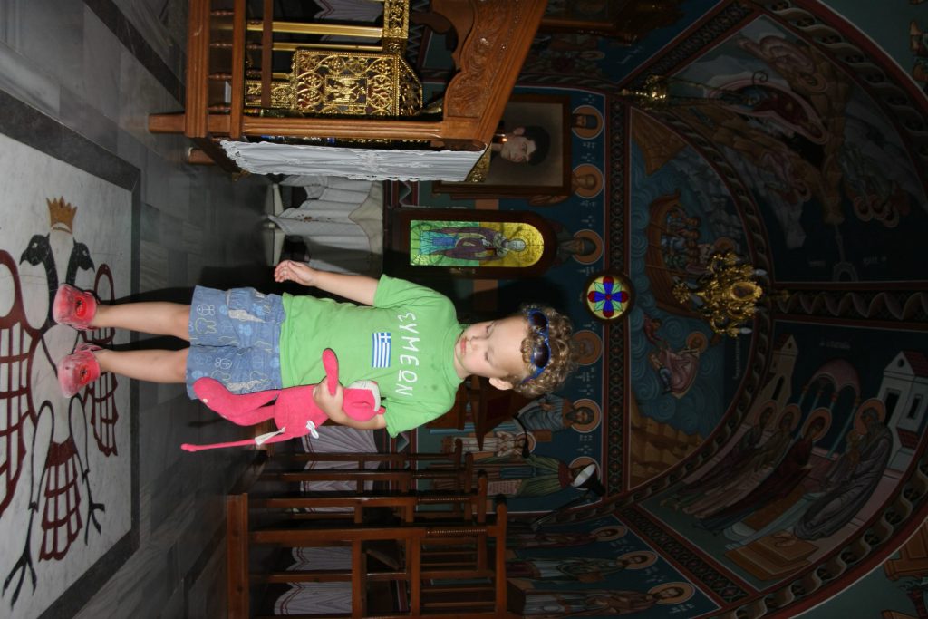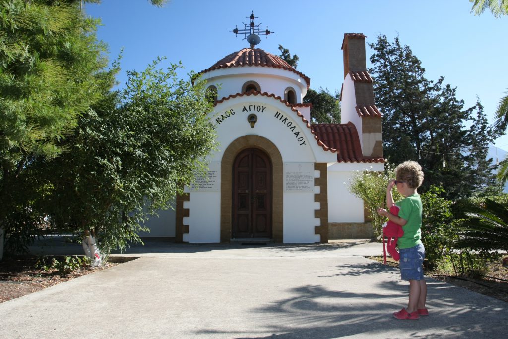 Rhodos stad.Het weer is wat slechter geworden, maar de regen en de wind houden ons niet binnen. Het lijkt erop dat als het mooi weer is we heel de dag bij het hotel blijven, en bij minder weer we erop uit trekken. Aan de andere kant van Tilos, staat een klooster waar we naartoe gaan. De tocht begint weer met de gebruikelijke wandeling op het steile beginstuk. Maar daarna is het weer overwegend naar beneden om in een klein haventje aan de andere kant van het eiland weer op zeeniveau te zitten. Er komt net een vissersboot aan, en we schuilen voor de regen in een restaurantje om het een en ander gade te slaan. Ook hier gaan weer wat handen door Simeon zijn witte krullen, en wordt hij opgepakt zodat hij in de vissersboot goed naar de vissen kan kijken. Simeon vind het wel spannend, maar snapt het nog niet helemaal; “Vissen, die kan je toch niet eten..”. De wind wordt steeds harder, en we moeten nog een paar kilometer. Dit blijken wel de steilste kilometers te zijn, en met de wind tegen. De regen in het gezicht doet soms pijn, en de benen branden weg. Op het lichtste verzet haal ik met moeite 5 kilometer per uur, en als de snelheid op 3 kilometer per uur komt is het sneller om de fiets te gaan duwen. Doorweekt en moe komen we in het verlaten klooster aan, en maken we ons klaar voor de 15 kilometer terug.