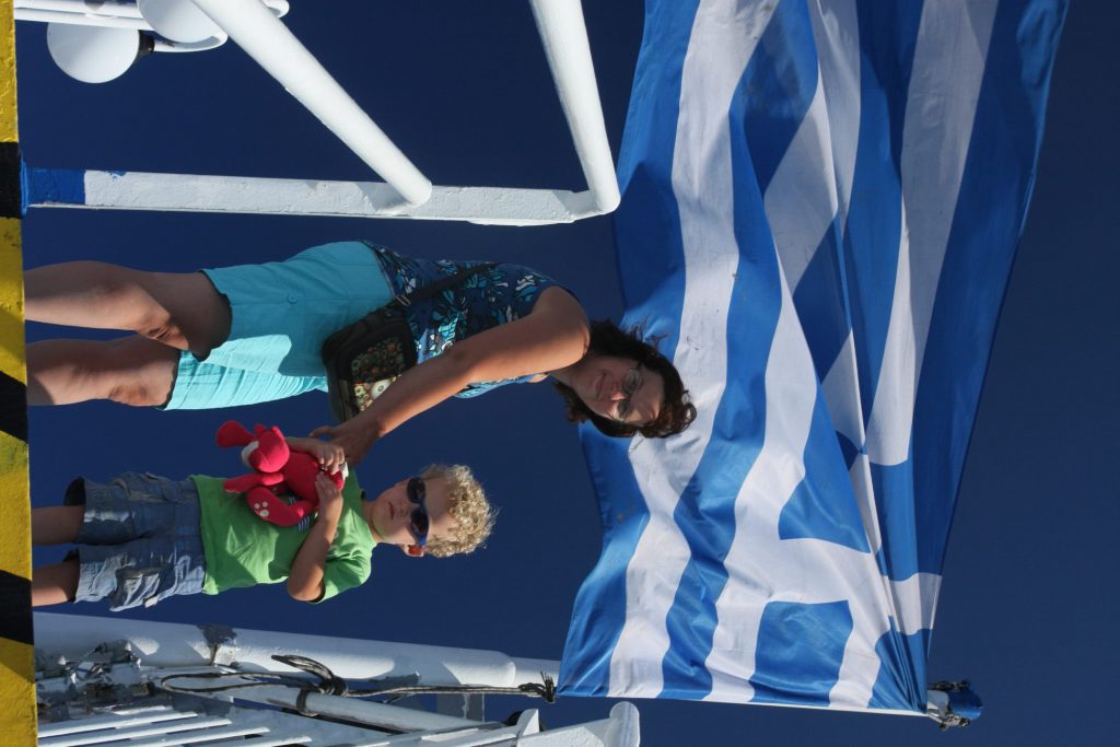 We hebben heel Rhodos via de kustweg gereden, en zijn klaar voor het volgende eiland. Hoe dichter we weer bij Rhodos stad kwamen, hoe drukker het wordt. Gisteren zijn we met de locale bus al naar de stad geweest. Het woord lokale bus heeft altijd een magische klank. De bus stopt iedere 200 meter om weer toeristen vanuit een groot hotel op te pikken. Het schoot maar niet op voordat we er waren. Met deze ervaring dachten we dat het best een lang stuk was, en we rijden al vroeg weg naar de boot. Maar als je niet bij ieder hotel hoeft te stoppen ben je er zo, en brengen we de rest van de tijd op het strand door. Met Blue Star varen we in twee en een half uur naar met een bijna lege boot naar het eiland Tilos, zo’n 30 kilometer verderop. De overtocht kost 24 euro voor 2 personen, Simeon en de fietsen gaan gratis mee. Aan boord besteden we nog eens dat bedrag aan koffie, een muffin en Toblerone chocolade, dat we om een of andere reden alleen maar kopen als we ons moeten verplaatsen.