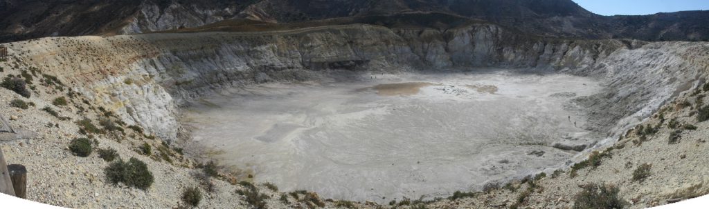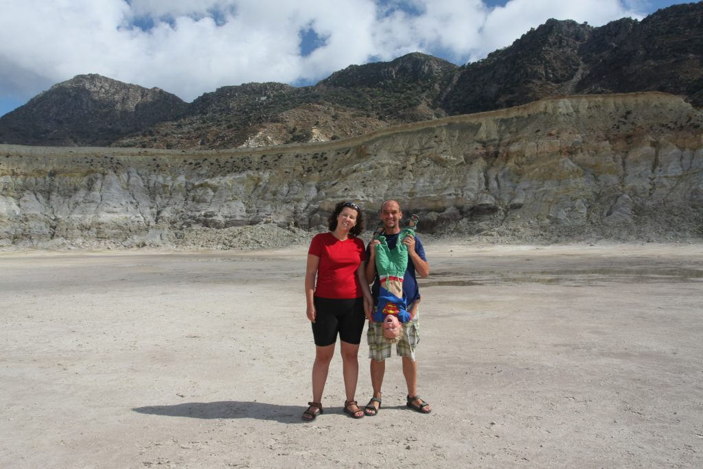 Rhodos stad.Rhodos stad.De ferry brengt ons weer naar het eiland Nisyros. Na het lekkere ontspannen Tilos is dit wel even wennen. We komen in het donker aan en alles voelt wat groter. Bij daglicht is alles toch weer wat vriendelijker. Ook hier worden we weer nagekeken op onze ligfietsen, en hebben de meeste mensen niet eens door dat er nog een kind in die kar zit. Het vreemde van nu 2 weken fietsen is dat buiten een snelle “I like your bike”, of “This is the first time I see a bike like that” niemand een praatje komt maken over de ligfietsen. Een keer was een amerikaan erg geïnteresseerd, maar het duurde even voordat we doorhadden dat het niet over de ligfietsen ging, maar over de kar waar Simeon in zit. Maar bekijks hebben we dus genoeg als we door de zeer smalle straatjes van Mandraki rijden. Nisyros is een vulkaan die miljoenen jaren actief is geweest, en net als wij even langskomen is ie net een paar duizend jaar niet meer actief. Het blijft nog een droom om een actieve vulkaan te zien, maar deze is wel een mooie dode. Het is wel een mooie en weer zware tocht naar de vulkaan. Natuurlijk is het weer een regen dag. Simeon zit droog in de kar, maar wij staan te schuilen onder een olijfboompje, en deze bomen staan niet bekend om hun dikke bladerdak. Gelukkig is de stortbui na een uurtje over en wringen we onze shirts uit en fietsen we verder. Aan de rand van de vulkaan begint de afdaling, de vulkaan in. Dit wordt de tweede keer dat we IN een vulkaan zijn, de andere keer was met een boot op Deception Island op Antarctica. De weg gaan steil omlaag (shit dat moeten we dus dadelijk weer omhoog) en beneden aangekomen is de vulkaan vlak en groeien er boompjes op de vruchtbare grond. Het is nog een klein stukje fietsen naar weer een krater in de krater van 300 bij 200 meter waar het goed naar zwavel ruikt. Door de oponthoud van de regenbui zijn zijn we ingehaald door de dagtochtjes die inmiddels ook alweer vertrokken zijn. We lopen helemaal alleen rond in deze indrukwekkende wereld van geel en groene afzetting, borrelende modder en gaatjes waar stoom uit komt. Op Simeon had het helemaal een indruk want in zijn slaap roept ie iets over “Vulkaan, Vulkaan”. Afdalend terug naar het hotel ziet Simeon weer een gedenkshuisje aan de kant van de weg en roept “Als ik iets moois ziet moeten rullie wel stoppen.”, Ik beloof voortaan te stoppen, maar ga nu echt niet terug, weer die berg op. Terug in het hotel rusten we uit in het geothermische zwembad van ons hotel. Simeon vind het reuze interessant dat dit water is uit de vulkaan waar hij net in is geweest.