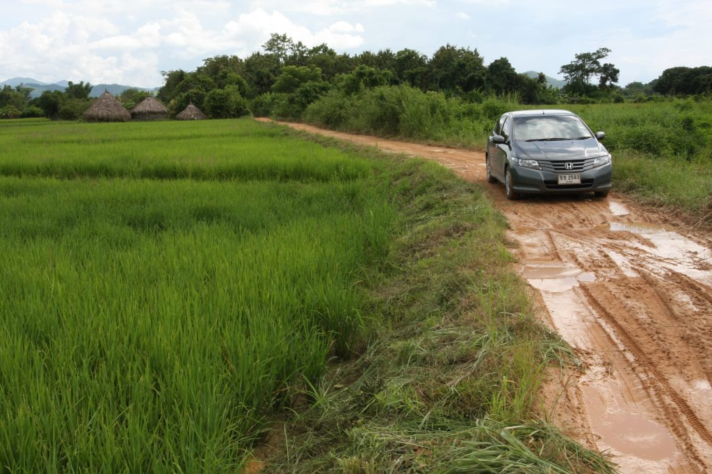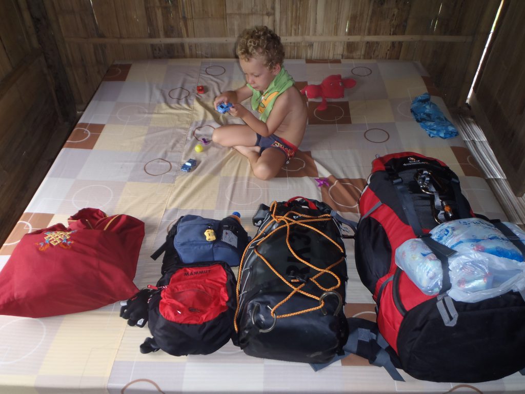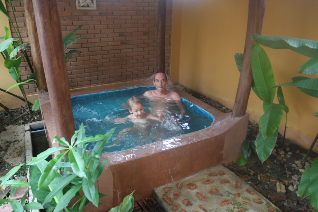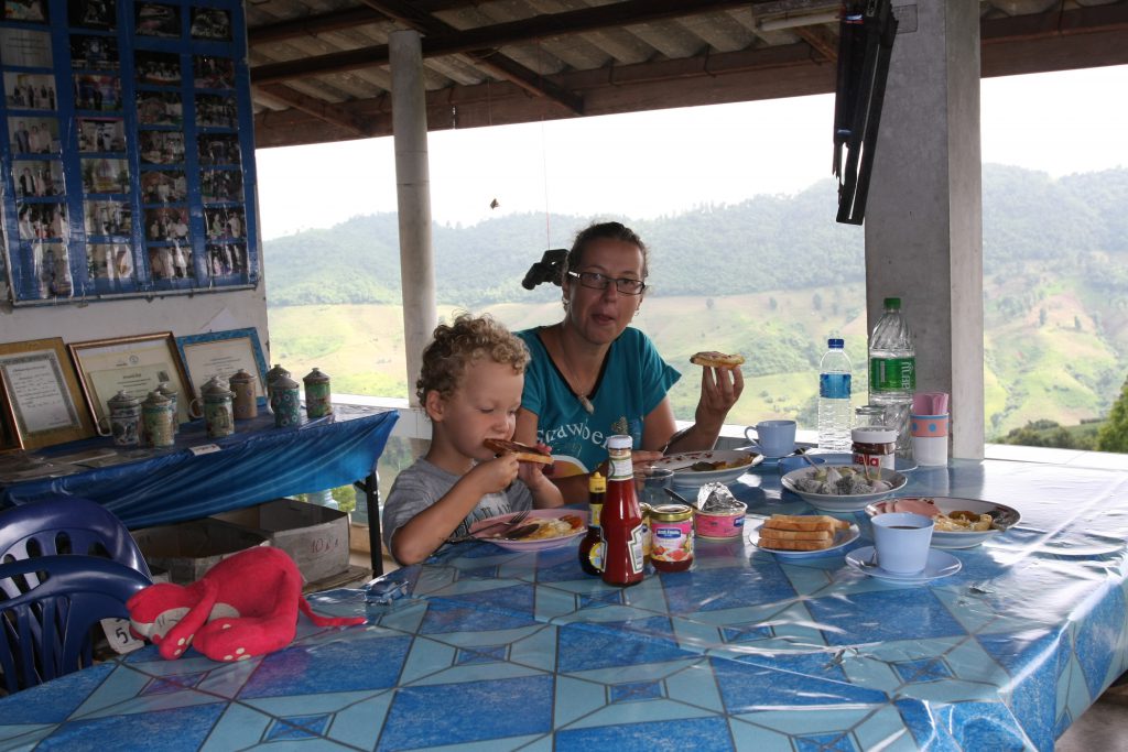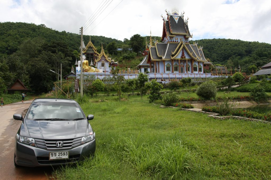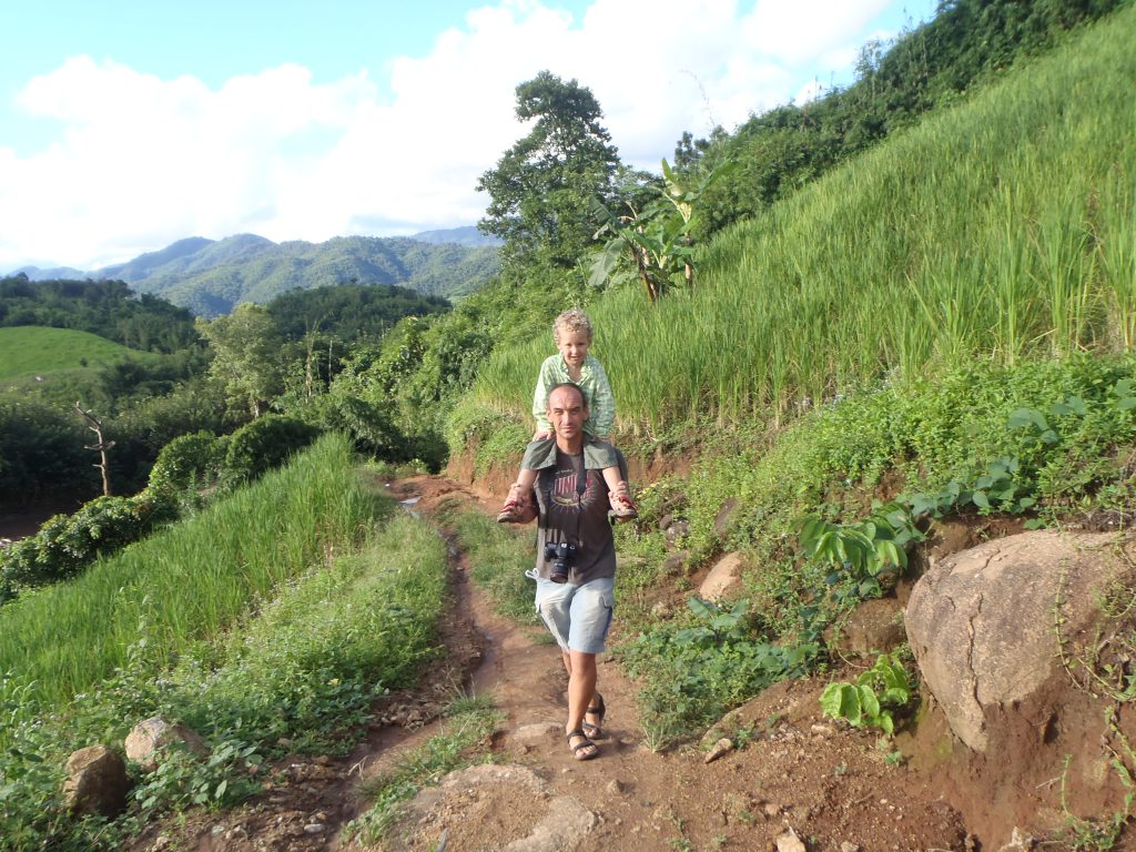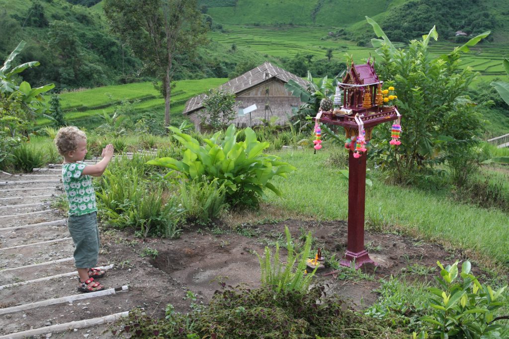 Het voelt wel heel anders met een auto op pad. Het is wel met eigen vervoer, maar het voelt niet zo eigen. In plaats van reizen voelt het meer als vakantie. We zien een fietsreiziger haar fiets zwetend naar boven duwen. we doen ons raampje open maar voelen opeens de afstand tot dat reizen, doen het raampje maar weer dicht en rijden verder met de airco aan. Het is 10 dagen een echte familie vakantie geworden. Arjan is aan het rijden, Els zit ernaast kaart te lezen en Simeon zit op de achterbank te roepen of we al bij het hotel zijn, en dat hij de iPad wil. De moesson is nog niet afgelopen, we lezen dat de trein niet meer rijdt door de overstromingen, en wij staan in de file omdat de aardverschuivingen veel bomen en aarde op de weg heeft achtergelaten. Een waterval en een hotspring onderweg zijn dicht door de vele regen en daarom zijn we genoodzaakt om in Pai voor een hotspring maar een hotel te nemen met een persoonlijke hotspring bij de kamer.