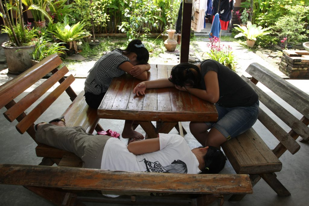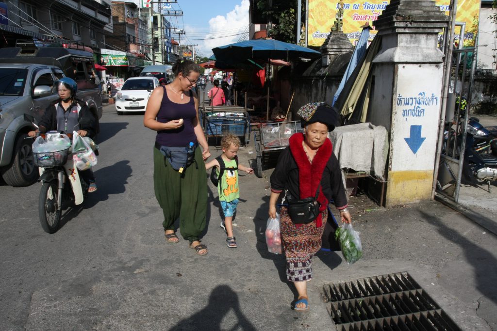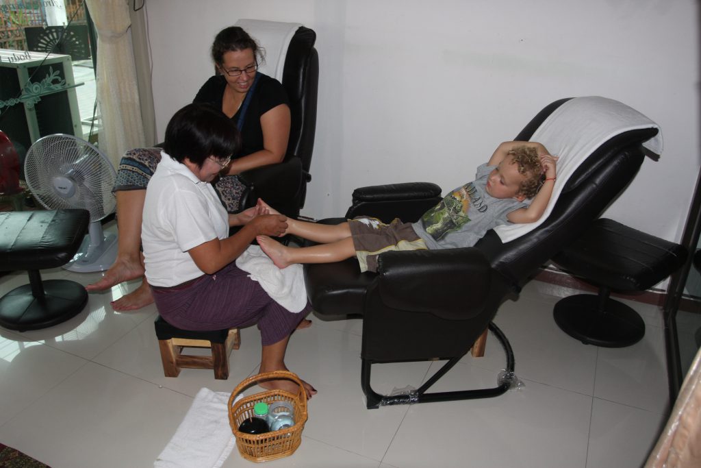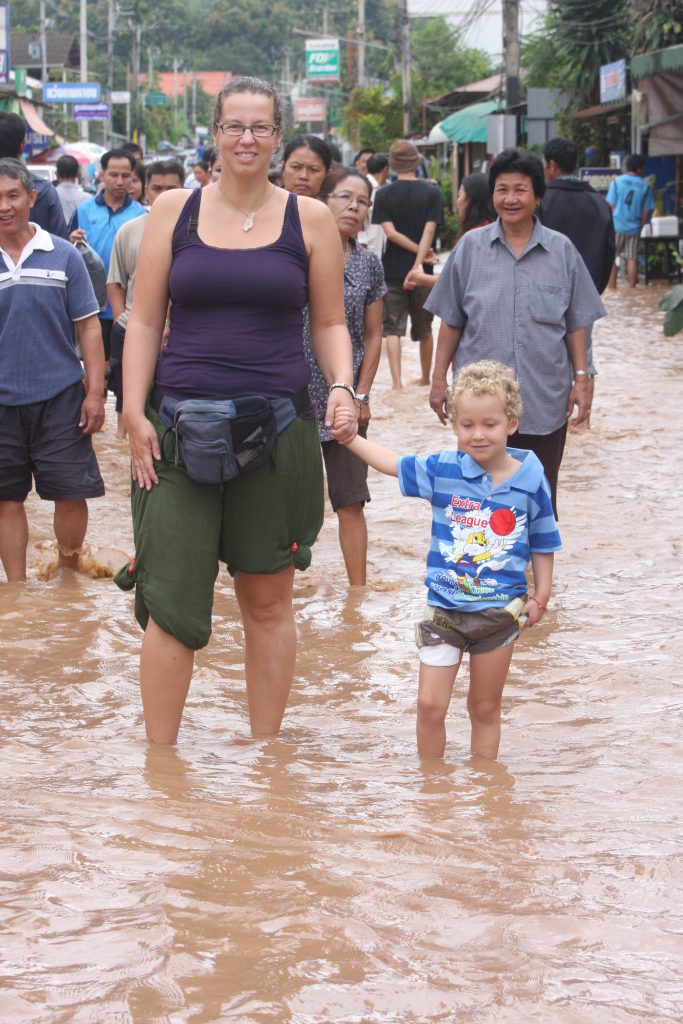 Er zijn niet zoveel plekken om nog naartoe te gaan, want er staat zo veel onderwater. Het halve land staat onder water en er wordt gezegd dat het de zwaarste overstromingen in 50 jaar zijn. We blijven dan maar een tijdje in Chiang Mai, laten ons alle drie masseren en proberen lekker uit te rusten. Simeon vind het masseren erg lekker kietelen, maar na 10 minuten is zijn geduld wel op, gelukkig hebben we maar 15 minuten voor hem geregeld.
