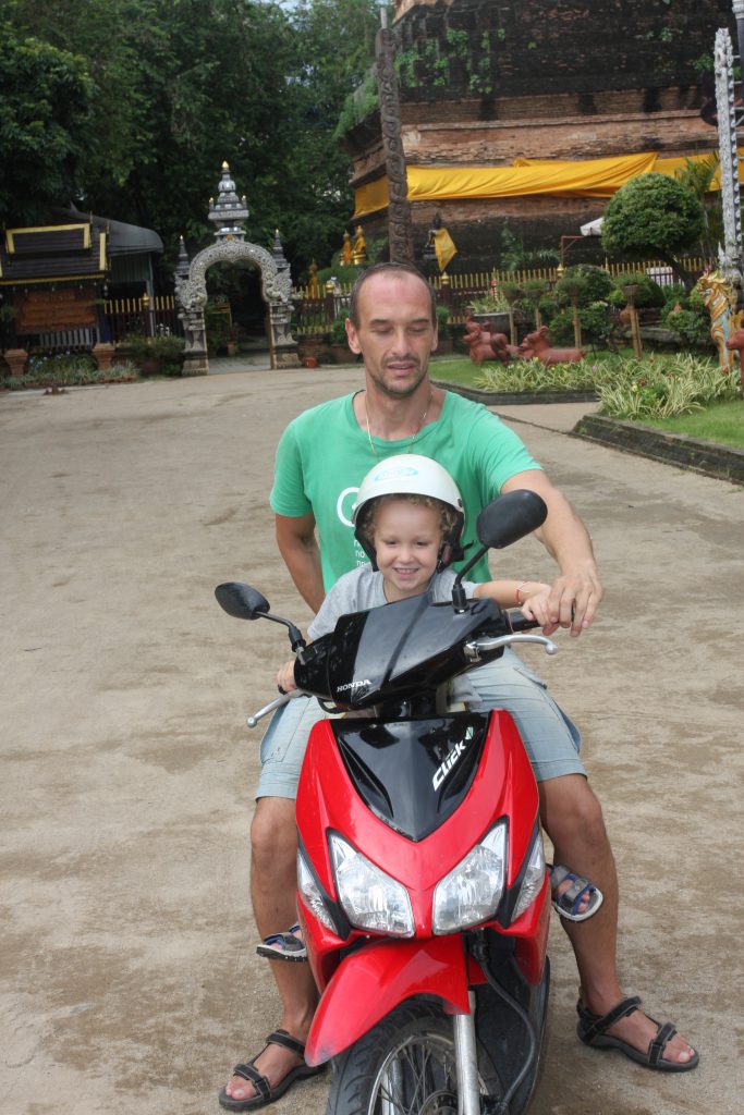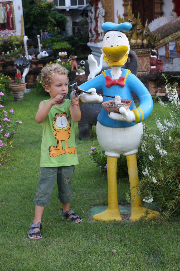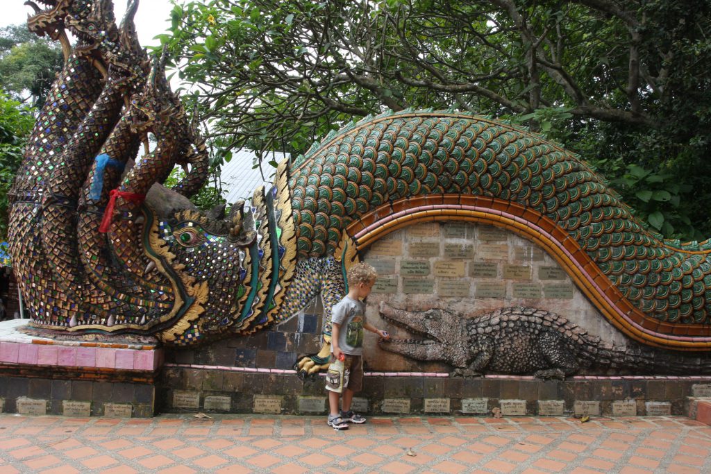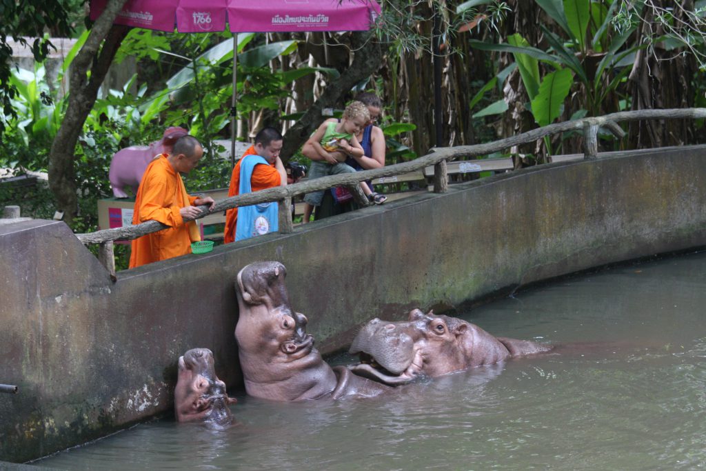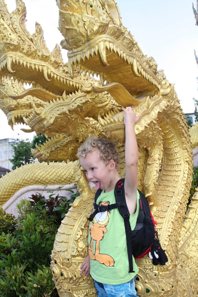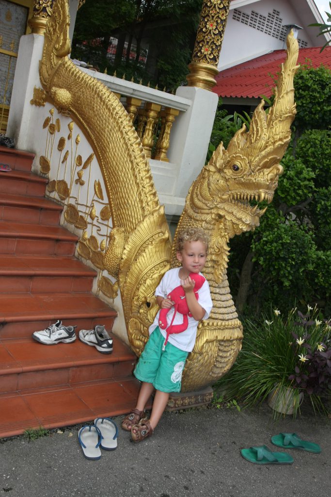 Met z n drieen op een 110cc scootertje op weg naar Doi Suthep. We volgden gewoon weer lekker de GPS en als we in het Doi Suthep national park aankomen vinden we het al knap dat zoveel mensen dit kunnen vinden zonder GPS. De smalle kronkelweggetjes lijken niet zo lekker met een touring bus te berijden, maar we krijgen helemaal argwaan dat dit niet de goede weg is als de weg overgaat in een dirtroad-track. Na wat navraag moeten we 20 kilometer terugrijden om wel bij de goede weg te komen, een brede snelweg de berg op naar de tempel met de lange drakentrap. Op de trap herkennen we het mooie vijfjarige bergvolk meisje dat op zoveel foto’s staat die verkocht worden op de avondmarkt in Chiang Mai. “Picture, picture, you take picture”. Verder op de trap staan haar even oude broertjes en zusjes allemaal in klederdracht schattig te zijn onder het oog van een streng toeziende hoeder. Voorlopig zullen ze niet naar school gaan, want het geld stroomt binnen van toeristen die met de schattige meisjes op de foto willen. Triest, maar wel weer beter dan kinderprostitutie waar veel arme bergvolk kinderen in terecht komen… De trappen staan vol kraampjes, maar boven aangekomen is er toch nog een beetje respect voor de tempel, en staan alleen wat fotografen die je willen vastleggen. Het is wel een hele mooie tempel met ook Simeon zijn favoriete boeddha, de slapende boeddha. Bij alle schilderingen moeten we steeds weer aan Simeon het verhaal van Boeddha vertellen, en de bellen en gongen moeten allemaal klinken. Het eten in Thailand is meestal heel lekker, maar in Chiang Mai eten we het lekkerste dat we tot nu toe hebben gehad. Het duurt wel een hele dag voordat we alles gemaakt en opgegeten hebben tijdens de Thaise kook sursus. Gebakken noedels, mangosalade, sticky rice met mango, maiskoekjes en zalige curry’s kunnen we nu maken, dus als je een keer wilt komen eten… Een dagje naar de dierentuin. We hadden onze vooroordelen over Aziatische dierentuinen, maar dat hebben we aan de kant gezet voor een leuke dag voor Simeon. Onze vooroordelen waren gebaseerd op uitgemergelde dieren die met stenen bekogeld werden in de dierentuin van Tibet. Dit is alleen een ander land, de dieren zien er erg goed uit en de verblijven zijn heel ruim opgezet. Nijlpaarden zo dichtbij dat je er bijna door opgegeten kan worden, Olifanten die je kunt voeren en leeuwen, tijgers en panters die gelukkig ver weg zitten. Op het moment dat Arjan zijn ouders de panda’s in China aan het bekijken zijn, zijn wij bij 3 van de 35 panda’s die buiten China verblijven. Een ervan is in deze dierentuin geboren, wat een unieke prestatie is. Uitgebreid staan op grote wandborden hoe ze dit gedaan hebben. Foto’s over het meten van de ballen van papa panda, de probes die ze gebruikt hebben…. en toen zijn we maar weer naar de dieren gaan kijken.