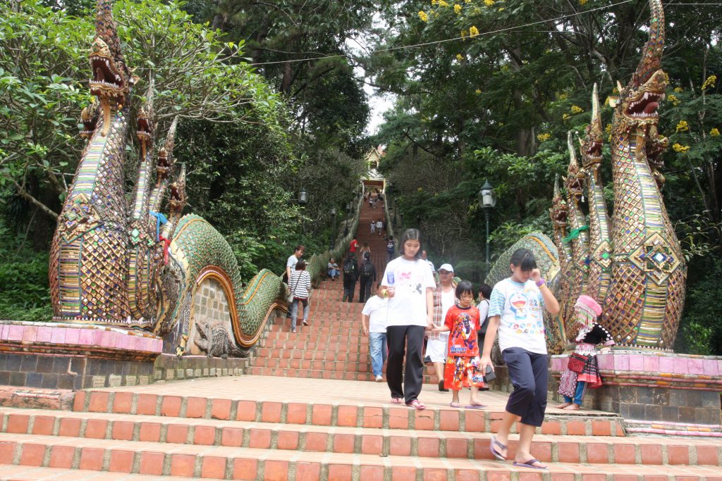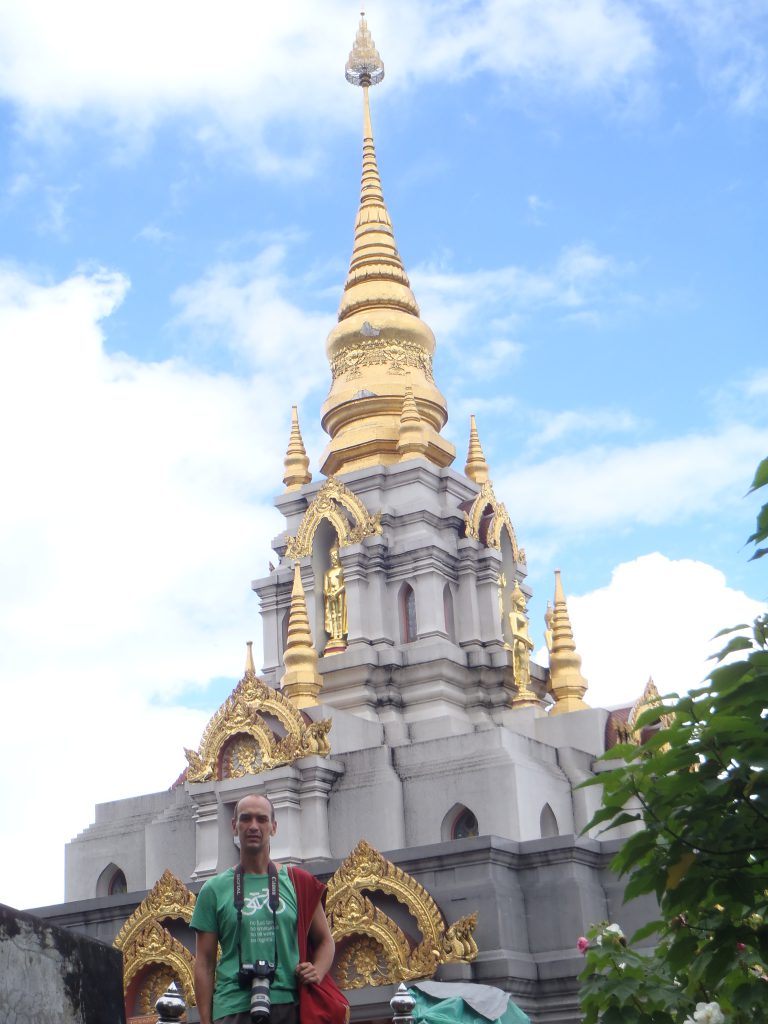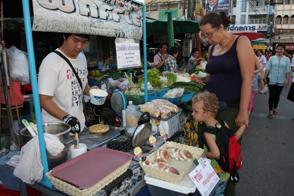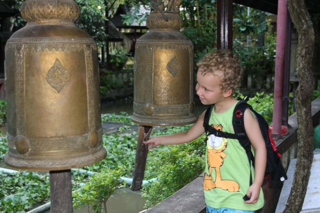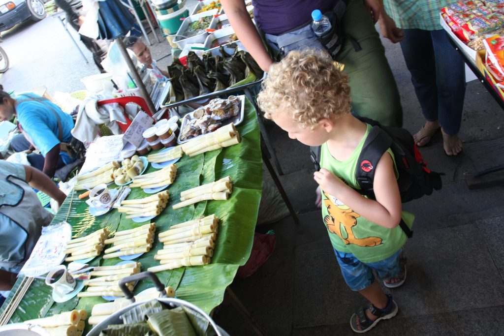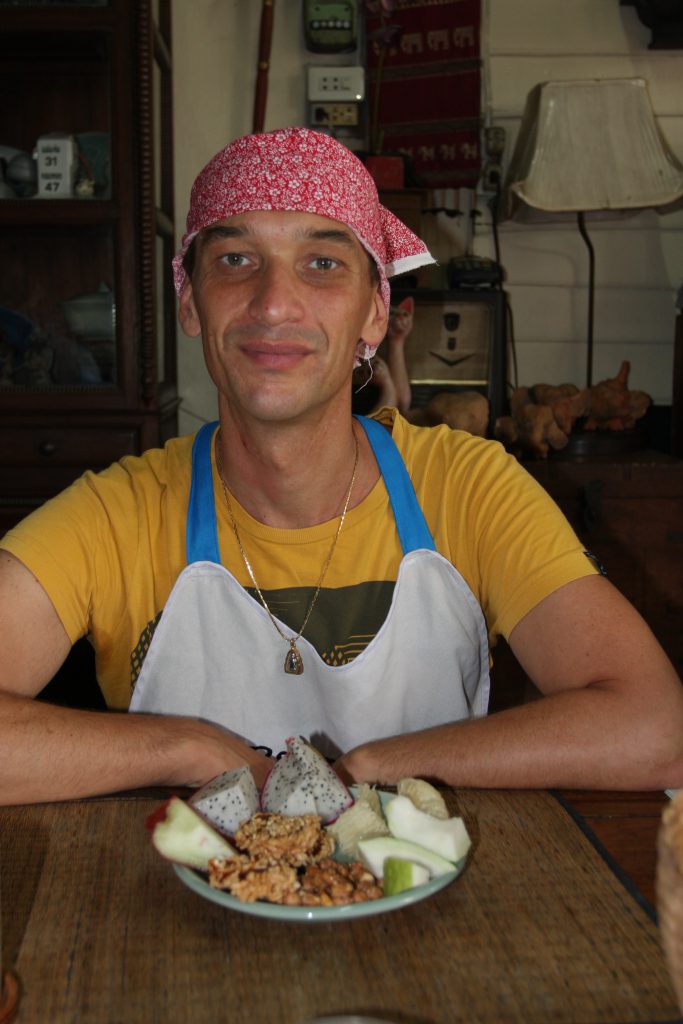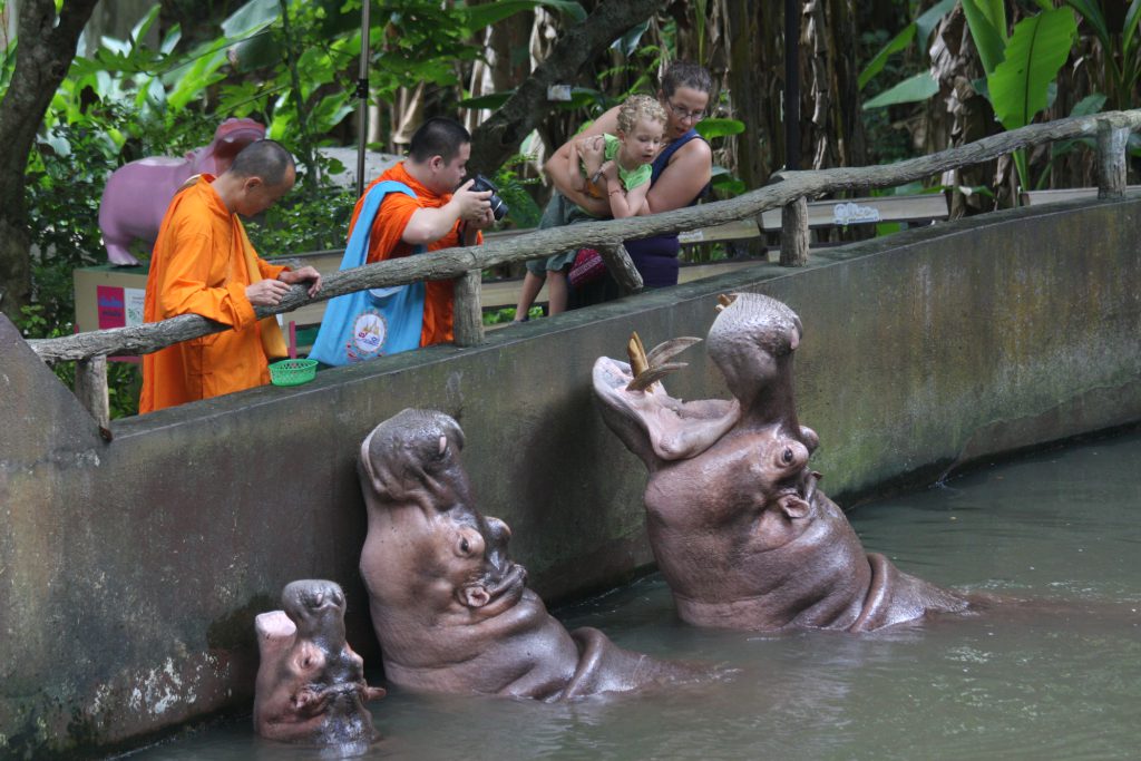 Met z n drieen op een 110cc scootertje op weg naar Doi Suthep. We volgden gewoon weer lekker de GPS en als we in het Doi Suthep national park aankomen vinden we het al knap dat zoveel mensen dit kunnen vinden zonder GPS. De smalle kronkelweggetjes lijken niet zo lekker met een touring bus te berijden, maar we krijgen helemaal argwaan dat dit niet de goede weg is als de weg overgaat in een dirtroad-track. Na wat navraag moeten we 20 kilometer terugrijden om wel bij de goede weg te komen, een brede snelweg de berg op naar de tempel met de lange drakentrap. Op de trap herkennen we het mooie vijfjarige bergvolk meisje dat op zoveel foto’s staat die verkocht worden op de avondmarkt in Chiang Mai. “Picture, picture, you take picture”. Verder op de trap staan haar even oude broertjes en zusjes allemaal in klederdracht schattig te zijn onder het oog van een streng toeziende hoeder. Voorlopig zullen ze niet naar school gaan, want het geld stroomt binnen van toeristen die met de schattige meisjes op de foto willen. Triest, maar wel weer beter dan kinderprostitutie waar veel arme bergvolk kinderen in terecht komen… De trappen staan vol kraampjes, maar boven aangekomen is er toch nog een beetje respect voor de tempel, en staan alleen wat fotografen die je willen vastleggen. Het is wel een hele mooie tempel met ook Simeon zijn favoriete boeddha, de slapende boeddha. Bij alle schilderingen moeten we steeds weer aan Simeon het verhaal van Boeddha vertellen, en de bellen en gongen moeten allemaal klinken. Het eten in Thailand is meestal heel lekker, maar in Chiang Mai eten we het lekkerste dat we tot nu toe hebben gehad. Het duurt wel een hele dag voordat we alles gemaakt en opgegeten hebben tijdens de Thaise kook sursus. Gebakken noedels, mangosalade, sticky rice met mango, maiskoekjes en zalige curry’s kunnen we nu maken, dus als je een keer wilt komen eten… Een dagje naar de dierentuin. We hadden onze vooroordelen over Aziatische dierentuinen, maar dat hebben we aan de kant gezet voor een leuke dag voor Simeon. Onze vooroordelen waren gebaseerd op uitgemergelde dieren die met stenen bekogeld werden in de dierentuin van Tibet. Dit is alleen een ander land, de dieren zien er erg goed uit en de verblijven zijn heel ruim opgezet. Nijlpaarden zo dichtbij dat je er bijna door opgegeten kan worden, Olifanten die je kunt voeren en leeuwen, tijgers en panters die gelukkig ver weg zitten. Op het moment dat Arjan zijn ouders de panda’s in China aan het bekijken zijn, zijn wij bij 3 van de 35 panda’s die buiten China verblijven. Een ervan is in deze dierentuin geboren, wat een unieke prestatie is. Uitgebreid staan op grote wandborden hoe ze dit gedaan hebben. Foto’s over het meten van de ballen van papa panda, de probes die ze gebruikt hebben…. en toen zijn we maar weer naar de dieren gaan kijken.