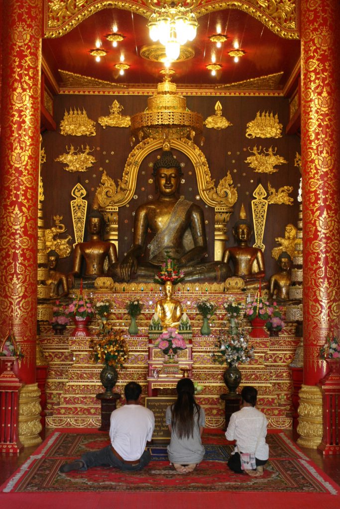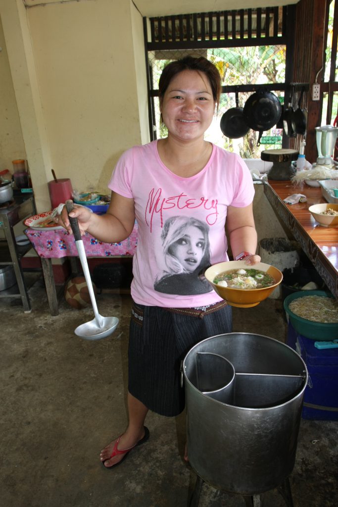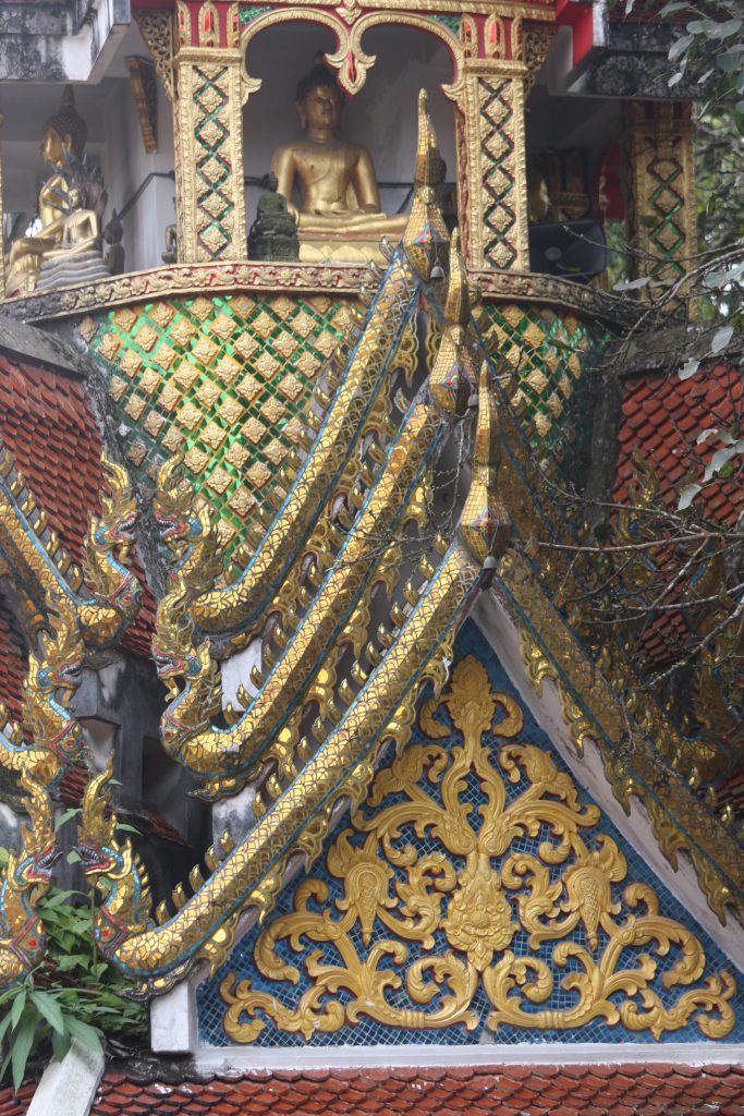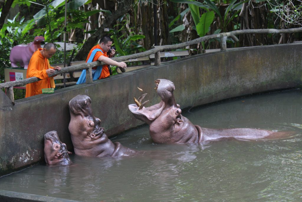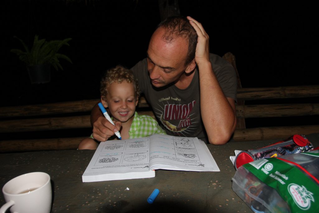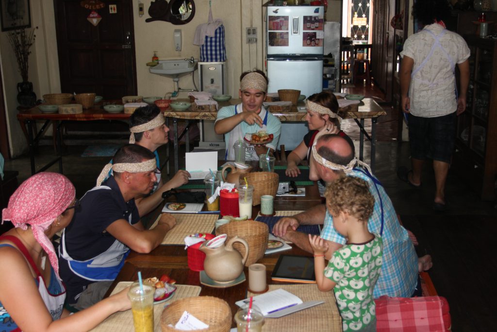 Met z n drieen op een 110cc scootertje op weg naar Doi Suthep. We volgden gewoon weer lekker de GPS en als we in het Doi Suthep national park aankomen vinden we het al knap dat zoveel mensen dit kunnen vinden zonder GPS. De smalle kronkelweggetjes lijken niet zo lekker met een touring bus te berijden, maar we krijgen helemaal argwaan dat dit niet de goede weg is als de weg overgaat in een dirtroad-track. Na wat navraag moeten we 20 kilometer terugrijden om wel bij de goede weg te komen, een brede snelweg de berg op naar de tempel met de lange drakentrap. Op de trap herkennen we het mooie vijfjarige bergvolk meisje dat op zoveel foto’s staat die verkocht worden op de avondmarkt in Chiang Mai. “Picture, picture, you take picture”. Verder op de trap staan haar even oude broertjes en zusjes allemaal in klederdracht schattig te zijn onder het oog van een streng toeziende hoeder. Voorlopig zullen ze niet naar school gaan, want het geld stroomt binnen van toeristen die met de schattige meisjes op de foto willen. Triest, maar wel weer beter dan kinderprostitutie waar veel arme bergvolk kinderen in terecht komen… De trappen staan vol kraampjes, maar boven aangekomen is er toch nog een beetje respect voor de tempel, en staan alleen wat fotografen die je willen vastleggen. Het is wel een hele mooie tempel met ook Simeon zijn favoriete boeddha, de slapende boeddha. Bij alle schilderingen moeten we steeds weer aan Simeon het verhaal van Boeddha vertellen, en de bellen en gongen moeten allemaal klinken. Het eten in Thailand is meestal heel lekker, maar in Chiang Mai eten we het lekkerste dat we tot nu toe hebben gehad. Het duurt wel een hele dag voordat we alles gemaakt en opgegeten hebben tijdens de Thaise kook sursus. Gebakken noedels, mangosalade, sticky rice met mango, maiskoekjes en zalige curry’s kunnen we nu maken, dus als je een keer wilt komen eten… Een dagje naar de dierentuin. We hadden onze vooroordelen over Aziatische dierentuinen, maar dat hebben we aan de kant gezet voor een leuke dag voor Simeon. Onze vooroordelen waren gebaseerd op uitgemergelde dieren die met stenen bekogeld werden in de dierentuin van Tibet. Dit is alleen een ander land, de dieren zien er erg goed uit en de verblijven zijn heel ruim opgezet. Nijlpaarden zo dichtbij dat je er bijna door opgegeten kan worden, Olifanten die je kunt voeren en leeuwen, tijgers en panters die gelukkig ver weg zitten. Op het moment dat Arjan zijn ouders de panda’s in China aan het bekijken zijn, zijn wij bij 3 van de 35 panda’s die buiten China verblijven. Een ervan is in deze dierentuin geboren, wat een unieke prestatie is. Uitgebreid staan op grote wandborden hoe ze dit gedaan hebben. Foto’s over het meten van de ballen van papa panda, de probes die ze gebruikt hebben…. en toen zijn we maar weer naar de dieren gaan kijken.
