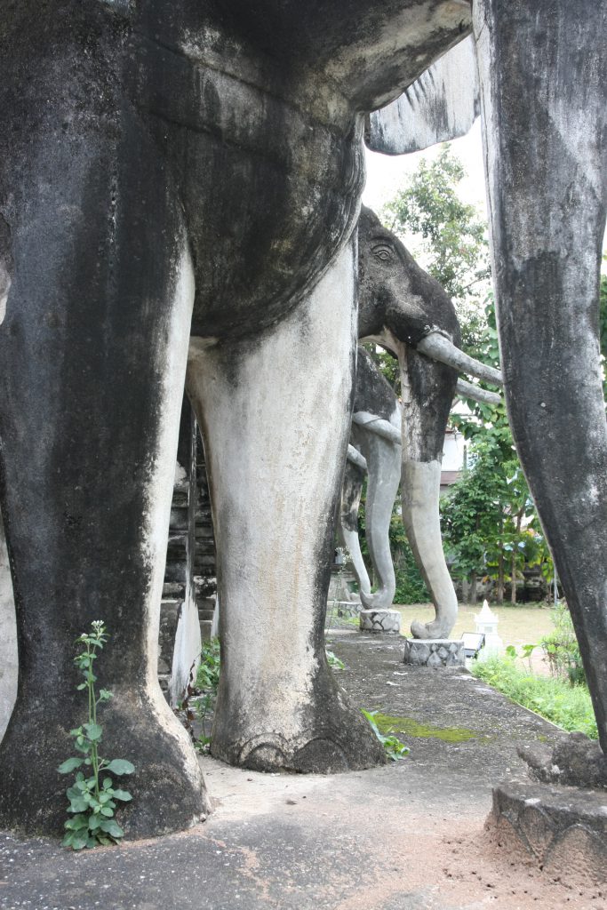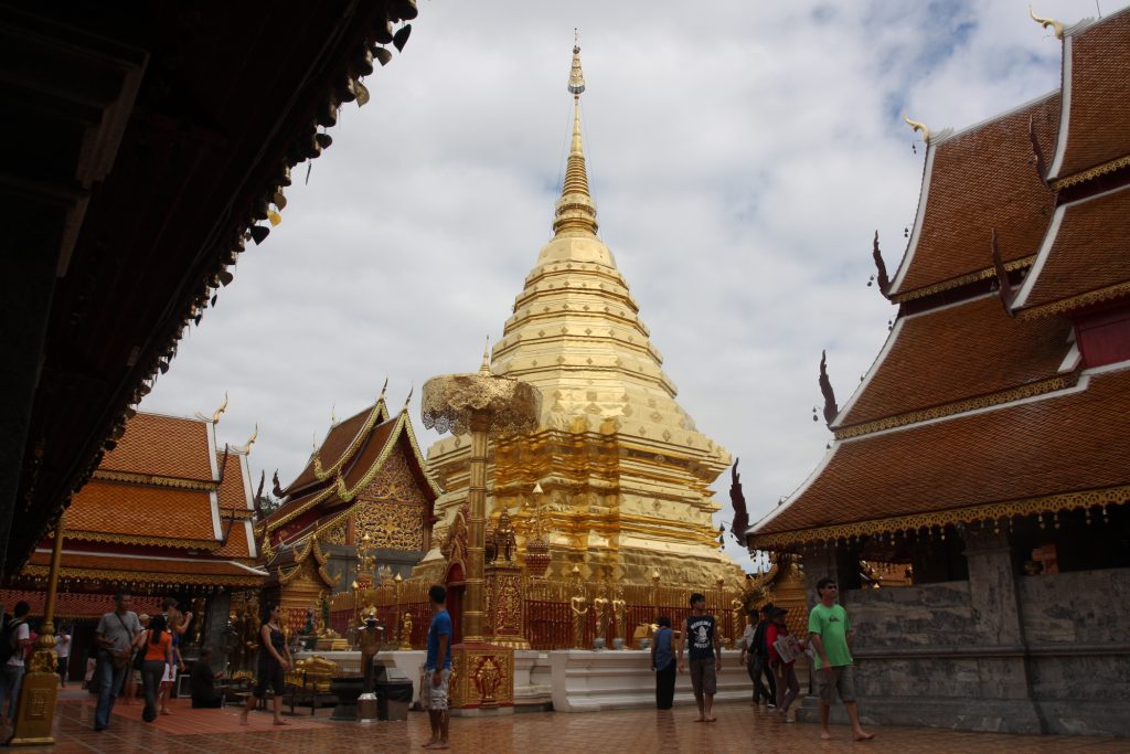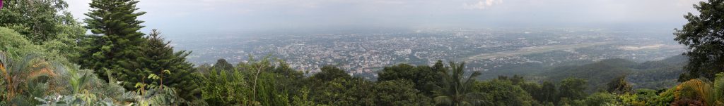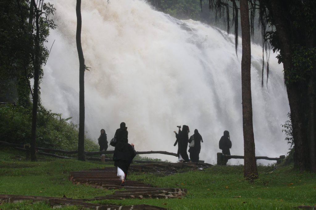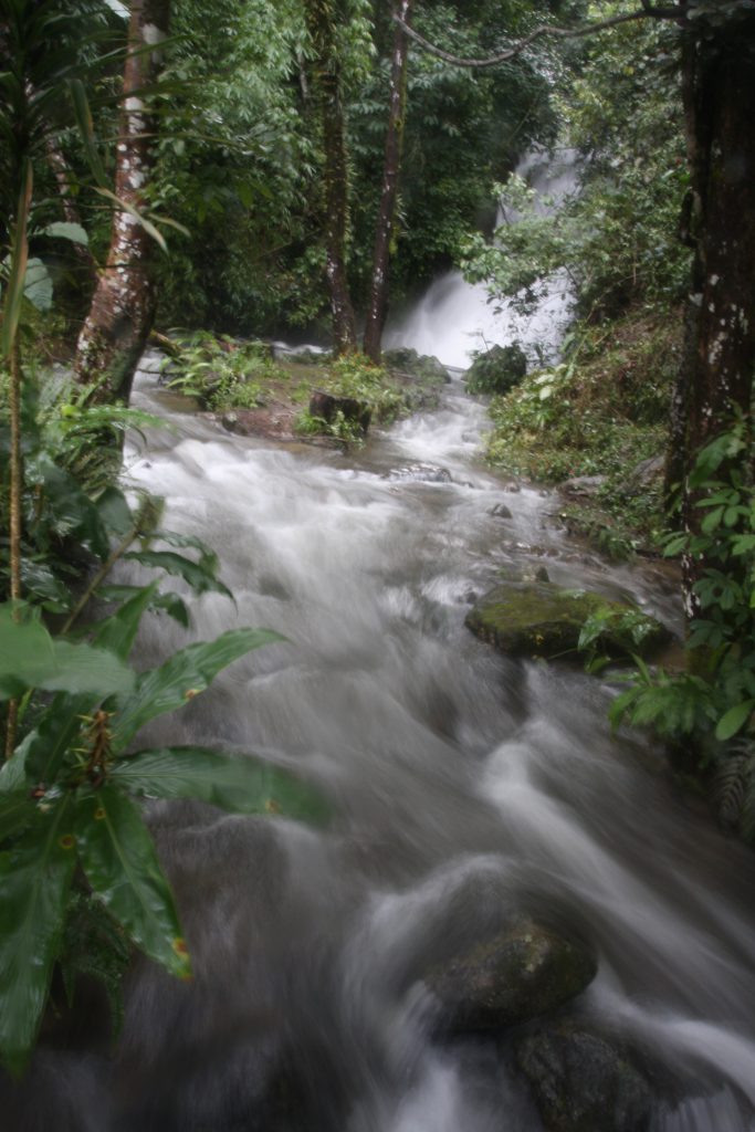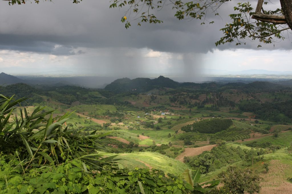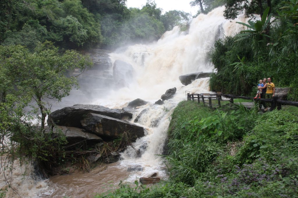 We banen ons een weg door de bergen. Hoe hoger hoe minder water, maar dat betekent niet minder problemen. De vele regen leidt tot nog meer aardverschuivingen. We bekijken onderweg nog wat watervallen die nu eruit zien als stuwmeer doorbraken en besluiten dat dit de dag is om nog hoger te gaan. We hebben geen speciale uitrusting bij ons, maar soms doe je wel eens wat instinctief. Met de auto kunnen we tot het basecamp komen van de Doi Inthanon. We trekken de riemen van onze slippers aan, Simeon doet de enige trui aan die we nog bij ons hebben, en we gaan verder. Buiten de auto is het nu kouder dan in de auto met airco, dus het is even wennen. We zetten de ene voet voor de andere en doen voorzichtig aan, we zitten niet alleen hoog, maar het is nog gevaarlijk glad ook. Na 10 stappen zien we de aankondiging hoe ver we nog moeten, we zijn ongeveer halverwege en 10 meter later staan we op de top van de 25.653.341 micrometer hoge berg. Om later geen discussies te krijgen dat we de top niet gehaald hebben nemen we foto’s, en we beginnen met de afdaling, rijden naar Chiang mai, leveren de auto in en vertellen niet wat we allemaal met de auto hebben uitgespookt.