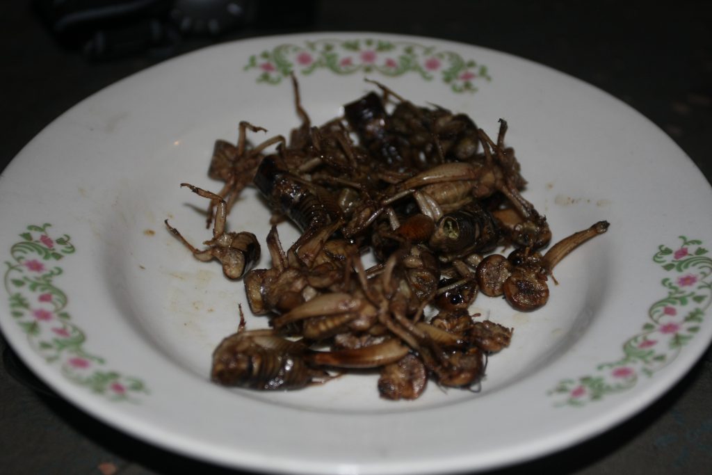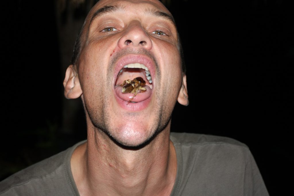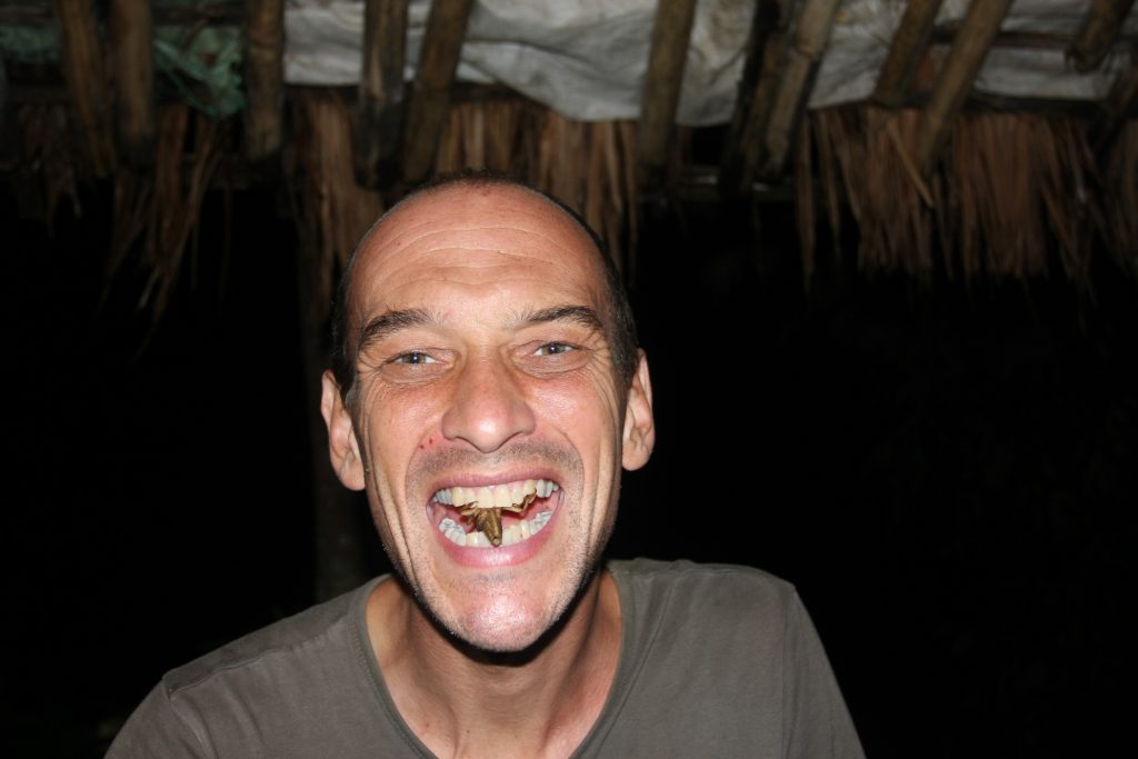 Midden in de rijstvelden wordt je gek van de krekels die zitten te tsjirpen, “en daar hebben ze het volgende op gevonden”. Zelfs na de 5e krekels moet Arjan nog de weerstand om een krekel te eten overwinnen, maar eigenlijk smaken ze best lekker. Geheel ontdaan van alle poten en andere uitsteeksels krijgt Els bijna een verpakte supermarkt krekel voorgeschoteld, maar na een klein hapje wordt die poging ook gestaakt. De meelwormen hebben een iets lagere drempel, en Els eet er daar een van op, net als Simeon die wel nog even vraagt wat het is; “Een chipje”.