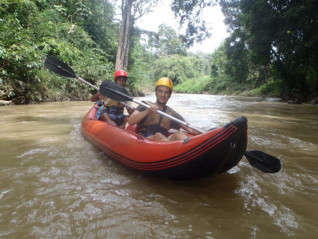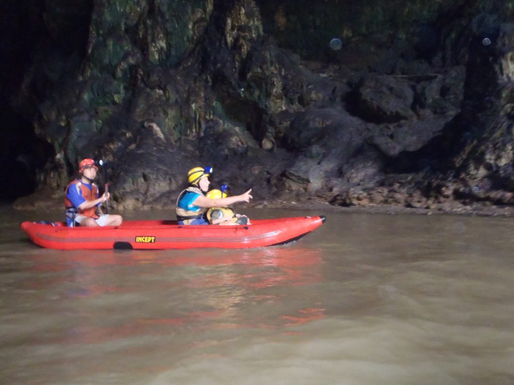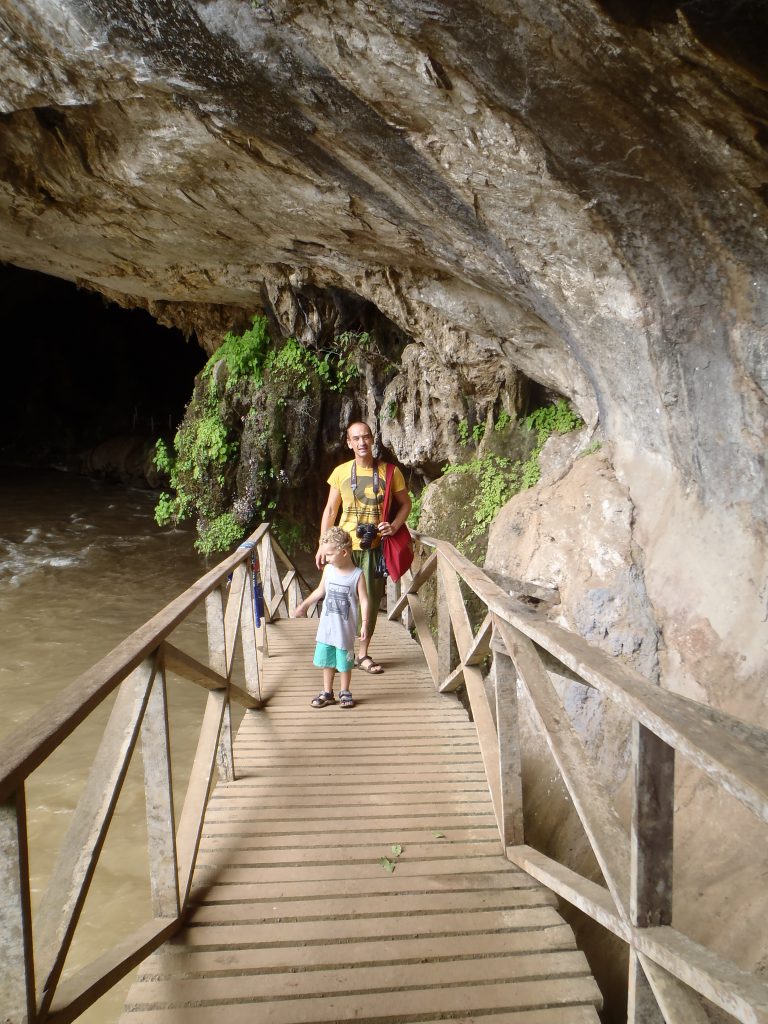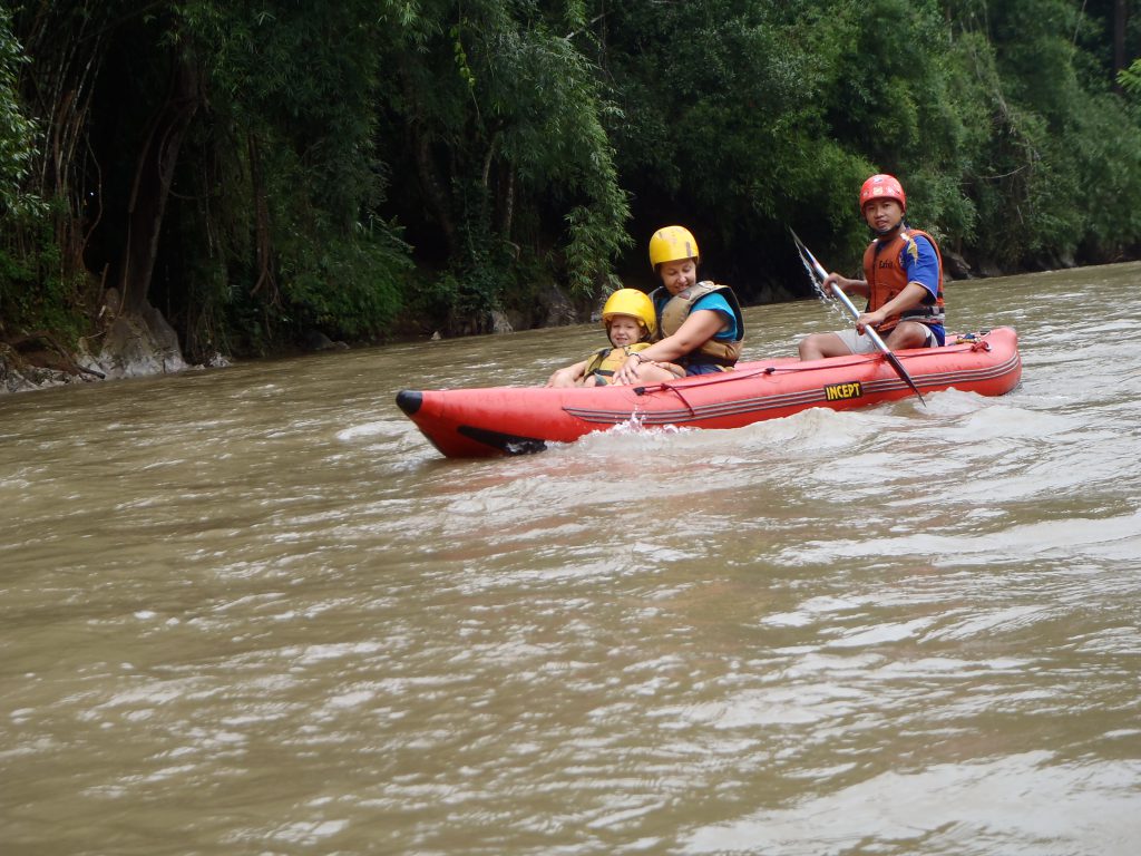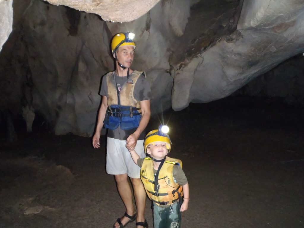 “Ik denk dat ik het heel leuk ga vinden” En hij vond het leuk. Vanuit de Cave Lodge bij Sopong gaan we met een kano over de rivier. Arjan met een gids, en Simeon en Els in een kano met een andere gids. Na een klein stukje gaan we aan de kant om hoofdlampen op onze helmen te doen. We kanoen de grot in waar we gisteren wandelend naartoe zijn gegaan. We vonden deze grot gisteren al heel erg leuk. Toen gingen we met een vlot erin, en een vrouw die ons met een gaslamp rondleiden. Nu meren we aan de andere kant van de rivier aan en lopen door weer hele andere grotten. Vleermuizen hangen aan het plafond, en prachtige stalagmieten en tieten. We varen door de grot weer verder en komen een stuk verder weer de grot uit. We gaan weer aan land, en na wat klauteren komen we bij een nauwe spleet in de rots. We passen precies naar binnen, en deze spleet lijkt meer gemaakt voor Simeon dan voor ons. De Thaien zien overal in de grotten beesten in. Dit is een drieslurfige olifant, dit is een krokodil. Ook Simeon krijgt de smaak te pakken en herkend heel duidelijk “Dit is het achtereind van een kip, daar waar de eieren uitkomen”. In de grot moeten we soms over de grond kruipen om van de ene hal naar de andere te komen. Helemaal smerig komen we uit de grot en gaan we weer verder in de kano’s. Simeon zit voorin de boot met een grote grijns op zijn gezicht. Als er even geen stroomversnelling is en hij niet nat wordt roept ie “Dit zijn hele saaie golven” want het liefst krijgt hij de volle laag in de grootste golven. Na 3 uur zitten we weer doodop in het guesthouse en rijden we door prachtige natuur en prachtige uitzichtpunten naar Mae Hong Son.