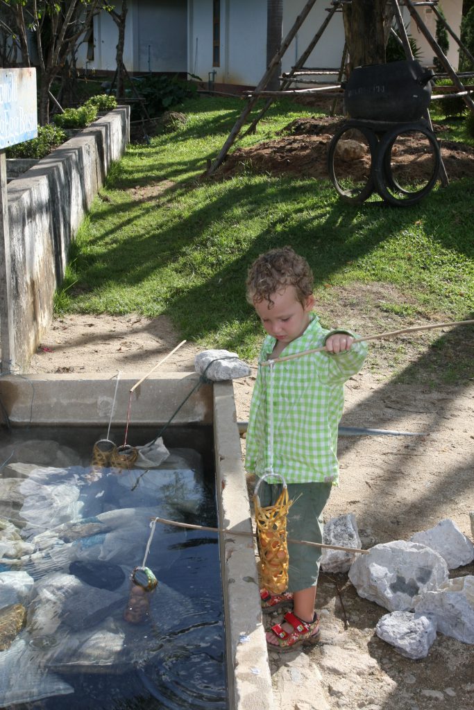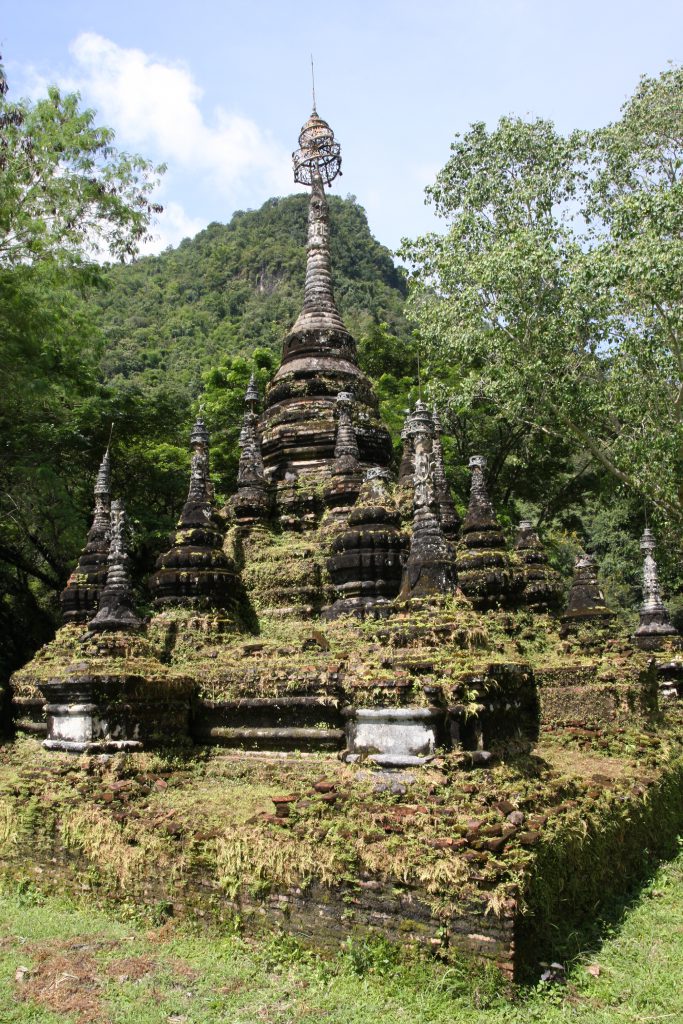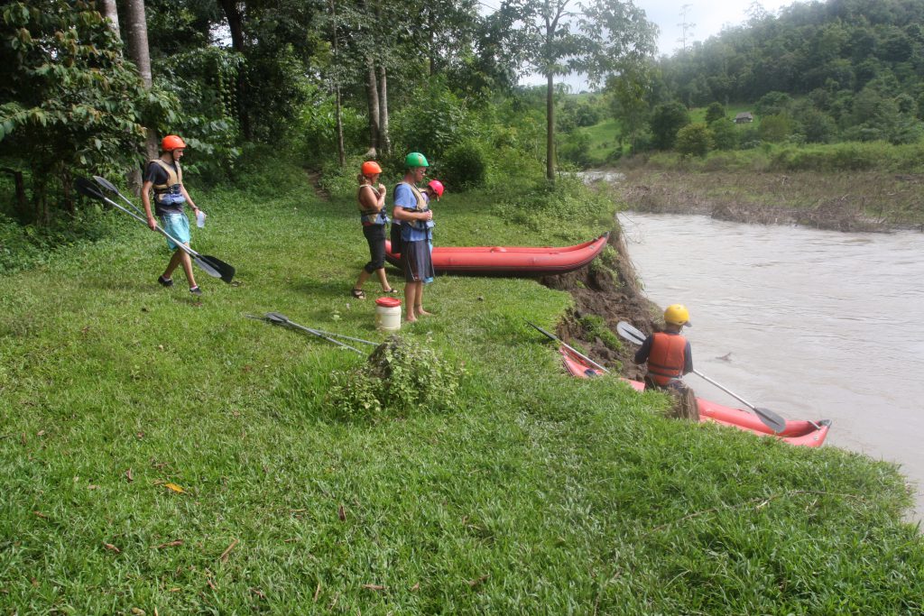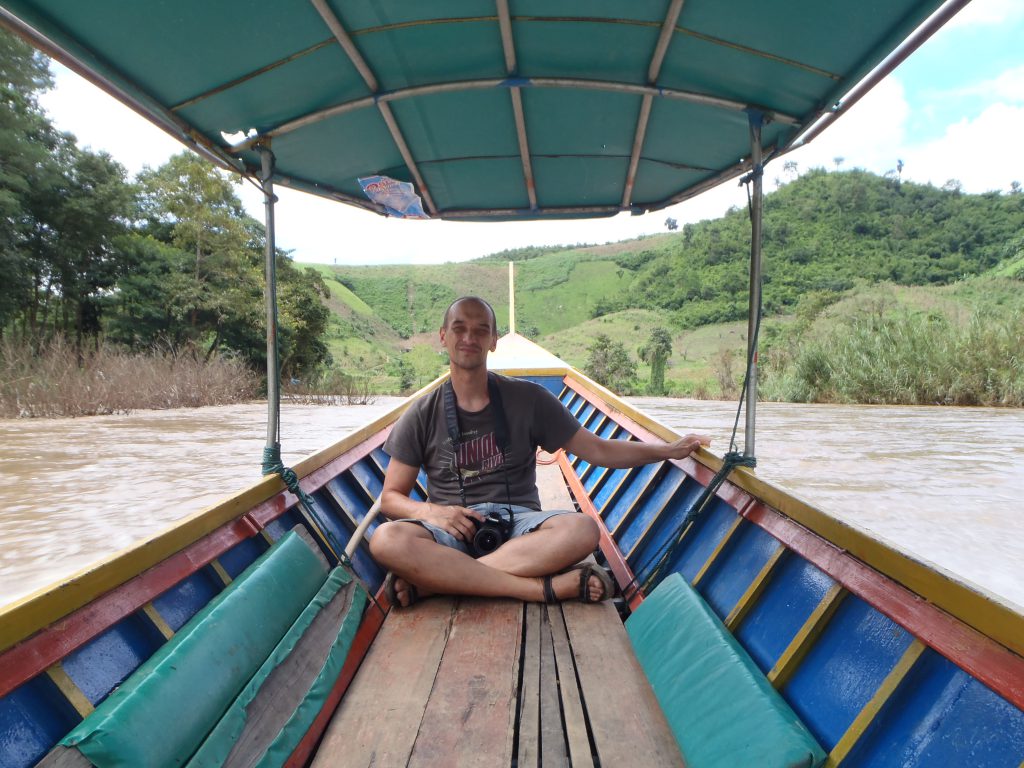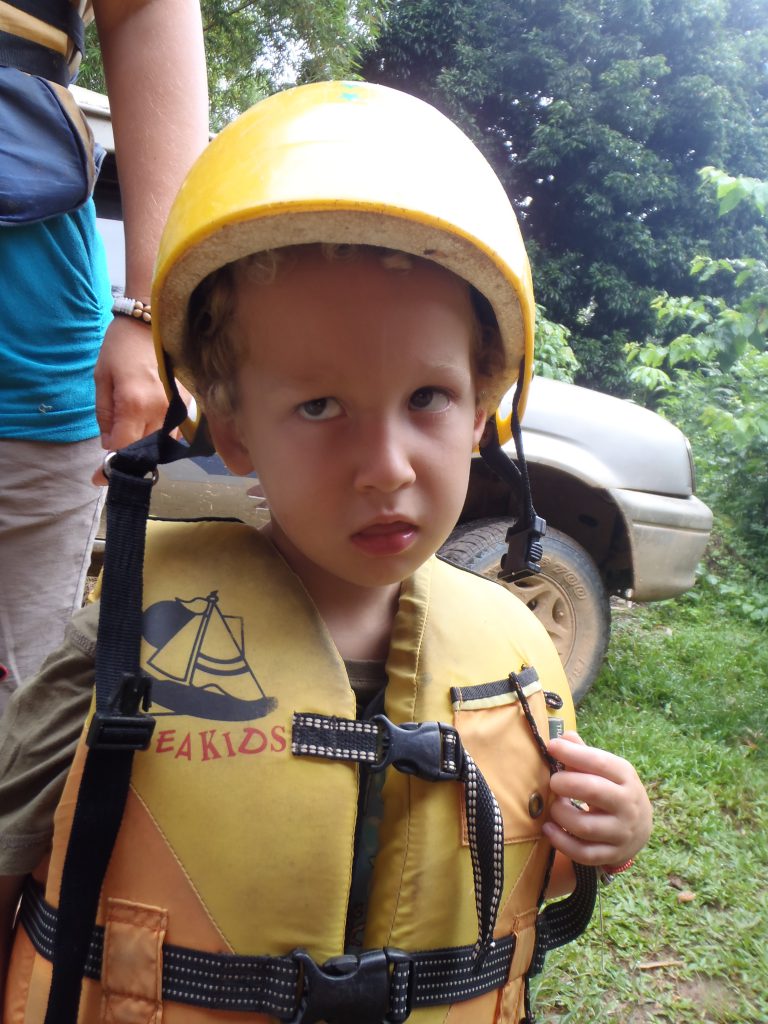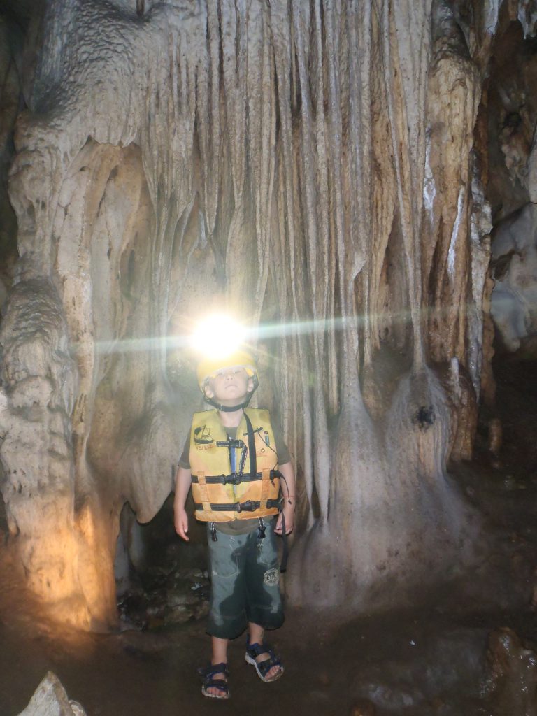 “Ik denk dat ik het heel leuk ga vinden” En hij vond het leuk. Vanuit de Cave Lodge bij Sopong gaan we met een kano over de rivier. Arjan met een gids, en Simeon en Els in een kano met een andere gids. Na een klein stukje gaan we aan de kant om hoofdlampen op onze helmen te doen. We kanoen de grot in waar we gisteren wandelend naartoe zijn gegaan. We vonden deze grot gisteren al heel erg leuk. Toen gingen we met een vlot erin, en een vrouw die ons met een gaslamp rondleiden. Nu meren we aan de andere kant van de rivier aan en lopen door weer hele andere grotten. Vleermuizen hangen aan het plafond, en prachtige stalagmieten en tieten. We varen door de grot weer verder en komen een stuk verder weer de grot uit. We gaan weer aan land, en na wat klauteren komen we bij een nauwe spleet in de rots. We passen precies naar binnen, en deze spleet lijkt meer gemaakt voor Simeon dan voor ons. De Thaien zien overal in de grotten beesten in. Dit is een drieslurfige olifant, dit is een krokodil. Ook Simeon krijgt de smaak te pakken en herkend heel duidelijk “Dit is het achtereind van een kip, daar waar de eieren uitkomen”. In de grot moeten we soms over de grond kruipen om van de ene hal naar de andere te komen. Helemaal smerig komen we uit de grot en gaan we weer verder in de kano’s. Simeon zit voorin de boot met een grote grijns op zijn gezicht. Als er even geen stroomversnelling is en hij niet nat wordt roept ie “Dit zijn hele saaie golven” want het liefst krijgt hij de volle laag in de grootste golven. Na 3 uur zitten we weer doodop in het guesthouse en rijden we door prachtige natuur en prachtige uitzichtpunten naar Mae Hong Son.