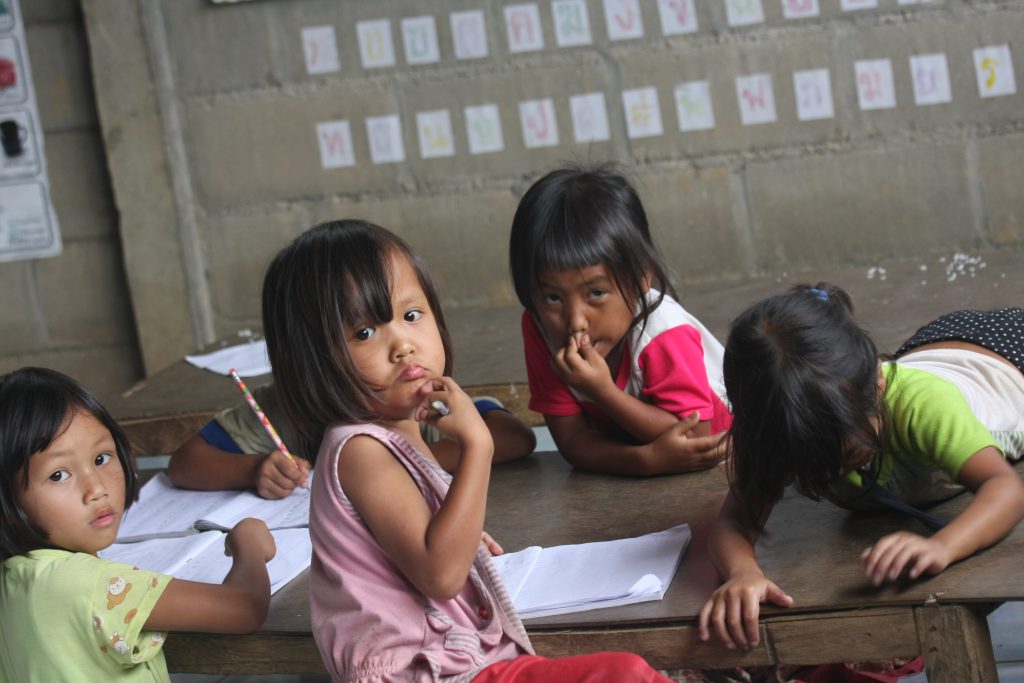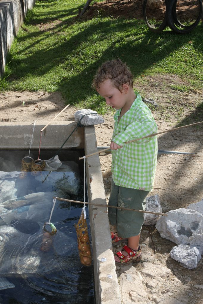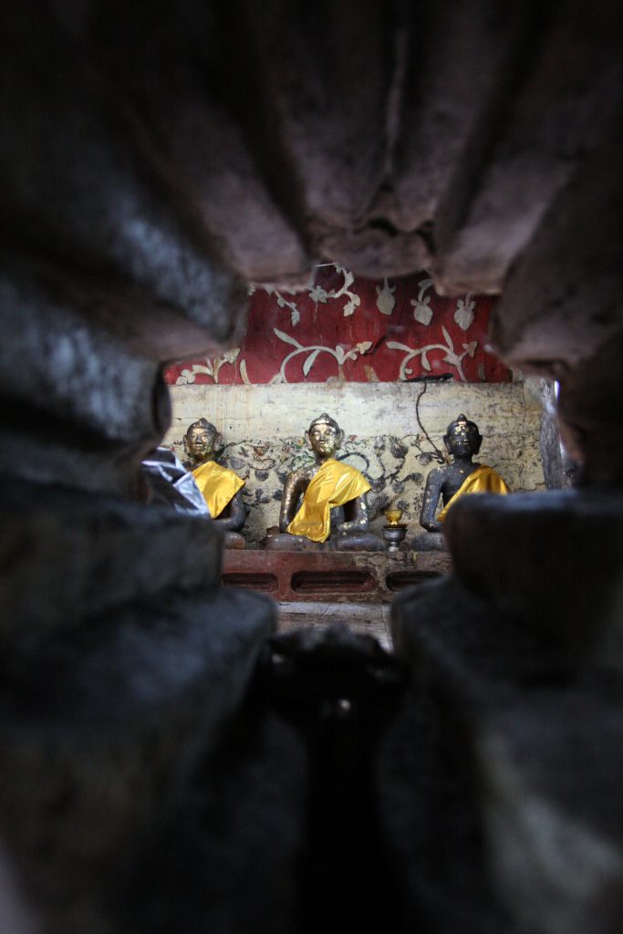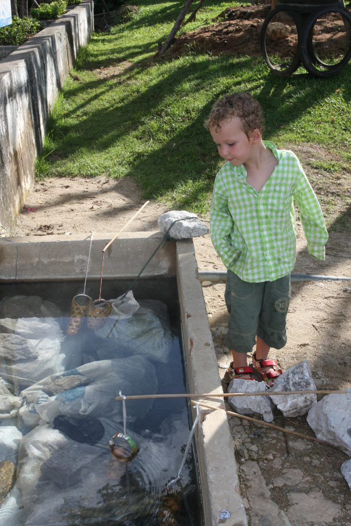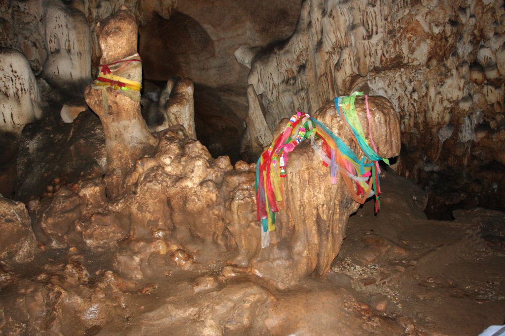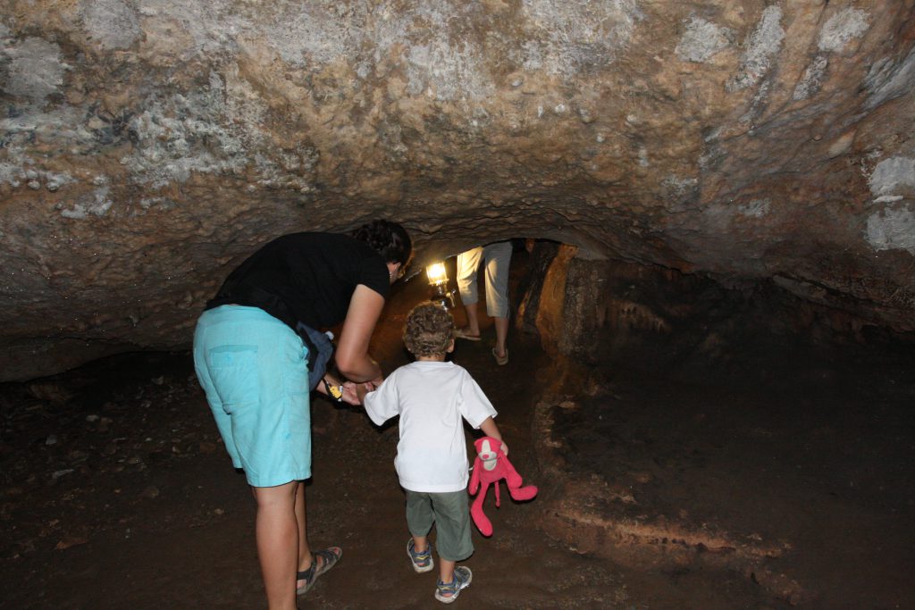 “Ik denk dat ik het heel leuk ga vinden” En hij vond het leuk. Vanuit de Cave Lodge bij Sopong gaan we met een kano over de rivier. Arjan met een gids, en Simeon en Els in een kano met een andere gids. Na een klein stukje gaan we aan de kant om hoofdlampen op onze helmen te doen. We kanoen de grot in waar we gisteren wandelend naartoe zijn gegaan. We vonden deze grot gisteren al heel erg leuk. Toen gingen we met een vlot erin, en een vrouw die ons met een gaslamp rondleiden. Nu meren we aan de andere kant van de rivier aan en lopen door weer hele andere grotten. Vleermuizen hangen aan het plafond, en prachtige stalagmieten en tieten. We varen door de grot weer verder en komen een stuk verder weer de grot uit. We gaan weer aan land, en na wat klauteren komen we bij een nauwe spleet in de rots. We passen precies naar binnen, en deze spleet lijkt meer gemaakt voor Simeon dan voor ons. De Thaien zien overal in de grotten beesten in. Dit is een drieslurfige olifant, dit is een krokodil. Ook Simeon krijgt de smaak te pakken en herkend heel duidelijk “Dit is het achtereind van een kip, daar waar de eieren uitkomen”. In de grot moeten we soms over de grond kruipen om van de ene hal naar de andere te komen. Helemaal smerig komen we uit de grot en gaan we weer verder in de kano’s. Simeon zit voorin de boot met een grote grijns op zijn gezicht. Als er even geen stroomversnelling is en hij niet nat wordt roept ie “Dit zijn hele saaie golven” want het liefst krijgt hij de volle laag in de grootste golven. Na 3 uur zitten we weer doodop in het guesthouse en rijden we door prachtige natuur en prachtige uitzichtpunten naar Mae Hong Son.