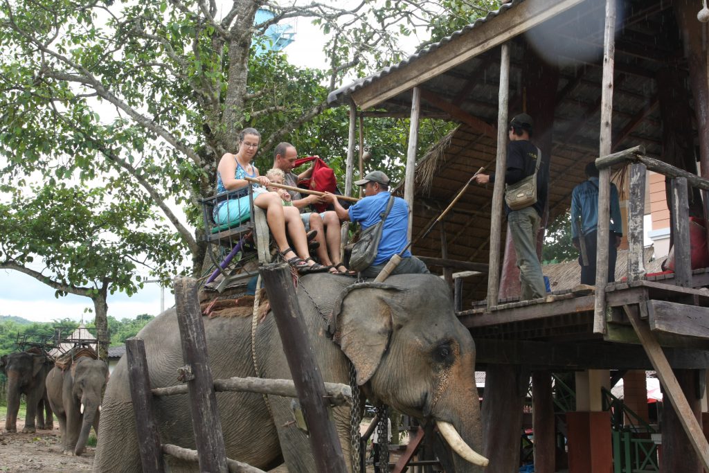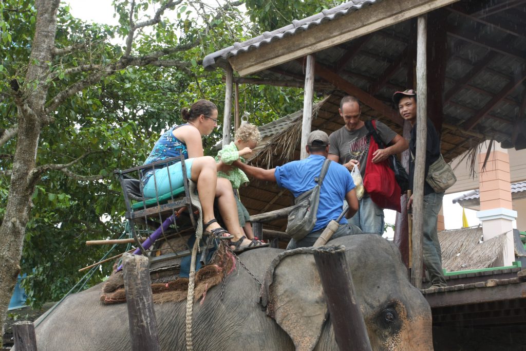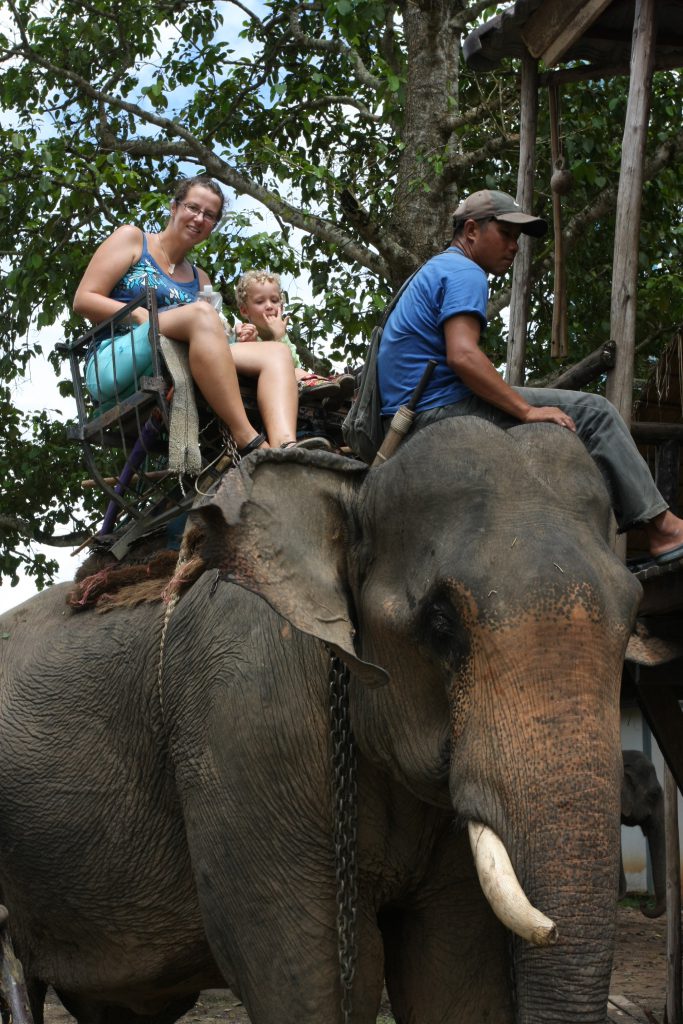 Prachtige uitzicht vanuit onze privé veranda over de rijstvelden. Het hotel bestaat pas 3 maanden, en toevallig kwam Els het tegen op internet. De eerste twee dagen doen we niet zoveel. We zijn nog moe van de reis, en als we net weer genoeg energie hebben, komt er weer een regenbui. Een klein stukje verderop lopen we naar het dorp toe, maar als we bij de rand van het dorp zijn, staat de eerste hond ons alweer op te wachten. Hier in de bergen worden de honden gebruikt voor de jacht en er zijn niet zoveel zwerfhonden, maar iedere hond is angstaanjagend voor Els, en ze keert gelijk weer om. Verdere wandeltochten in de omgeving worden gelijk al afgeblazen als Els ziet dat het door een dorp loopt. Els haar wonden zijn dicht, maar de angst nog is nog lang niet weg. Als je geen trek kan maken, kan je je ook naar de leuke plekken met een auto laten brengen. In de buurt zit een Olifanten-kamp waar we ons op een Olifant laten rondrijden. Na 5 minuten heeft Simeon het wel weer gezien op de Olifant, en als verrassing hebben we in plaats van een half uur een tocht van een uur uitgekozen. Na de olifanten op een boot naar een dorp, en vandaar weer verder met de boot naar een hotspring, en zo hebben we een privé toertje. De eieren die we in een netje kopen gaan in een speciaal badje, en wij gaan met z n drieen in een privé hokje waar we de watertemperatuur zelf kunnen regelen om niet geheel gekookt eruit te komen.