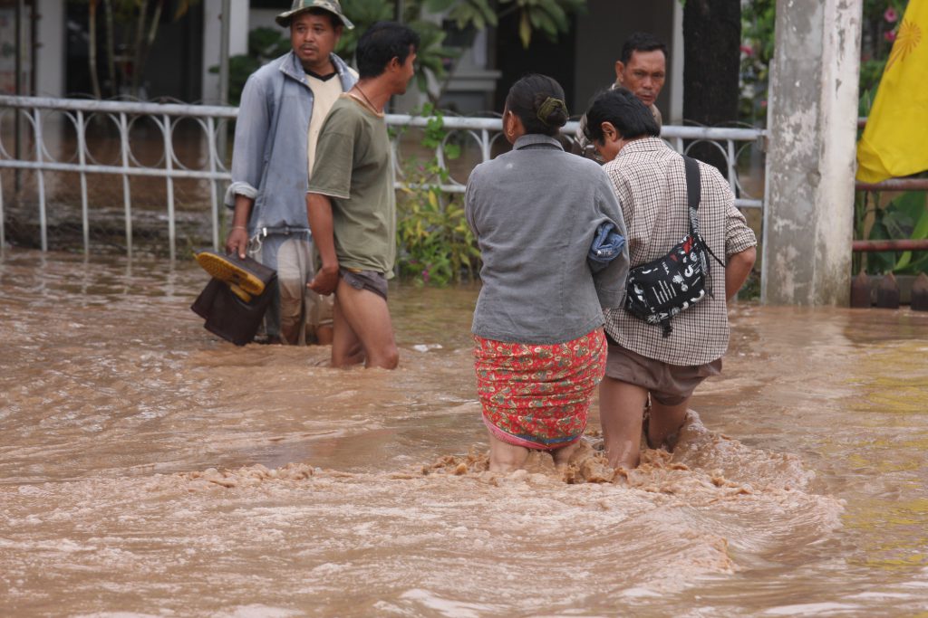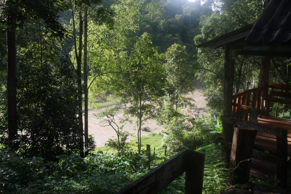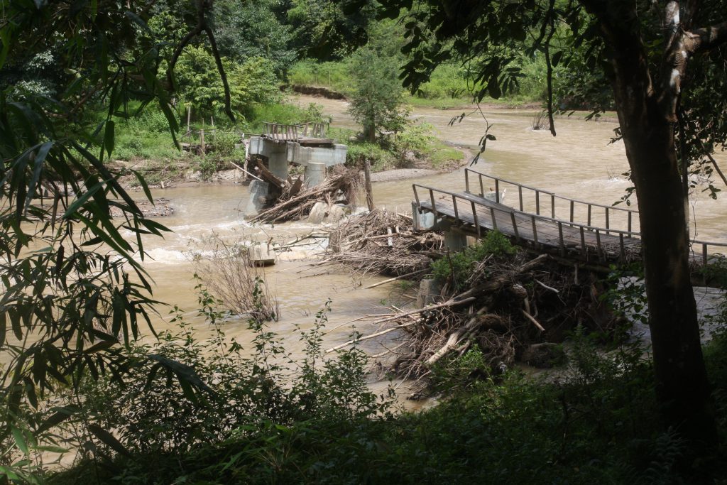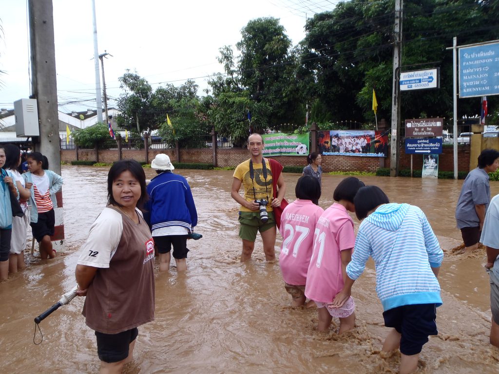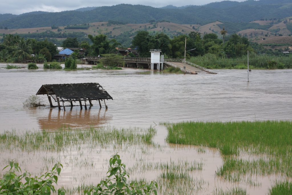 Er valt niets te zien van de prachtige omgeving om Mae Hong Son, alles is gehuld in een dikke mist, het heeft dan ook geen zin om nog hoger te gaan voor de uitzichten over Birma. Het is een treurige dag om te rijden, en na een middelmatig avondeten gaan we slapen. Na de mist is het gisteren gaan regenen, en regenen, en gieten daarna wat regen en toen gaan hozen. We rijden twee kilometer terug om in het dorp wat te gaan eten. Een hotel kies je meestal bij toeval. We rijden wat, zien een hotel maar remmen te laat en denken, we nemen het volgende hotel wel. Bij terugkomst in het dorp zien we hoeveel geluk we door het missen van het hotel hebben gehad. De weg waar we gisteren nog over hebben gereden is onderdeel geworden van de rivier, en ligt een meter onder het stromende water. Met de auto is er geen doorkomen aan. Als we aan de andere kant hadden gestaan was het alternatief geweest om om te rijden, om daar tot de conclusie te komen dat dat ook overstroomd was en dat we helemaal terug zouden moeten rijden. Het zijn de ergste overstromingen sinds jaren, en we mengen ons tussen de andere ramptoeristen.