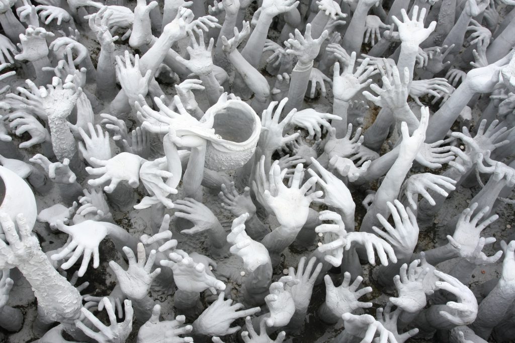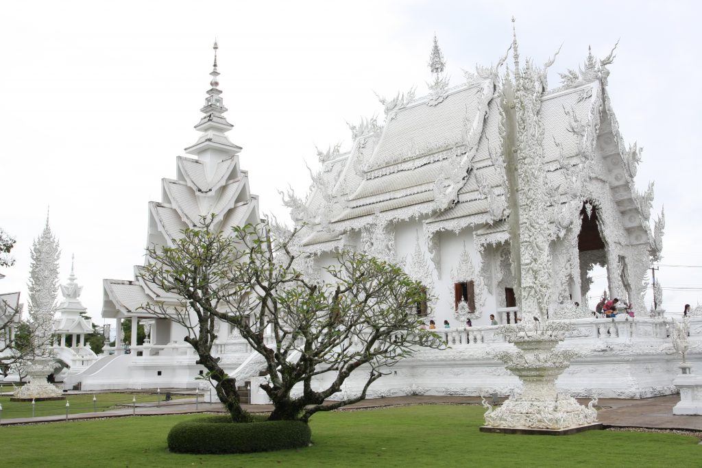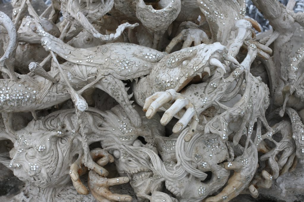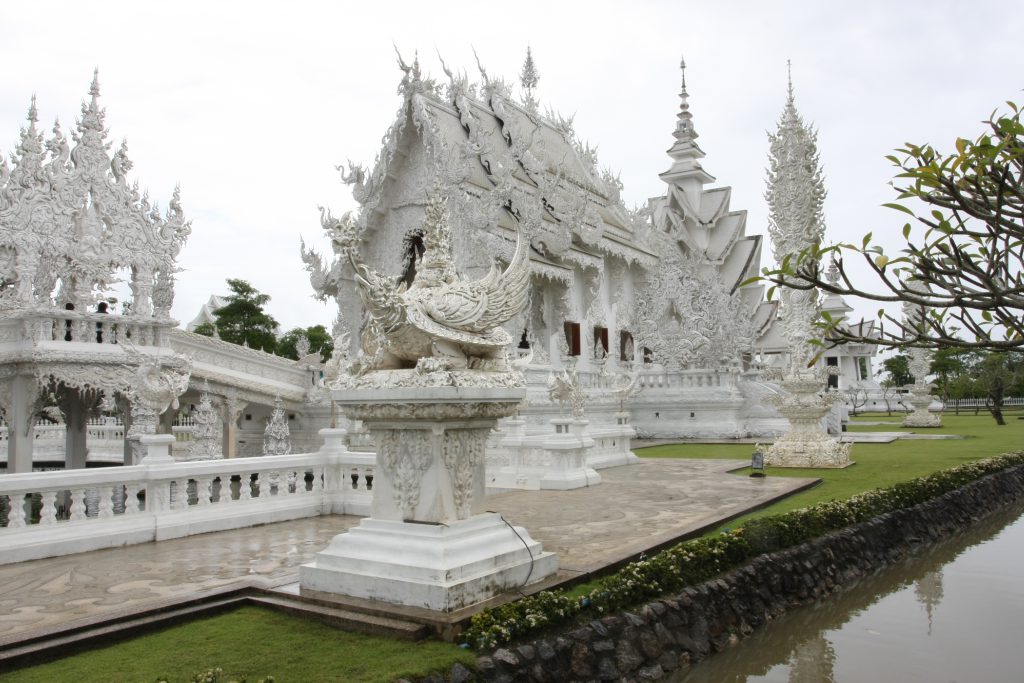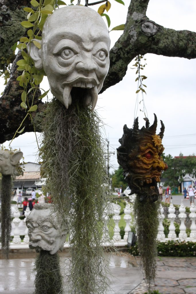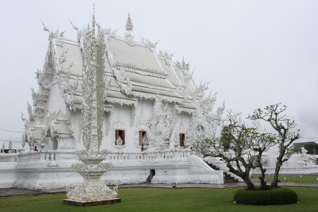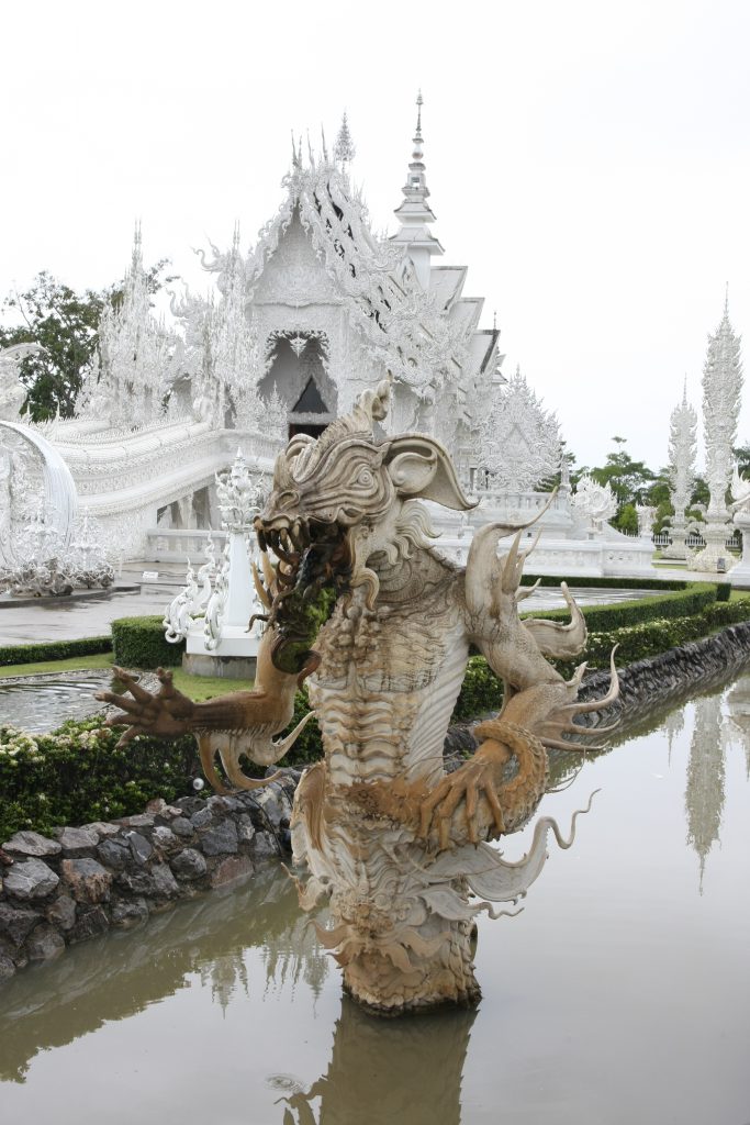 Terug in Chiang Rai besluiten we dat we de komende 10 dagen verder gaan met een huurauto. Eerst via de zeer bijzondere Witte Rong Khun tempel die totaal anders in dan de andere tempels IN Thailand. Is dit boeddhisme 21ste eeuw, in ieder geval worden de thema’s van de 21ste eeuw aangehaald. Het is ook een erg toeristische trekpleister, en daarom zijn er veel controleurs die controleren of iedereen zedelijk gekleed is en met commentaar wordt iedereen aangespoord om door te lopen. Over de brug met eronder naar hulp grijpende handen en dan de hoofdtempel in. De kunstenaar is de zijmuur aan het schilderen want het complex is nog niet af. De hoofd boeddha is geschilderd, en op de muur er tegen over wordt al het kwaad afgebeeld. De twin touwers op het moment dat het tweede vliegtuig invliegt, ernaast Freddy Kreuger, maar ook minder verwerpelijke figuren als KongFu panda, Neo en Micheal Jackson.
