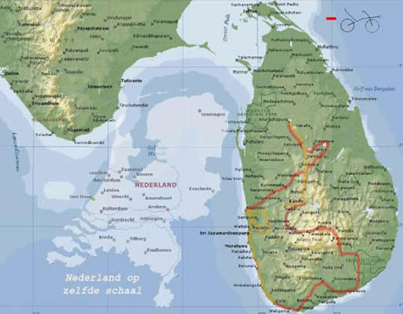 Om 06:30 vertrekken we bij de eerste zonnestralen. De wegen zijn nog uitgestorven, en het belangrijkste is dat het nog koel is. De mensen van de hotels zijn meestal al wakker, want ze willen het wegrijden van die vreemde fietsen niet missen. Iemand vraagt: “Jullie rijden zeker nu naar het noorden, alle fietsende Nederlanders gaan via die route”. Nee? We gaan nu naar het oosten, van Negombo naar Kurunegala en dan naar Polonnaruwa. Maar hebben jullie dan geen routeboekje? Routeboekje? Waar zouden we een routeboekje van moeten hebben. We hebben zelf een route bedacht. Op de GPS hebben we de grootste steden staan, zodat we de hemelsbrede richting weten waar we naartoe moeten rijden. Op onze Duitse “Reise Know how” kaart staan de meeste doorlopende wegen. Thuis een precieze planning maken is altijd moeilijk. De wegen zijn op de kaart zijn opgedeeld in rode, gele, witte en grijze wegen maar wat dat inhoudt blijft altijd de vraag. Het is van groot naar klein, maar wat is de kwaliteit? Hoe druk zijn de wegen? We hebben al snel door dat we de rode wegen moeten vermijden. Dit zijn de snelste, nieuwste maar ook de drukste wegen. Als we de weg vragen worden we altijd naar deze wegen verwezen, als is het kilometers verder. Wie wil nou over die kleine weggetjes rijden? Het is nog best te doen om hier te rijden, maar leuk is het niet. Bussen en vrachtwagens maken hier een oorverdovend geluid, en het is te druk om naast elkaar te rijden. De gele weggetjes zijn al veel leuker, hier kunnen we al genieten wat er om ons heen gebeurt. Behalve de grijze wegen, en de wegen die niet op de kaart staan zijn ze verder allemaal geasfalteerd. Ze zijn meestal ook in goede staat, maar hoe provincialer het weggetje des te meer putten, en scheuren in de weg zitten. De niet asfaltwegen zijn rode aarden wegen die tijdens de droge periode rijden als asfalt.