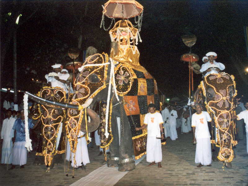 Meer dan 40 olifanten zitten in de parade, de ene nog mooier uitgedost dan de andere. Bij sommige olifanten gaat de mensen massa opeens staan, en worden de handen in gebed bijeengebracht. Op de rug van de olifant zit een bakje met daarin een belangrijke god. Sommige olifanten hebben een grote accu om hun nek hangen, bij andere lopen drie mannen er achterna die een generator voortduwen om de vele lampjes te laten branden. Om half twee is de stoet afgelopen, en kunnen we naar huis. Gelukkig kunnen we meerijden zodat we om half vier ’s nachts eindelijk in ons hotel kunnen inchecken.