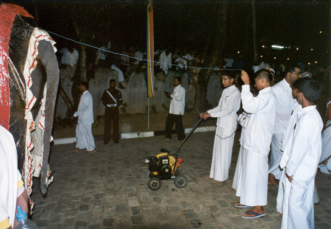 We kunnen met de accountant van het hotel meeliften, en met veel zorg zet hij ons halverwege op een bus naar Kelaniya. Als we 3 kilometer van de tempel uit de bus gaan twijfelen we nog steeds of vandaag wel echt de dag is dat het festival is. We zien nog niets dat op een groot festival lijkt, en we zijn al zo moe van heel de dag reizen. Hoe dichter we bij de Raja Maha Vihara tempel komen, hoe meer volk er op de been is, en bij de tempel is het een gekkenhuis. Na de tempel van de tand in Kandy is dit de meest bezochte tempel in Sri Lanka. Morgen is het precies de dag dat boeddha hier predikte, zo’n 2500 jaar geleden. En vandaag is het tijd voor een feestje. We hebben nog even de tijd, want de parade start pas om 23:00, dus we gaan eerst naar de dagoba. Deze dagoba is vreemd genoeg hol, en vanavond hangt hij vol lampjes. Dit is de derde dag van het festival, en een hoop mensen zien er erg vermoeid uit. Ze slapen al 3 nachten op het gras bij de tempel. Wij zitten opeens weer vol energie, want wat we nu allemaal zien doet ons hart sneller kloppen. De mahoets zijn hun olifanten aan het klaarmaken voor de parade, en het ziet er fantastisch uit.