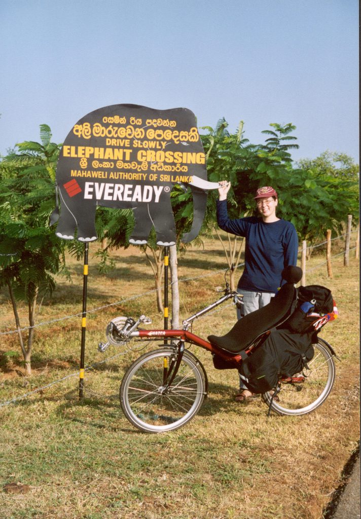 Dit is niet het enige waarover iedereen zich verwondert als ze onze ligfietsen in Sri Lanka zien. Auto’s, brommers, motoren, 3-wielers, vrachtwagens en bussen om ons heen gaan langzamer rijden als ze ons zien. In ongeloof wordt er naar ons gekeken. Minibusjes vol Singhalese toeristen halen ons langzaam in, stoppen vervolgens aan de kant, en als wij gepasseerd zijn worden we weer langzaam ingehaald. Soms hangen ze met een fototoestel uit het raam. Het gaat gelukkig altijd met een mooie glimlach. Dat al het verkeer langzamer gaat is een voordeel, maar soms blijven ze zo dicht langs ons rijden dat het gevaarlijk is. Op het laatste moment moeten ze uitwijken voor die aankomende bus, die ook zo dicht mogelijk bij ons wilt rijden.
