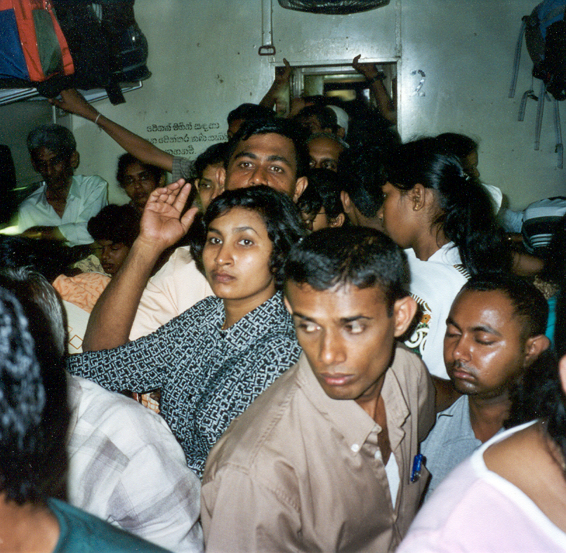 Van Kandy willen we de trein nemen naar de hoogste plaats Nuwara Eliya. We proberen al van te voren kaartjes te kopen, maar kunnen alleen op de dag zelf kaartjes kopen. Om 8:55 gaat de trein, mar om 6:20 kunnen we nog steeds geen kaartjes kopen. Er wordt ons verteld dat als de trein vertrekt uit Colombo pas kaartjes verkocht kunnen worden, want dan weten ze hoeveel kaartjes nog over zijn. Als we later in de trein zijn hebben we het idee dat er toch iets meer kaartjes verkocht zijn. We zijn wel de eerste, maar worden steeds zenuwachtiger, we willen nu eindelijk weg uit Kandy, en de trein lijkt ons de mooiste optie, en het handigst want de fietsen kunnen in een bagage wagon. Na wat zeuren, kunnen we al een 2e klas kaartje kopen, en kunnen we rustig wachten tot de trein komt. Als de kaartjes verder eindelijk verkocht worden, wordt het drukker en drukker op het perron. Nog steeds maken we ons niet zo druk, maar bespreken wel al een plekjes-vind-tactiek om de beste plaatsen te bemachtigen. Als de trein eindelijk na veel vertraging binnen is, zien we al mensen uit de trein hangen en niemand stapt uit de overvolle trein. Wij moeten daar nog met honderden bij. Hier is geen tactiek tegen opgewassen, er is maar een ding dat we kunnen doen, zorgen dat we aan boord komen. Onze fietsen worden over het perron naar de bijna lege bagage wagon gebracht, en wij staan op 1 been op het balkon omdat er geen ruimte is om die tweede neer te zetten. Wij staan tenminste nog binnen, buiten hangen aan iedere deur nog 4 mannen. We zien dat Donnella ook op het andere balkon binnen is, en de trein vertrekt. Bij het eerste station gaat er 1 uit, zodat we omstebeurt een extra teen op de grond kunnen zetten, we hoeven gelukkig nog maar 5 uur. Het wordt zwaarder en zwaarder, voor een kind wordt het iets te veel, en maakt wat ruimte in haar maag door te kotsen. We horen al 6 stations dat we nog 2 stations moeten, en geloven er niet meer zo in. We hebben deze trein genomen voor de prachtige uitzichten, maar zien alleen maar hoofden. Eindelijk mogen we uit de ramptrein. We drinken zalige thee en een paar Necto’s en moeten nog 9 kilometer verder bergop om eindelijk in Nuwara Eliya te komen. Helemaal kapot storten we in een hotel neer. Een hoop Singhalesen gaan naar deze plaats voor de koelte, maar als ze hier zijn beseffen ze dat het hier voor hun extreem koud is. Wij lopen rond in onze T-shirts bij een lekker 15˚C, maar zij hebben truien, jassen, mutsen en handschoenen en lopen nog steeds bibberend rond. Arjan sleutelt een dag aan de fietsen, en Els probeert na de treinrit weer op krachten te komen om verder door de bergen te fietsen.