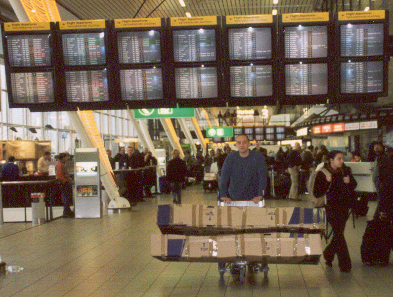 Nooit meer zullen we commentaar hebben op wat mensen aan zooi meenemen op vakantie. Samen hebben we maar 10 kg aan normale bagage, maar de ligfietsen zitten ieder in een hele grote doos van 2 bij 1 meter. Iedereen kijkt ons na, en dan hebben ze nog niet eens de ligfietsen gezien.