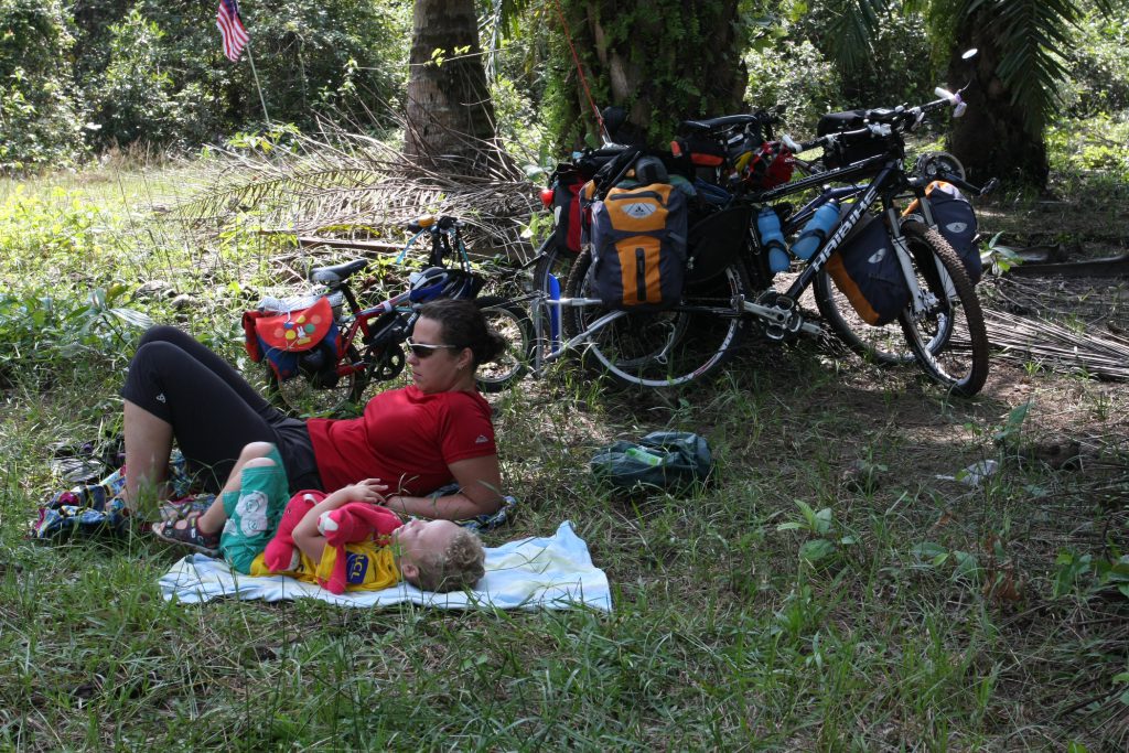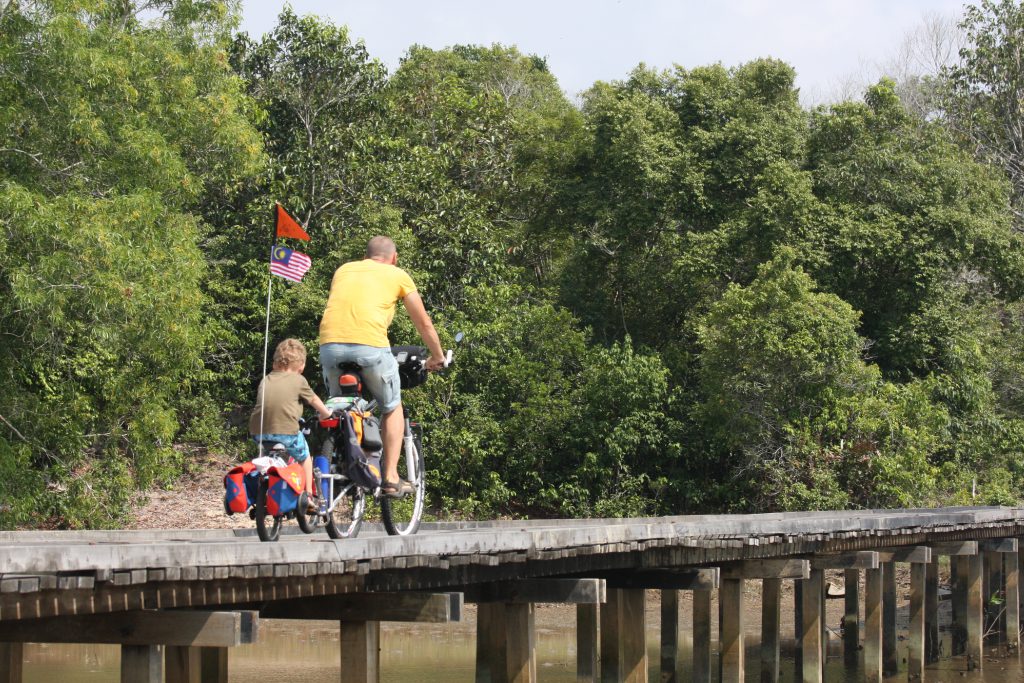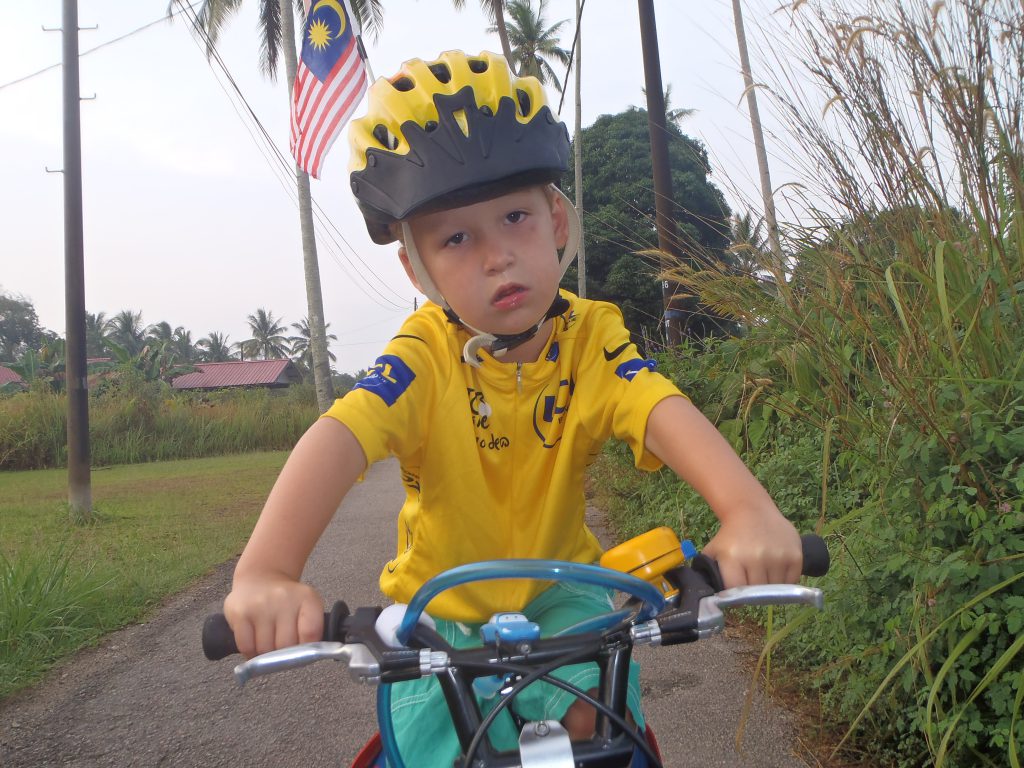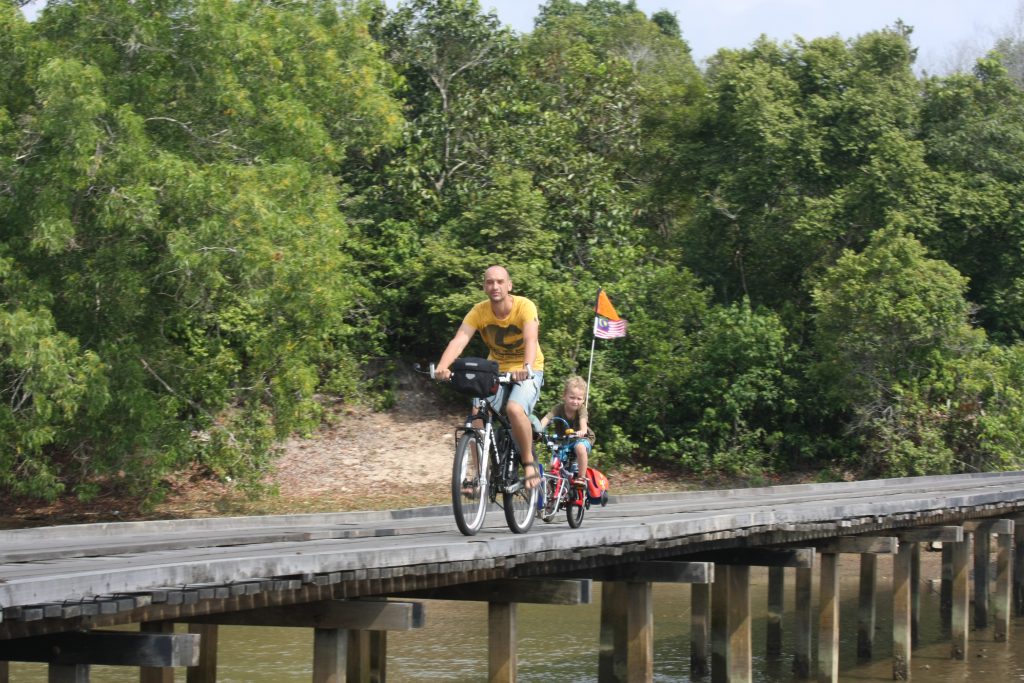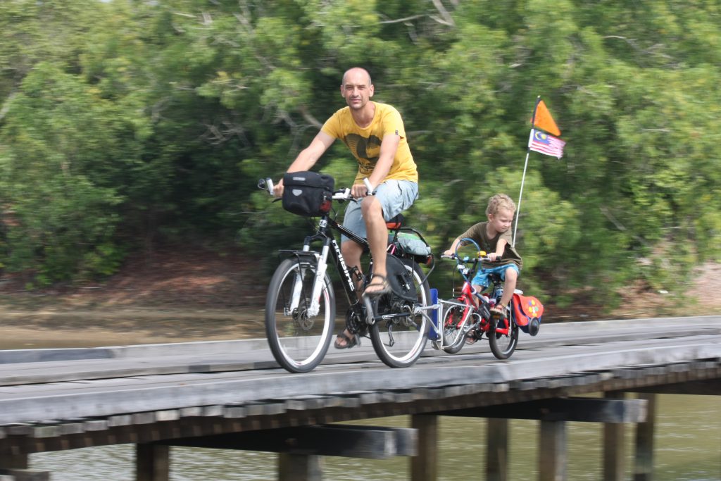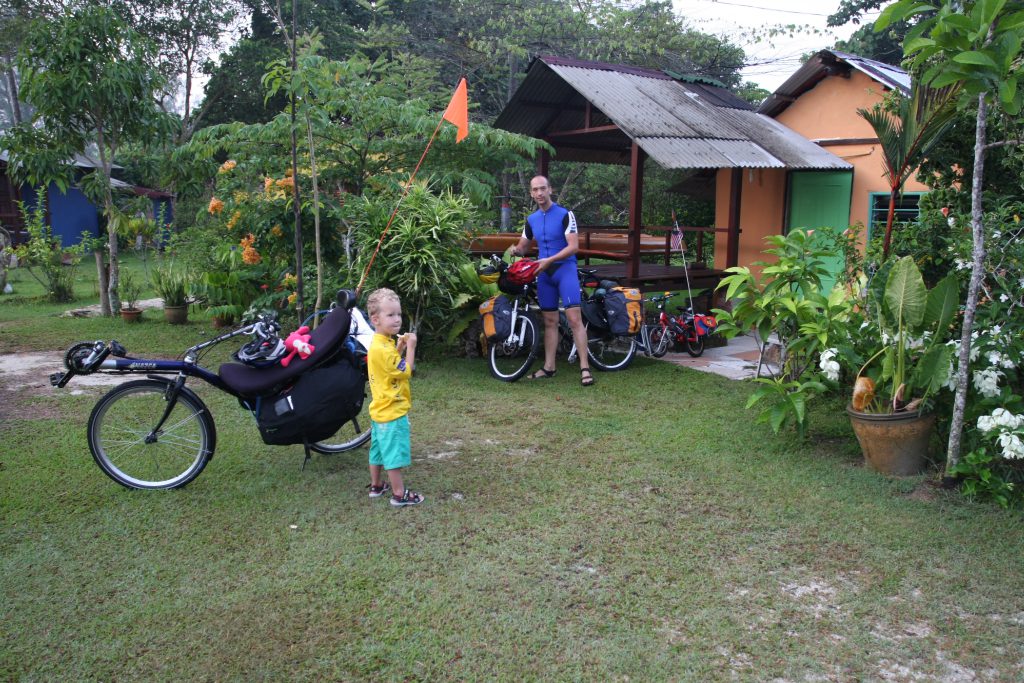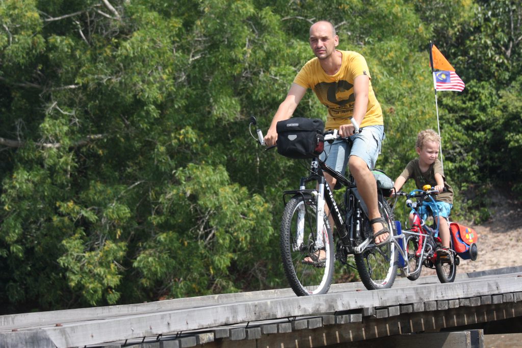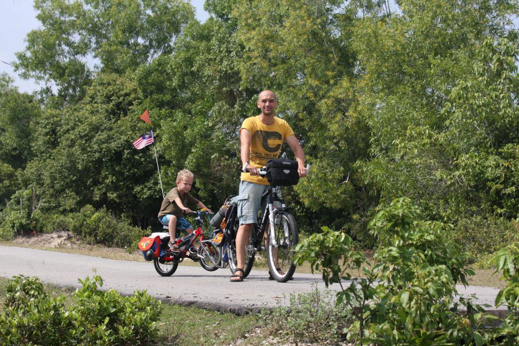 Nadat we nog maar een echte fietsdag hebben gehad, beginnen we nu met een herstart. We zitten nu aan de oostkant van Maleisië en als we alle verhalen mogen geloven is dit de rustige en mooie kant. We rijden naar het noorden over een weg door het oerwoud. Er is bijna geen verkeer, we rijden over smalle weggetjes door dorpjes en genieten want dit is wat we hoopten te vinden. De wegen staan nog steeds niet op de GPS-kaart, maar we kunnen wel zien waar we zijn ten opzichte van de zee en de grote wegen. Zo weten we dat we in ieder geval de goede kant uitgaan. Ieder dag gaat het beter met Simeon op de fiets. We hebben iedere dag een strak schema. De wekker gaat een half uur voor zonsopkomst. In een kwartier zijn we helemaal ingepakt. We zouden dan nog een kwartier hebben om te eten om dan in de koele ochtend op pad te kunnen. Het duurt alleen drie kwartier voordat we Simeon zo ver hebben dat hij zijn bed uit wil en op de fiets wil zitten. De fietsafstand is niet het probleem voor Simeon, maar de tijd dat hij op de fiets moet zitten. Als de zon feller wordt en het warm begint te worden beginnen de ogen dichter te raken, en wordt hij steeds slaperiger. Tijdens het fietsen heeft Simeon hele verhalen, en als de verhalen minder worden weten we dat we echt weer een nieuw hotel moeten gaan zoeken. Na de idyllische eerste dag rijden we over de wat drukkere autoweg 3. Door de drukte hebben we veel meer moeite om Simeon goed te verstaan en we moeten daarom ook regelmatig vragen of hij het even later nog eens wil vertellen. We proberen hem lekker actief te houden door te vertellen dat hij goed mee moet trappen. En we zijn met hem op zoek gaan naar de apen die we langs de weg kunnen zien spelen. Simeon heeft ook zijn dingen om Arjan goed bezig te houden. “3….2…..3…. Hobbelweg” hoort Arjan achter zich roepen, en dan moet hij van Simeon naast de weg gaan rijden rijden over de kiezels en de gaten in de droge aarde. Volgens Simeon gaan het daar veel sneller, maar dat lijkt alleen zo door het gehobbel. Ook is Simeon een goede trainer voor het komende wielerseizoen. “3..3..4.. Hard rijden” en even later “3..3..0.. Zacht rijden” zo worden de interval trainingen gedaan. Als Els maar even voor Simeon rijdt moet er gelijk harder door Arjan gereden worden zodat zij dan weer op kop rijden. Aan het einde van de rit houden we Simeon alert door hem te laten zoeken naar speeltuinen of naar de volgende plek waar ze ijsjes verkopen. Meestal zijn we voor twaalven in het volgende hotel. Dan hebben we lekker de tijd om te gaan eten, en staan al onze spullen droog voor de eventuele middag stortregens. Alhoewel de afstanden niet heel lang zijn is het fietsen is best inspannend doordat we constant met Simeon bezig zijn.