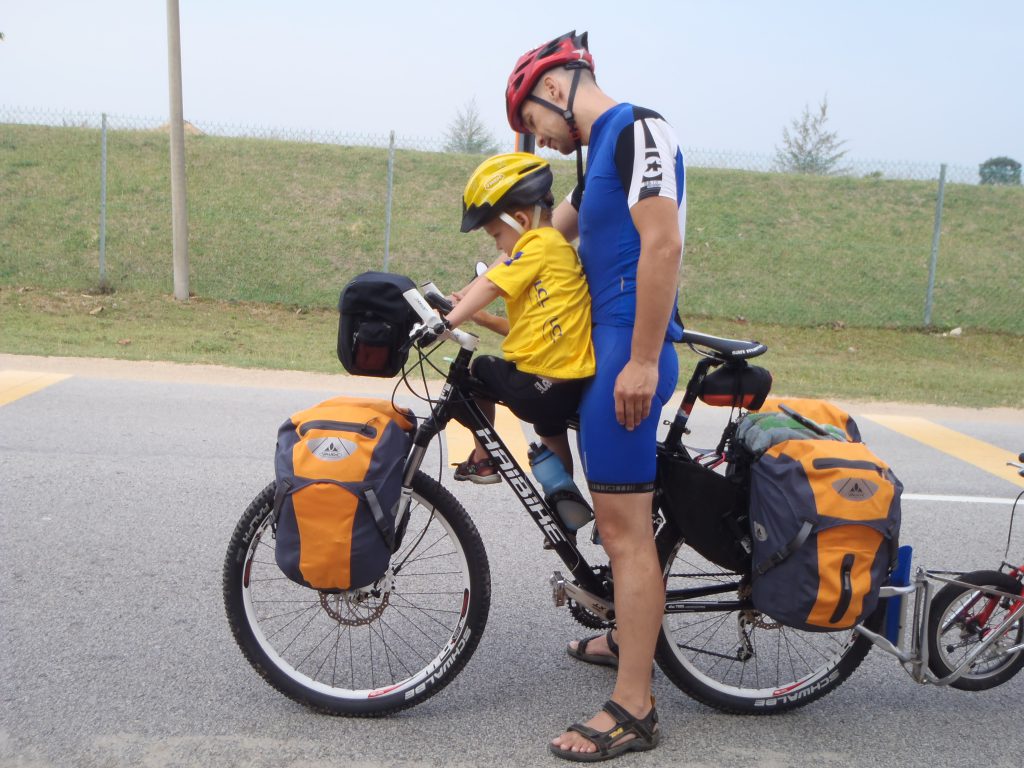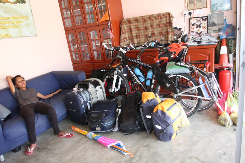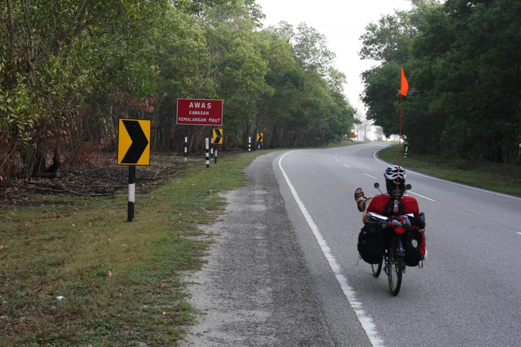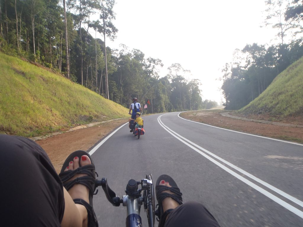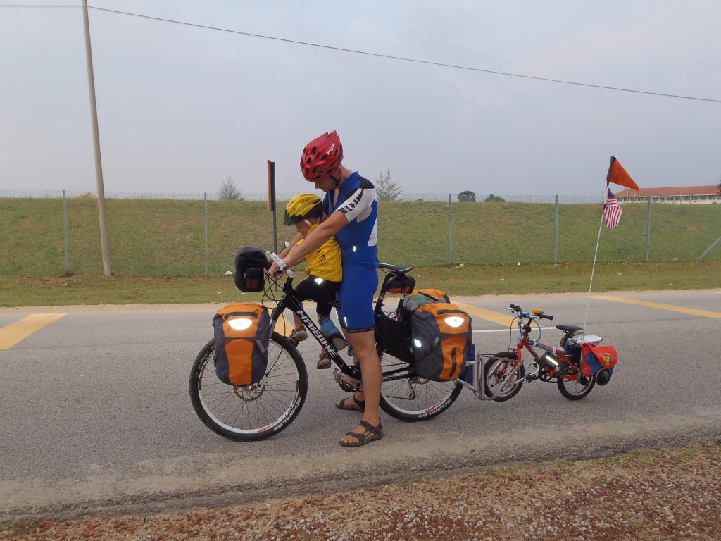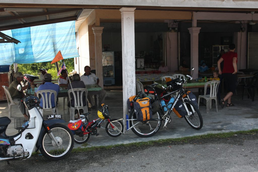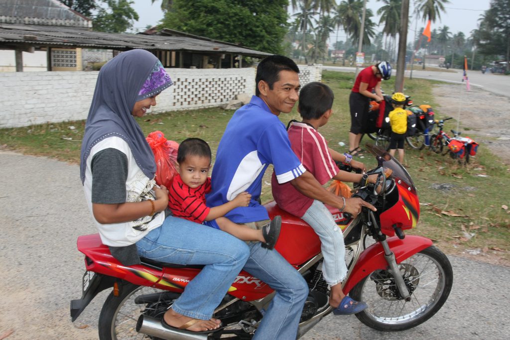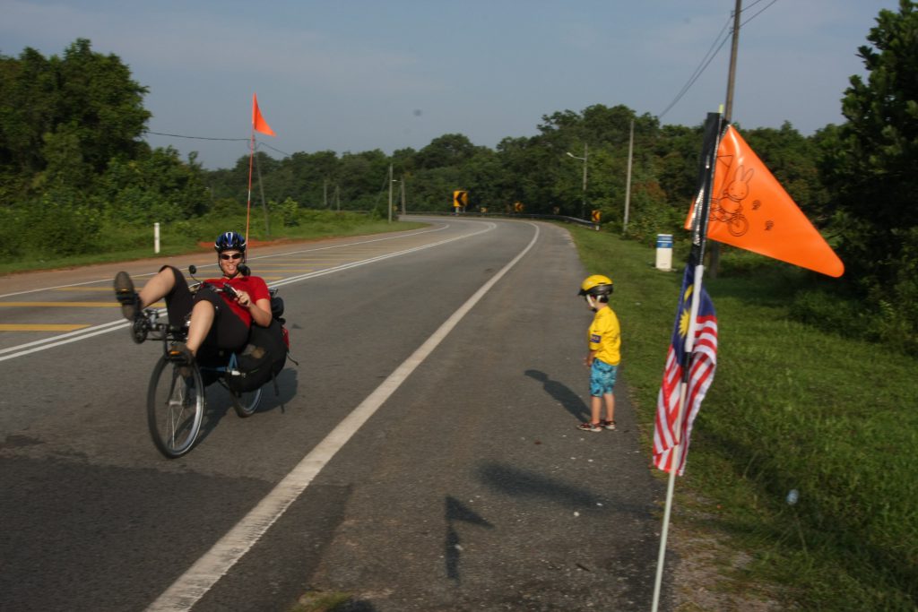 Onderweg zijn we een bijzondere optocht. Voorop rijdt Arjan met Simeon aan zijn fiets vast, en daarachter nog die merkwaardige ligfiets. Er wordt getoeterd, langzamer gereden om goed te kijken, wat geroepen en dan gaan ze weer verder. We worden verder wel helemaal met rust gelaten. De maleisiers vinden het leuk om even met ons te praten, maar ze zijn helemaal niet opdringerig en vinden wat er ook gebeurt allemaal wel best. Deze houding is heel handig omdat je in een hotel makkelijk kunt vragen of er nog meer hotels zijn. Er worden geen verhalen opgehouden dat ze de enige zijn, ze vertellen precies waar de andere hotels te vinden zijn. De andere kant van deze houding is dat je merkt dat er ook helemaal geen gedrevenheid in de mensen zit.