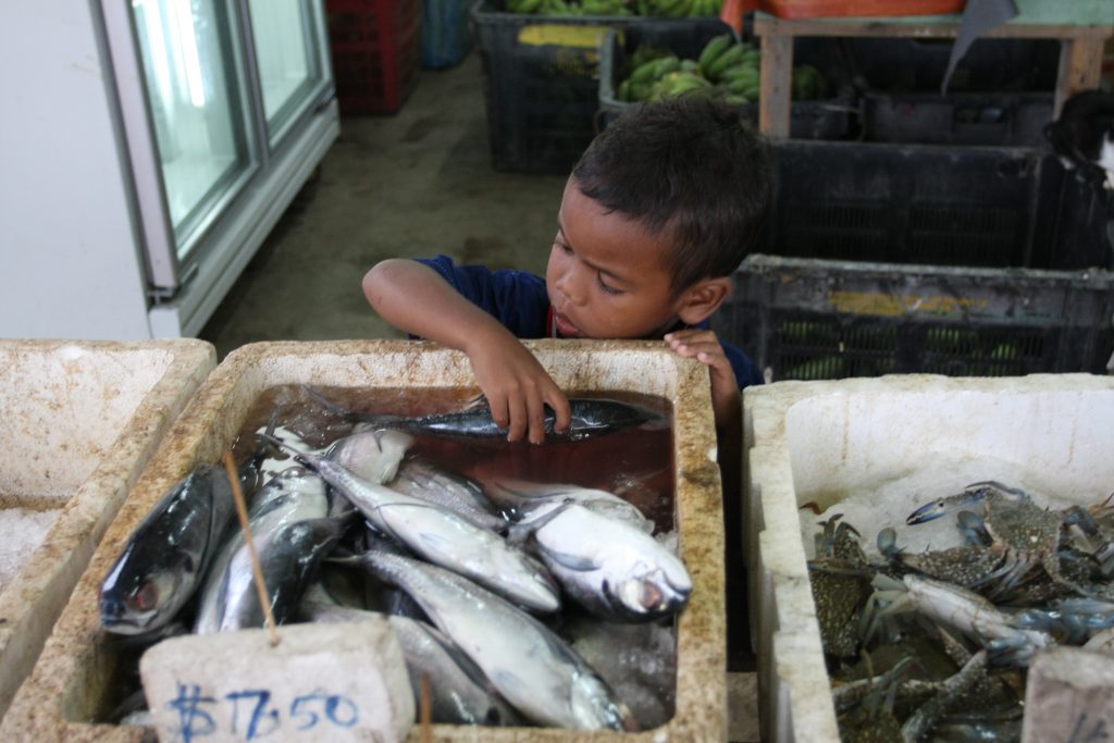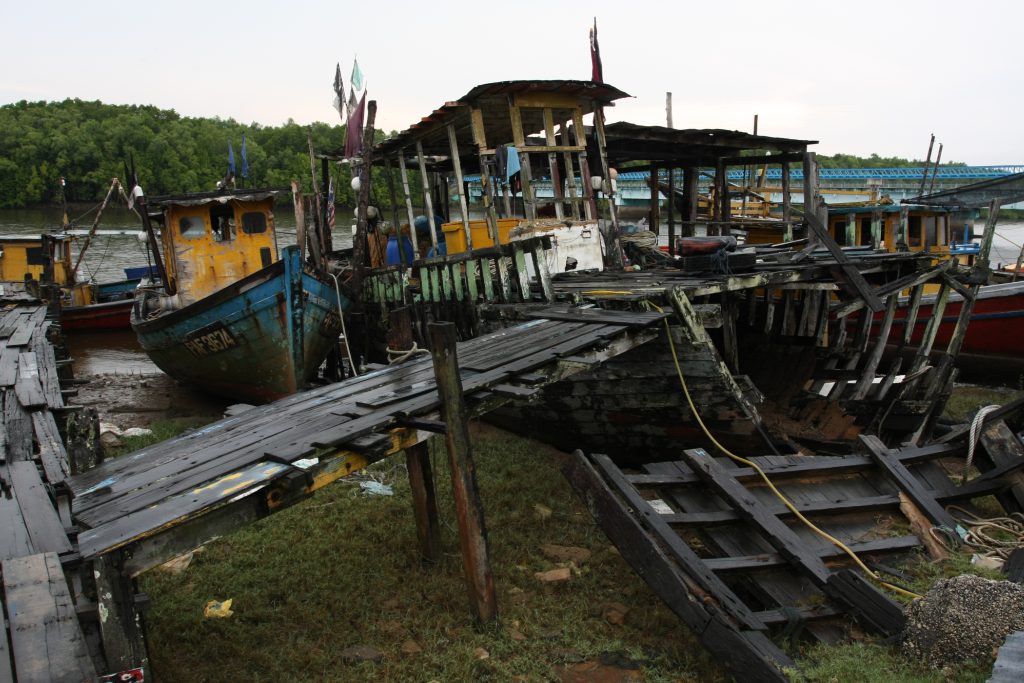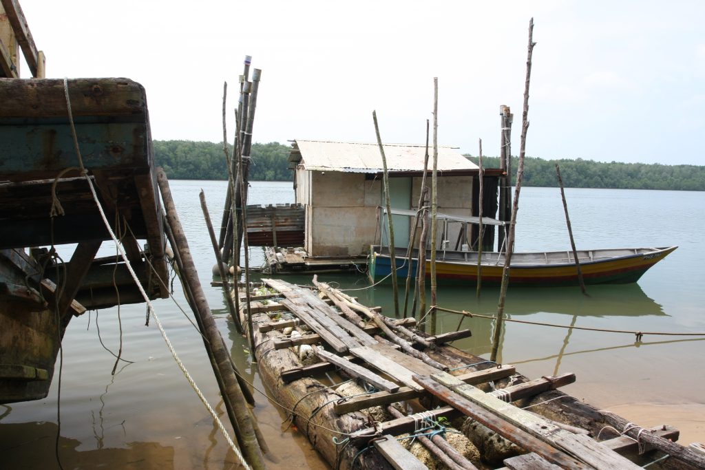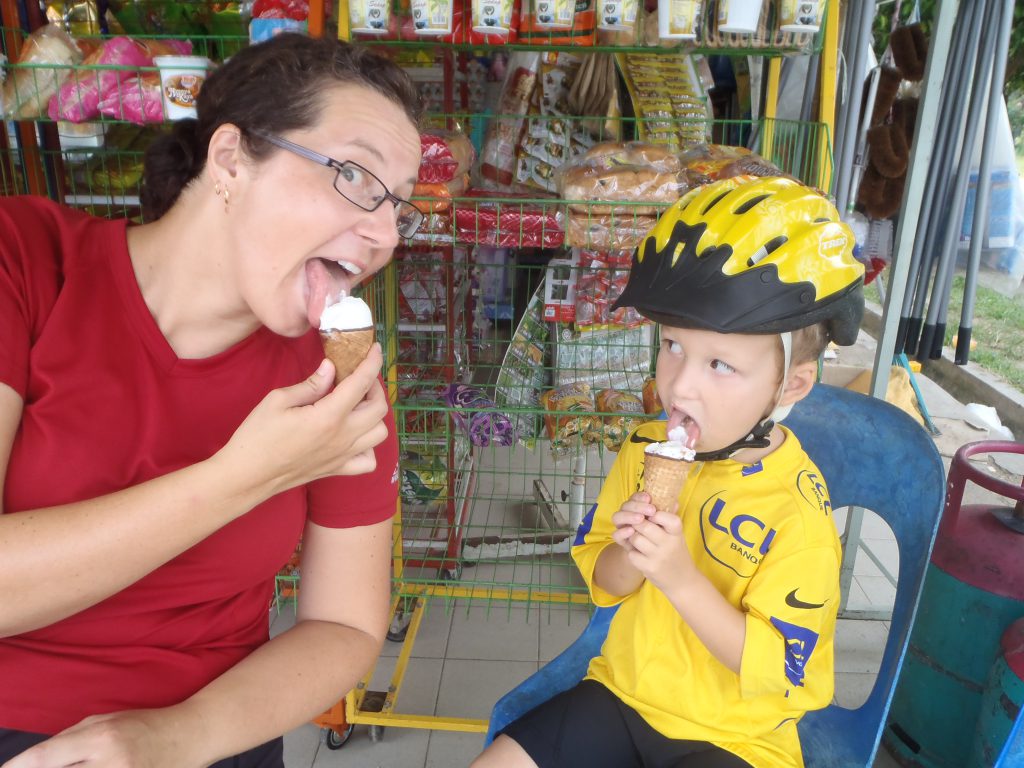Simeon wat kijk je boos. “Ik ben boos op de auto’s. Die rijden zo hard. Ik piew ze allemaal weg.” Auto’s en vrachtauto’s scheuren de afgelopen dertig kilometer ons voorbij. We rijden wel veilig op een vluchtstrook maar er is niets op deze dag dat we leuk vinden op de fiets. Als compensatiedrang krijgt Simeon nog een kitkat en een ijsje. We worden het een steeds zatter dat de wegen hier heel erg druk zijn. We willen gaan liften om een stuk over te slaan maar dat is hier lastiger dan we gedacht hadden. De cabines van de mini-trucks met laadbak zitten meestal al vol met 3 mensen. Een land dat al zo lastig doet over het bezit van een beetje canabis doet gelukkig iets minder minder moeilijk over mensen in laadbakken meenemen, er staat gelukkig niet de doodstraf op, maar er wordt wel op gecontroleerd. De route van Sungai Karang naar Kampong Cherating loopt ook een stuk langs petrochemische industrie, met veel bouwverkeer en bouwprojecten. En er zijn hier geen alternatieven voor de pas verbrede wegen. Er loopt een hoofdweg en daaraan zit nu en dan een zijpad dat bij het strand doodloopt. Als we Cerating binnenrijden zijn we wel gelijk wat vrolijker, we hebben een hutje gelijk aan het strand met een heel groot stuk afgeschermde zee van een halve meter diep. En als je kind weer blij is ben je zelf ook blij, wordt er altijd gezegd.