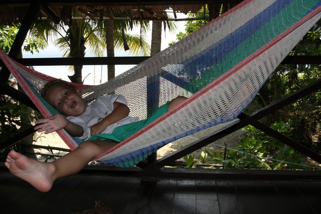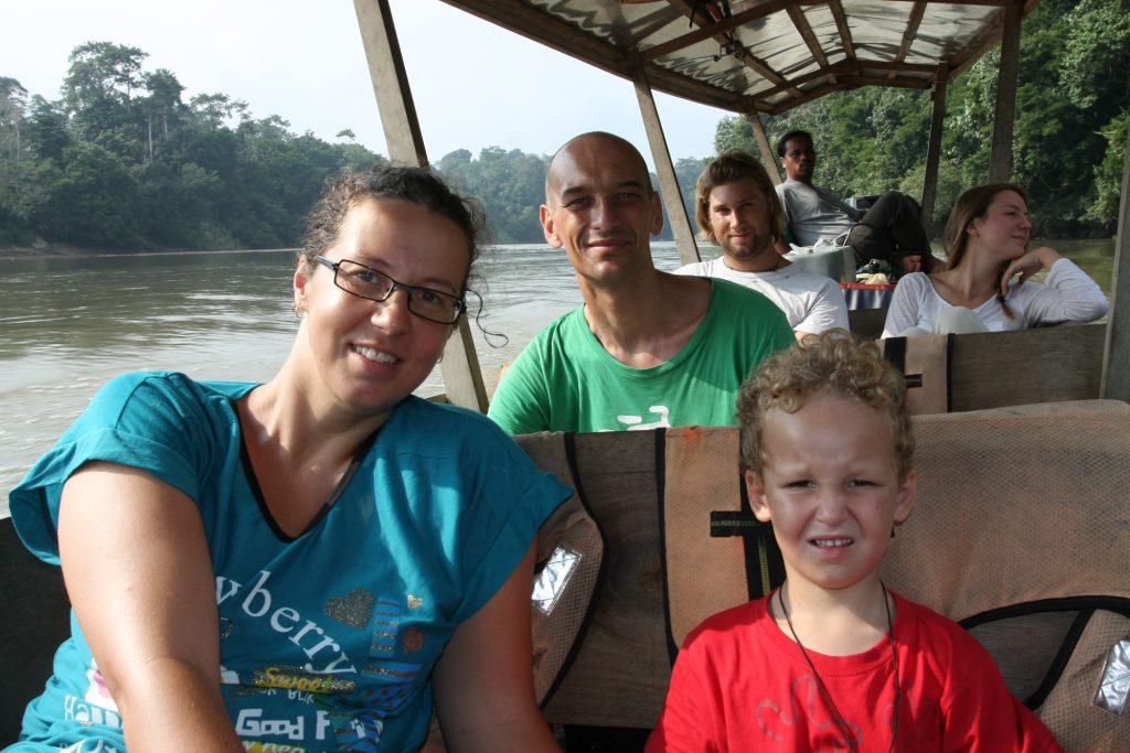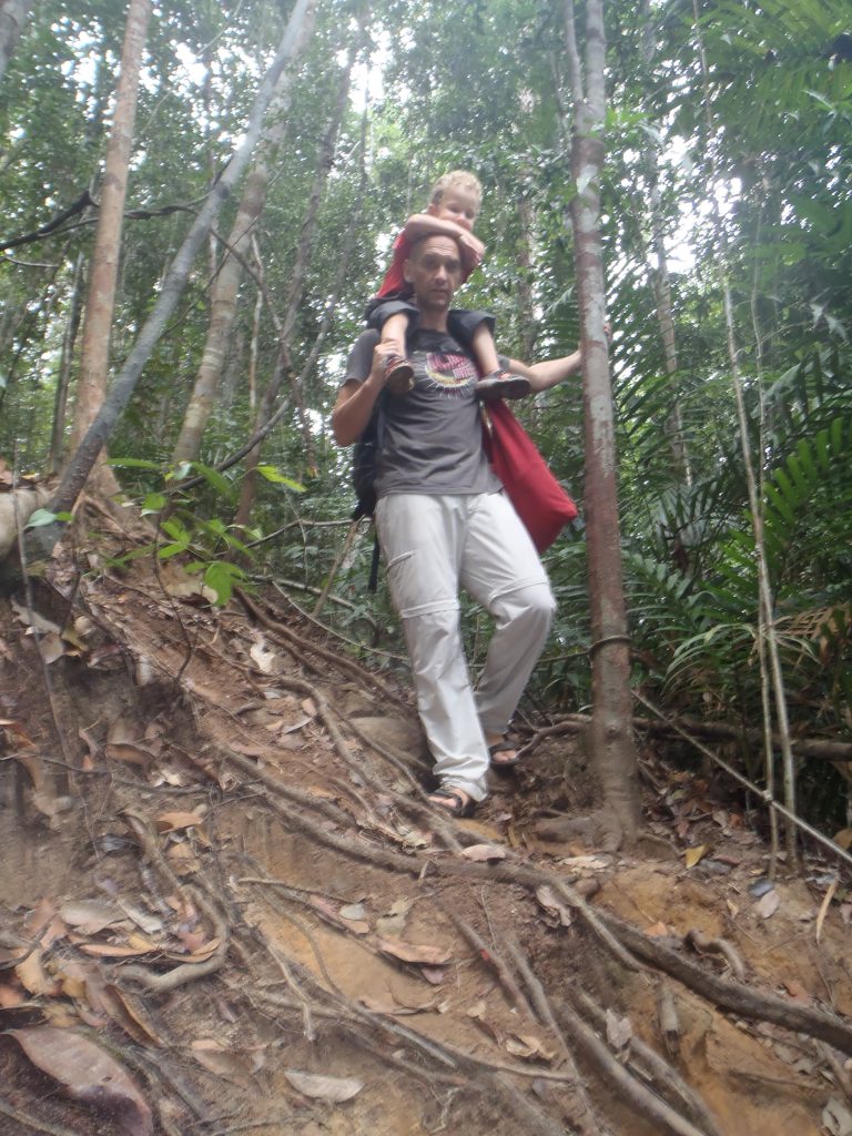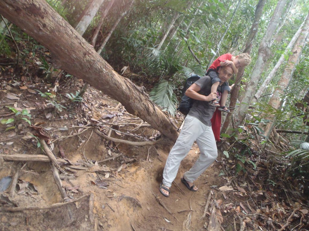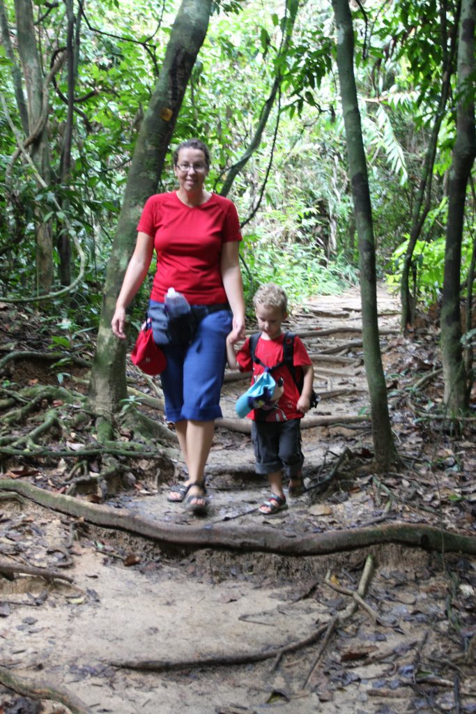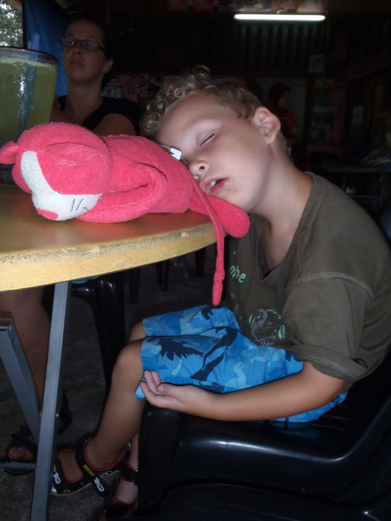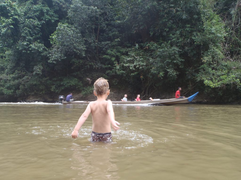 We gaan verder over de paden door het oerwoud. De populaire stukken zijn heel druk. We gaan steil omhoog naar een uitkijkpunt, Simeon is moe en bedenkt op mijn nek hoe je nou makkelijker omhoog kunt gaan, en maakt er ´s avonds met mama een tekening van. Zoals hij het noemt een werktekening van een roltrap met bedden, zodat we niet hoeven te zweten om boven te komen. Als je een iets andere route pakt loop je een uur om anderhalve kilometer af te leggen zonder iemand te zien. Simeon kijkt een kwartier naar een boom die zwart ziet van de mieren en dan kijken wat er gebeurt als je hun route verspert. En na al het gezweet lekker zwemmen in de rivier.