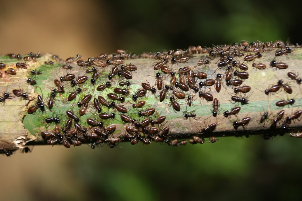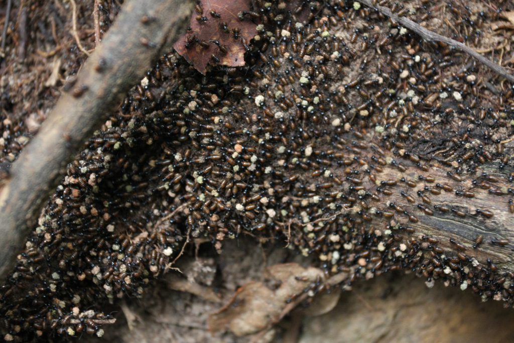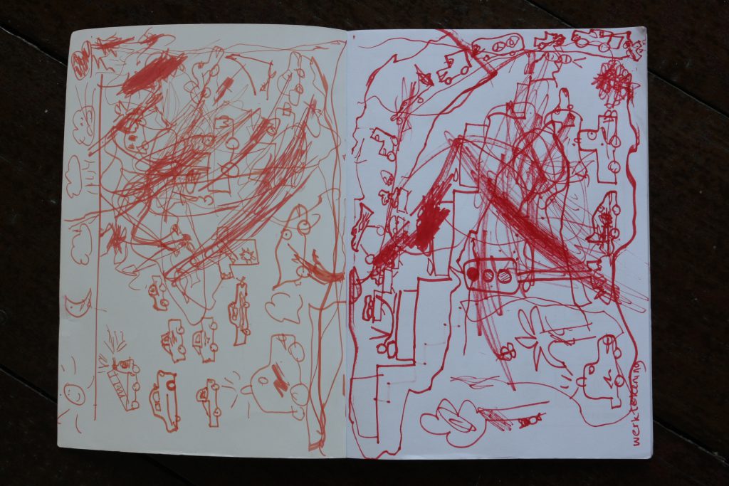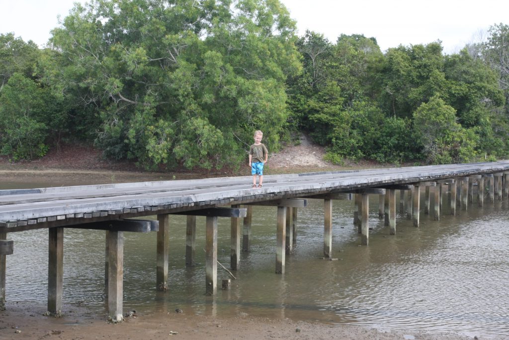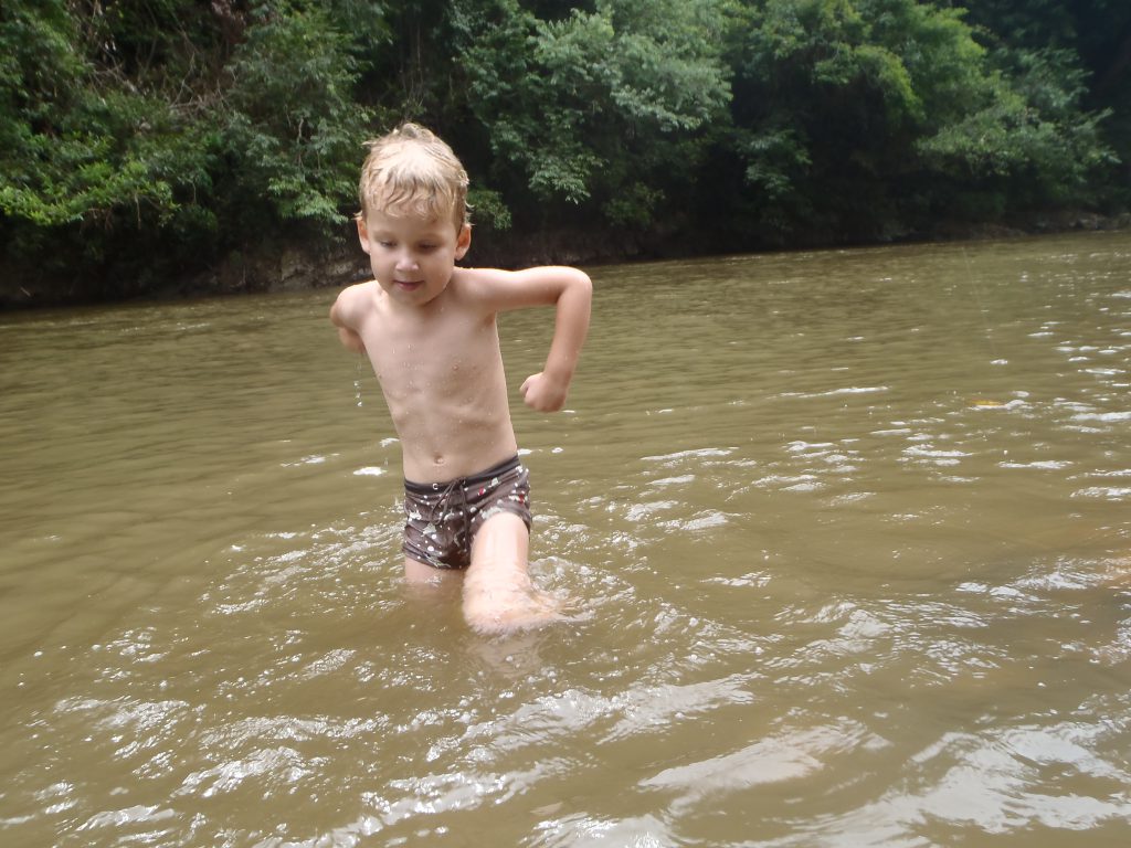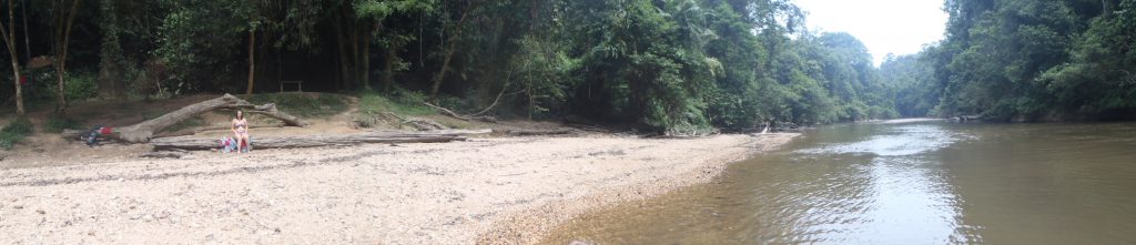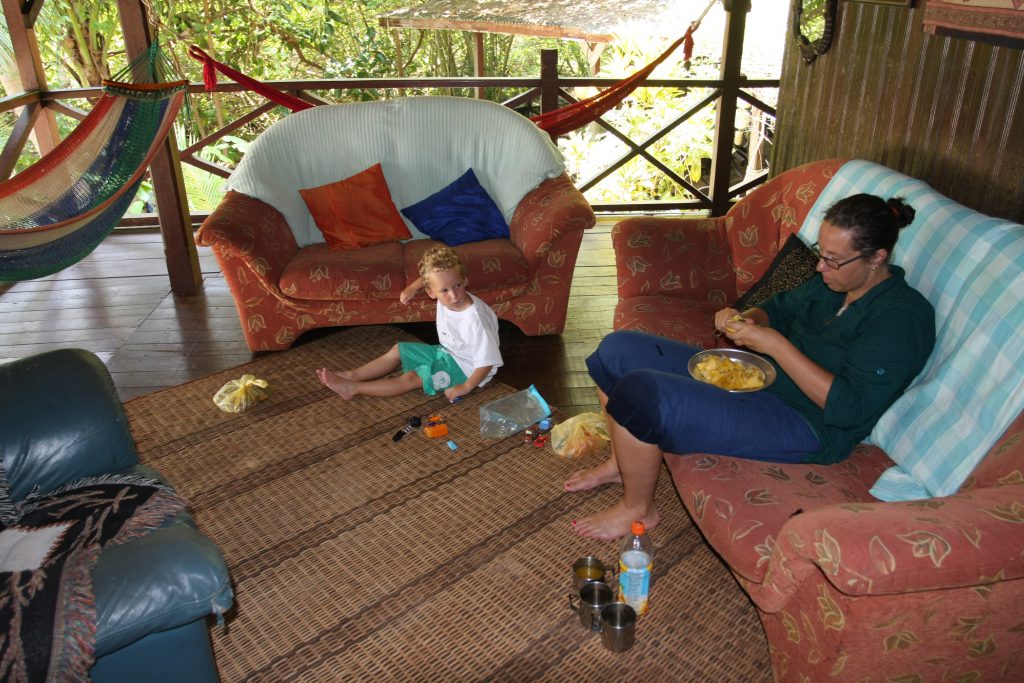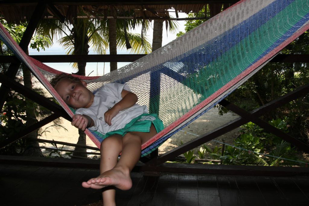 We gaan verder over de paden door het oerwoud. De populaire stukken zijn heel druk. We gaan steil omhoog naar een uitkijkpunt, Simeon is moe en bedenkt op mijn nek hoe je nou makkelijker omhoog kunt gaan, en maakt er ´s avonds met mama een tekening van. Zoals hij het noemt een werktekening van een roltrap met bedden, zodat we niet hoeven te zweten om boven te komen. Als je een iets andere route pakt loop je een uur om anderhalve kilometer af te leggen zonder iemand te zien. Simeon kijkt een kwartier naar een boom die zwart ziet van de mieren en dan kijken wat er gebeurt als je hun route verspert. En na al het gezweet lekker zwemmen in de rivier.