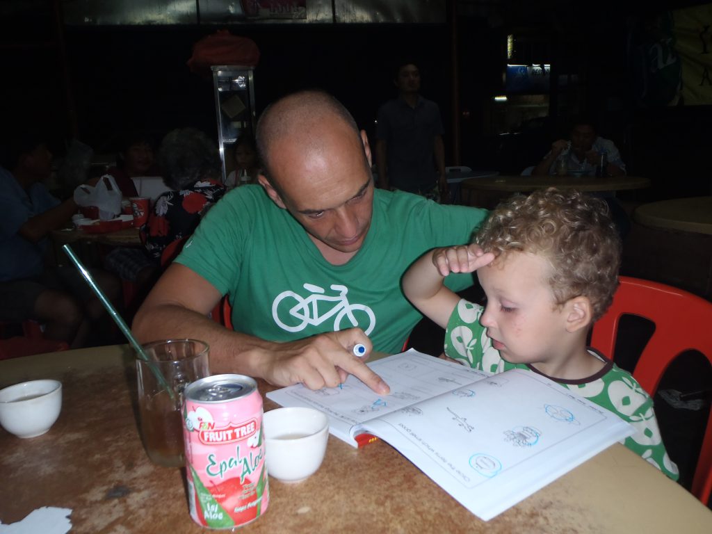 Reizen met Simeon is heel anders dan reizen met z´n twee. Een kind van net vier kan niet even nog doorzetten, als ie moe is valt ie in slaap, en daar kan hij niets tegen doen. Doordat we beperkt zijn in reisafstand zijn we gedwongen te overnachten in plaatsen waar je anders voorbij zou rijden , en dat geeft toch altijd wel interessante belevenissen. Iedere dag heel de dag samen met Simeon is ook iets nieuws. We maken hem veel meer mee, en horen ook veel meer waar hij mee bezig is. “Soms heb ik betere dingen bedacht als ik droom dan als ik hard nadenk” wordt even tijdens het fietsen gefilosofeerd. We merken ook dat 50 kilometer op de fiets zitten vermoeiend is, en als het daarbij ook nog warm is kan Simeon niet meer wakker blijven als we in het hotel aankomen. Alle DVD´s van Barbapappa worden keer op keer bekeken als rustmoment. Simeon wordt ook steeds gretiger naar informatie. We hebben een pre-school wetenschap werkboek gekocht die we helemaal doorlopen, en samen doen we proefjes met drijven en zinken.