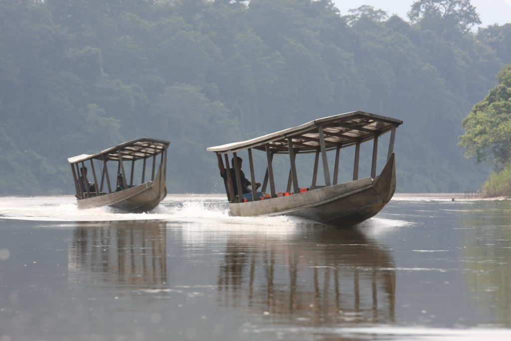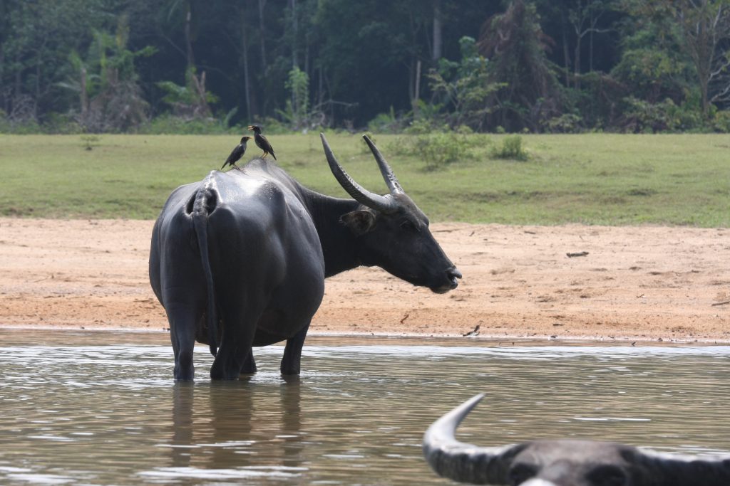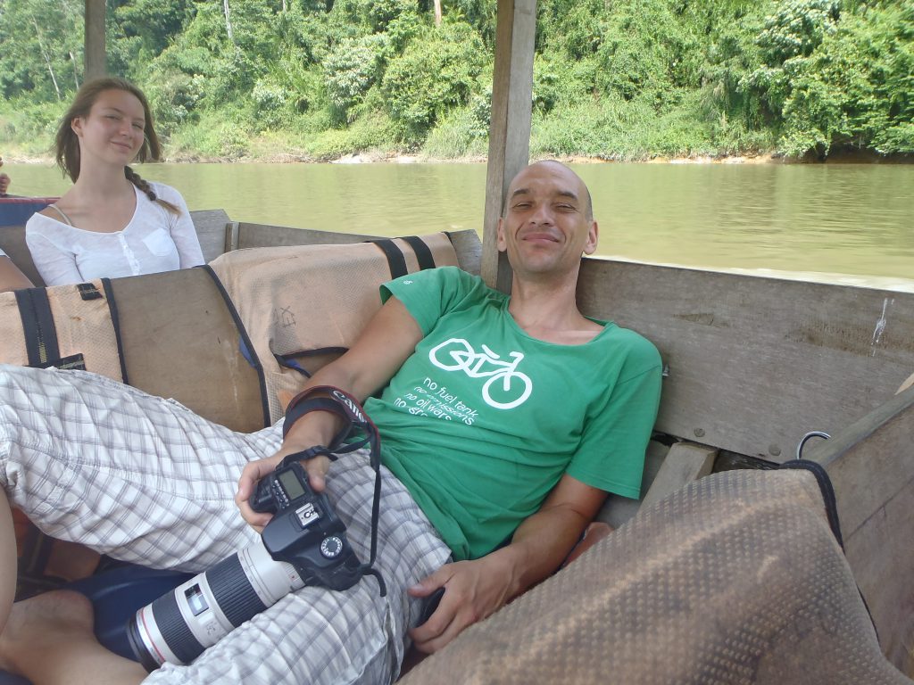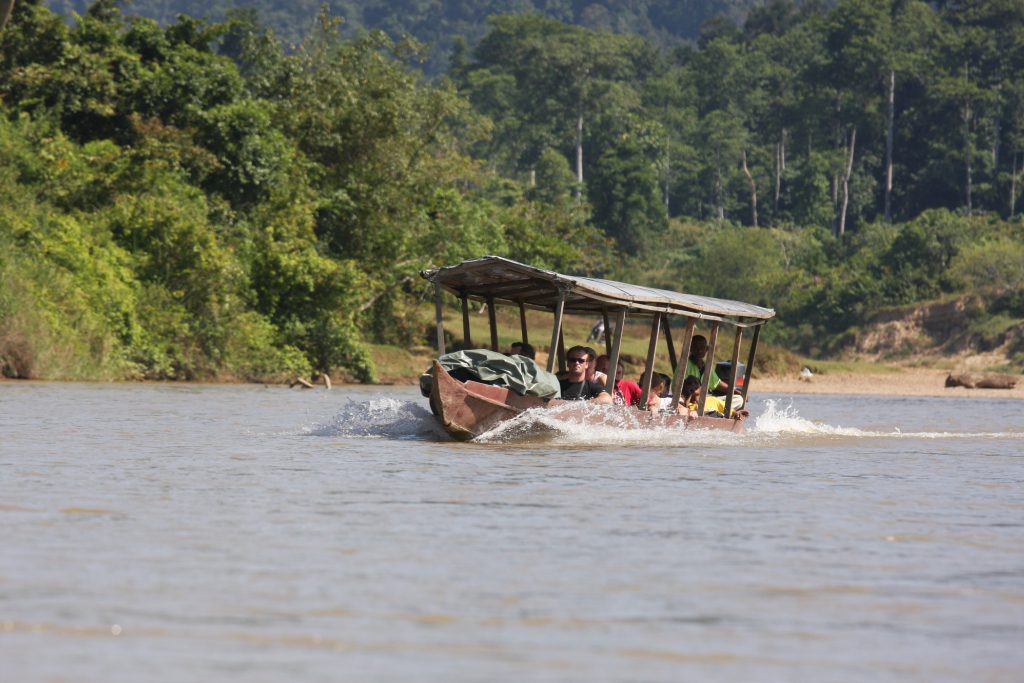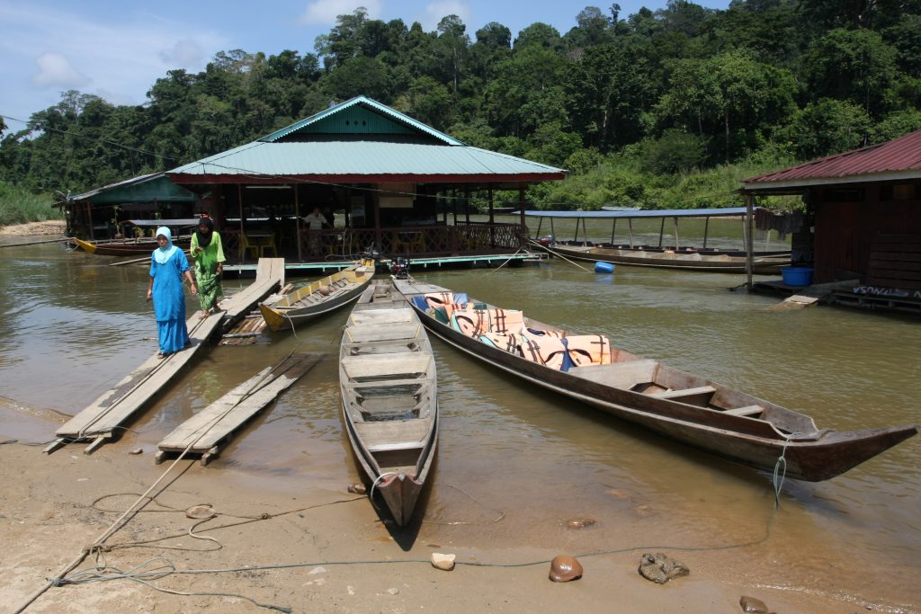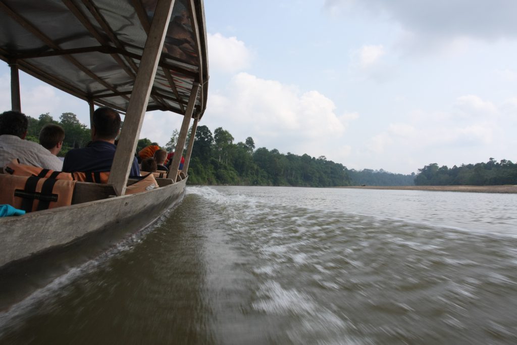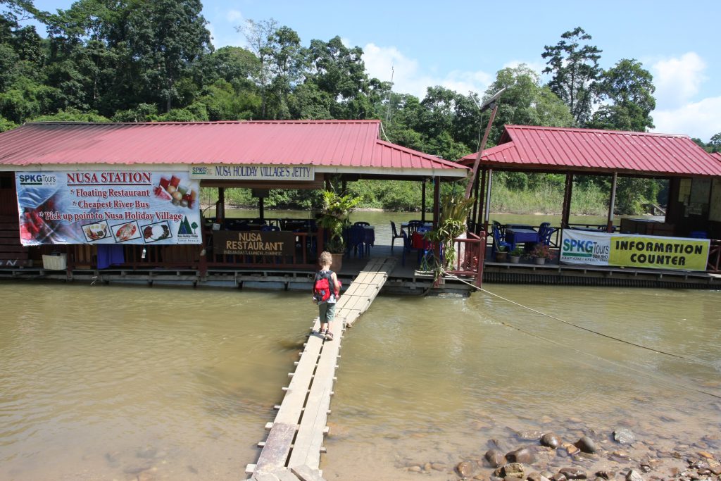 Vanuit Pekan gaan we met de bus naar Taman Negara, het nationale park in het midden van het land. Het zou minstens een week duren als we daar naartoe zouden fietsen met onze dag afstanden. De busrit is saai en lang. In Jerantut worden we gevangen door de tourtjes-maffia, waar we de boot boeken naar het nationale park. “Daar moeten jullie je tassen neerzetten, en dan moeten jullie daar je permits halen voor je camera.”. We worden al gelijk helemaal kriegel van het betuttelende. De anderen volgen braaf de aanwijzingen op en leggen hun tassen in een liftje dat de tassen naar de boot brengt. Als we allemaal in de boot zitten kan iedereen gelijk weer de boot uit, want de tassen moeten nog uit het liftje gehaald worden, twee trappen hoger. Ik kan lekker blijven liggen met mijn tas al lang naast me. Reizen met Simeon heeft nu grote voordelen. Simeon reist voor de halve prijs mee, en daardoor zit Els ruim naast Simeon, en ik heb twee stoeltjes voor mij alleen omdat bijna iedereen als stelletje reist. Op een longboat varen we drie uur lang door het oerwoud. Boom na boom na boom en op een varaan, een varken en wat buffels na zijn er geen wilde dieren te zien. Het is een hele relaxte trip met een hoog meditatief gehalte.