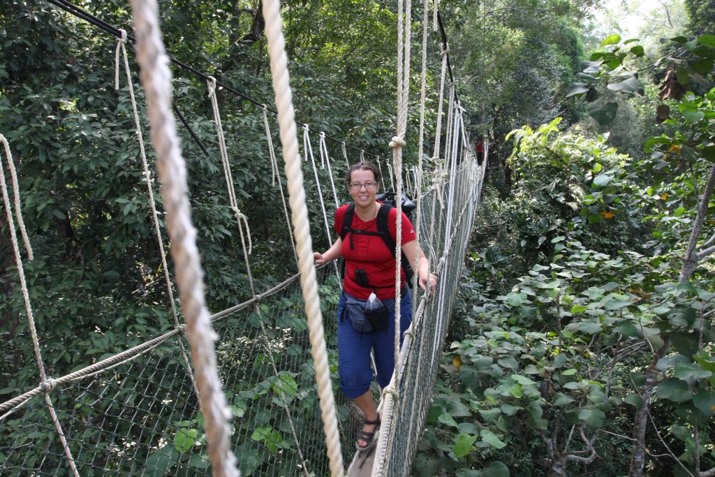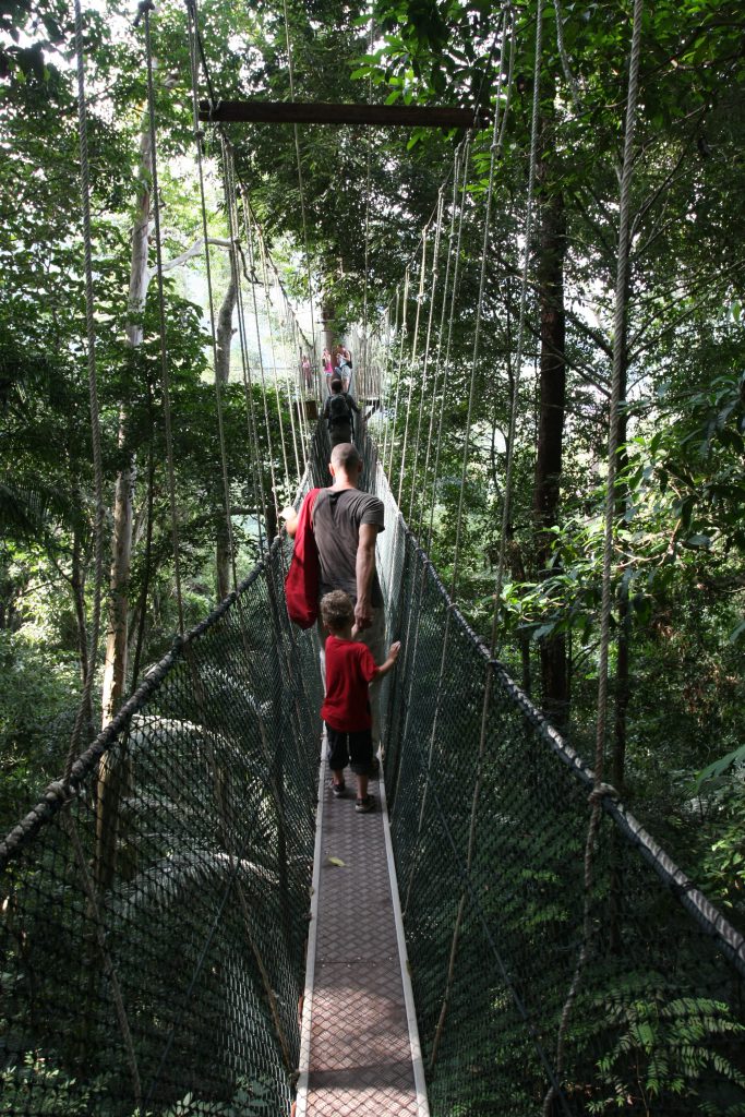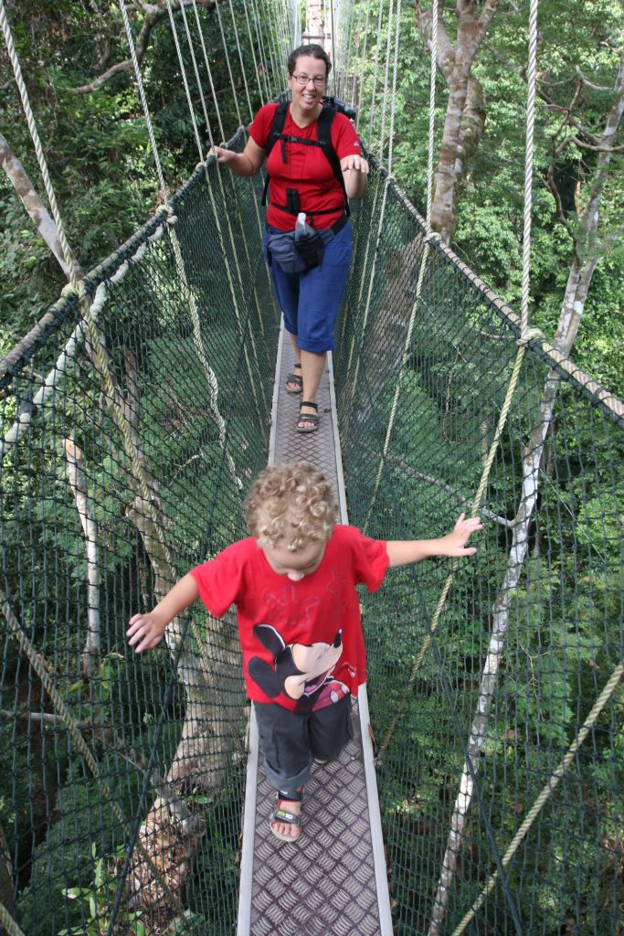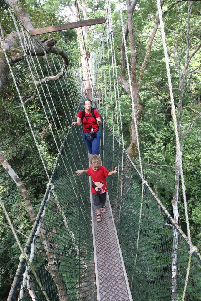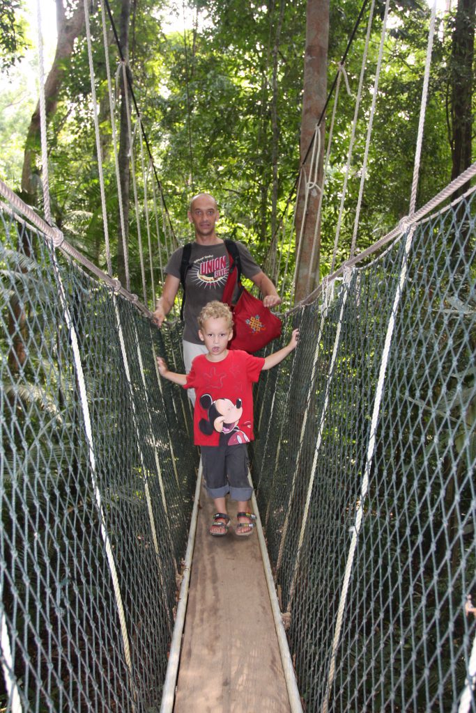 Het hoogtepunt in Taman Negara is de Canopy walkway, oftewel de wiebelbruggen in het bladerdak van het oerwoud. Van boom naar boom hangen de bruggen waarvan het loopvlak niet breder is dan 30 centimeter. Bij iedere stap gaat het loopvlak heen en weer en dat op een hoogte van 40 meter. Voor deze tocht hadden we carabiners en touw meegenomen om Simeon mee te zekeren. Dit bleek geheel overbodig want de bruggen zijn in goede staat en Simeon loopt los zonder enige vrees alsof hij op de grond loopt.