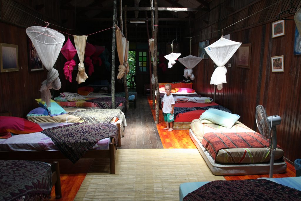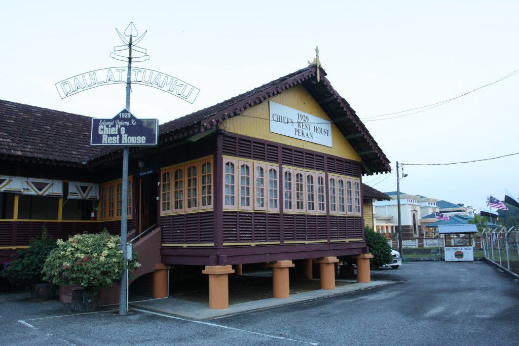 Wat ben je aan het denken? Simeon “Ik ben aan het denken hoe het volgende hotel er uit gaat zien” En wat voor hotel vind je het leukst? “Dat weet ik nog niet”. Als we dan bij het Chief’s resthouse in Pekan binnenkomst roept Simeon gelijk uit “Dit hotel is groter dan dat ik dacht!” Het is ook een prachtig koloniaal brits gebouw uit 1929 met houten vloeren, hoog plafond, ruime kamers, schoon en een living waar we lekker kunnen zitten.