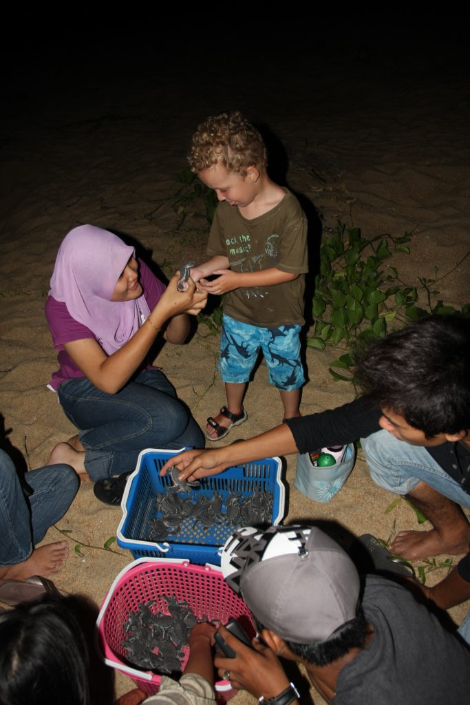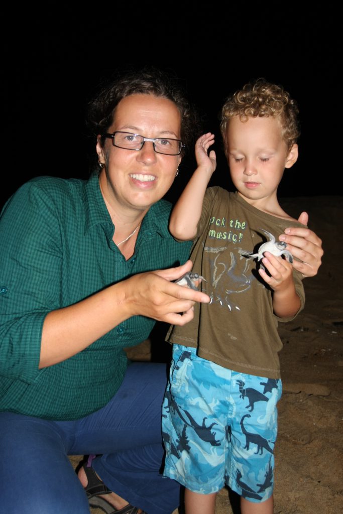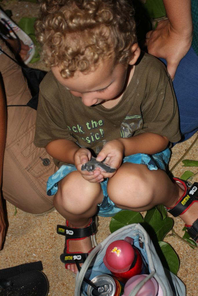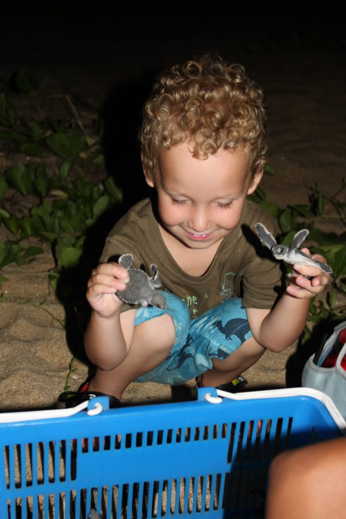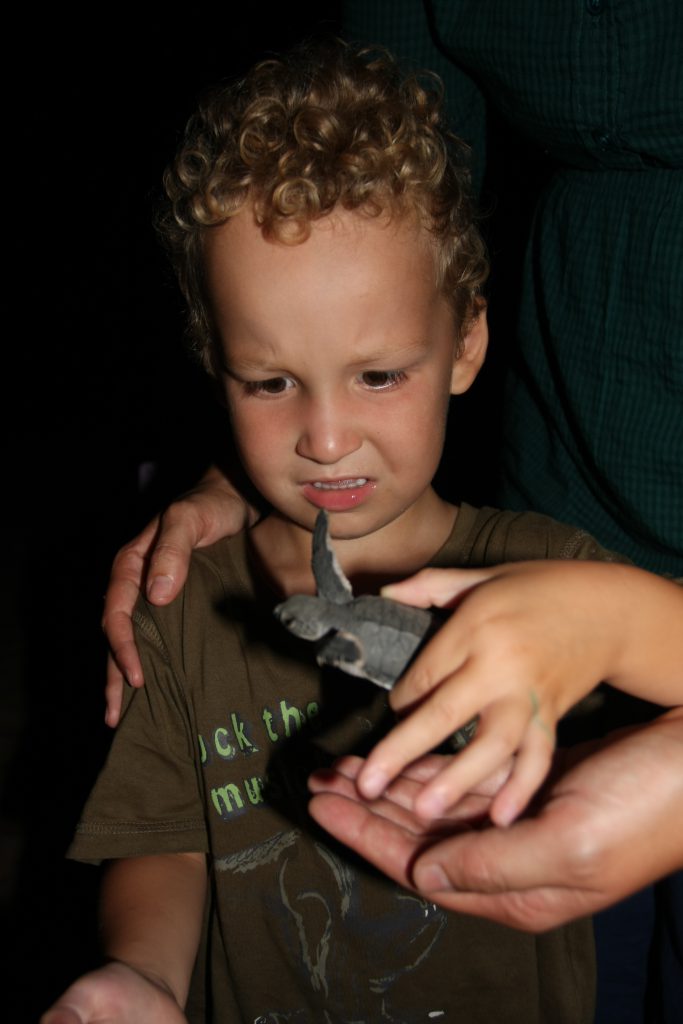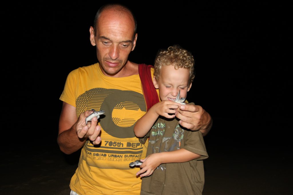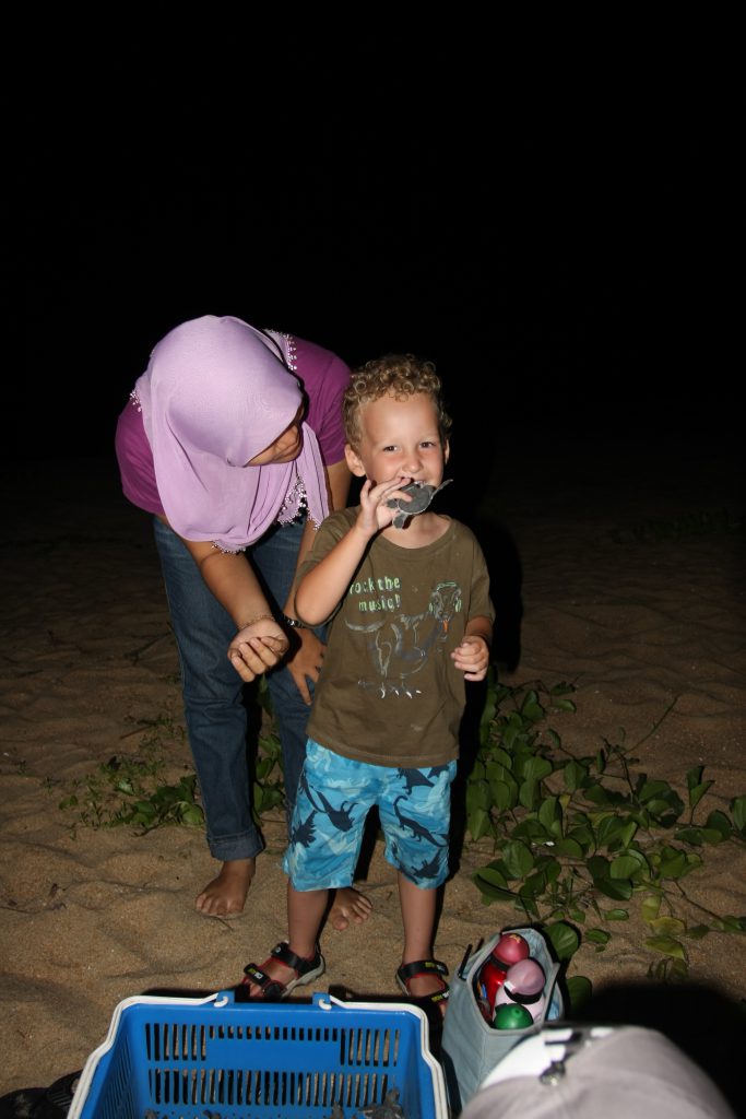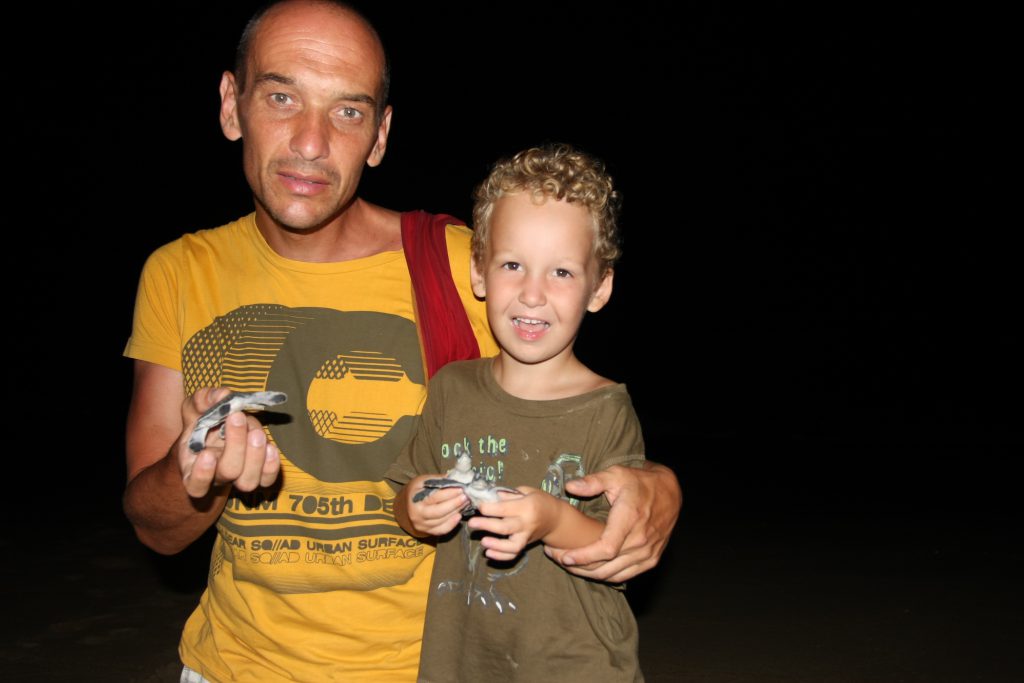 We gaan met een tourtje mee om schildpadden te bekijken. Weer vaag wachten bij een reisbureautje. En dan komt een vol busje voorbij rijden. En er wordt nog een chauffeur geregeld zodat wij die bus met een personenwagen kunnen volgen naar een strand vijftien kilometer verderop. Het voelt als een paar vrijbuiters die de schildpadden uitbuiten, maar dat blijkt helemaal niet het geval te zijn. Er zijn vier groene schildpadden aan land gekomen, en die zijn door de schildpadden bescherming gespot. In kleine groepjes kunnen we de hele grote schildpadden van dichtbij bekijken die het te druk hebben met eieren leggen, en zolang wij rustig zijn gaat zij lekker door. Iedere tien dagen worden er door de zelfde schildpad zo´n honderd eieren gelegd. Deze worden dan weer opgegraven om in een beschermd gebied weer onder de grond te verdwijnen. Anderhalve tot twee maanden later worden komen de babyschilpadjes er dan uit, en die worden dan weer uitgezet op het strand waar ze vandaan komen. Ieder krijgt twee schilpadjes om ze uit te zetten, en ze aan te moedigen om de laatste tien meter over het strand te lopen op weg naar de zee. Twee promiel red het maar van deze schilpadjes, en dat worden natuurlijk de onze. We geven ze allemaal een naam, en Simeon kiest de naam Schippie dat volgens hem “groot en sterk worden” betekent. En zo gaat schippie 1, 2, 3, 4 de zee in om over twintig jaar hopelijk weer op het zelfde strand terug te komen. De volgende dag speelt Simeon dat Schippie even op het strand langskomt als hij een zandkasteel aan het maken is.