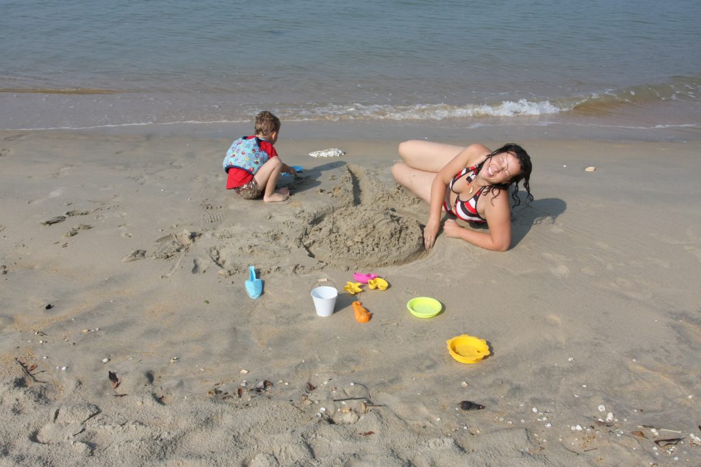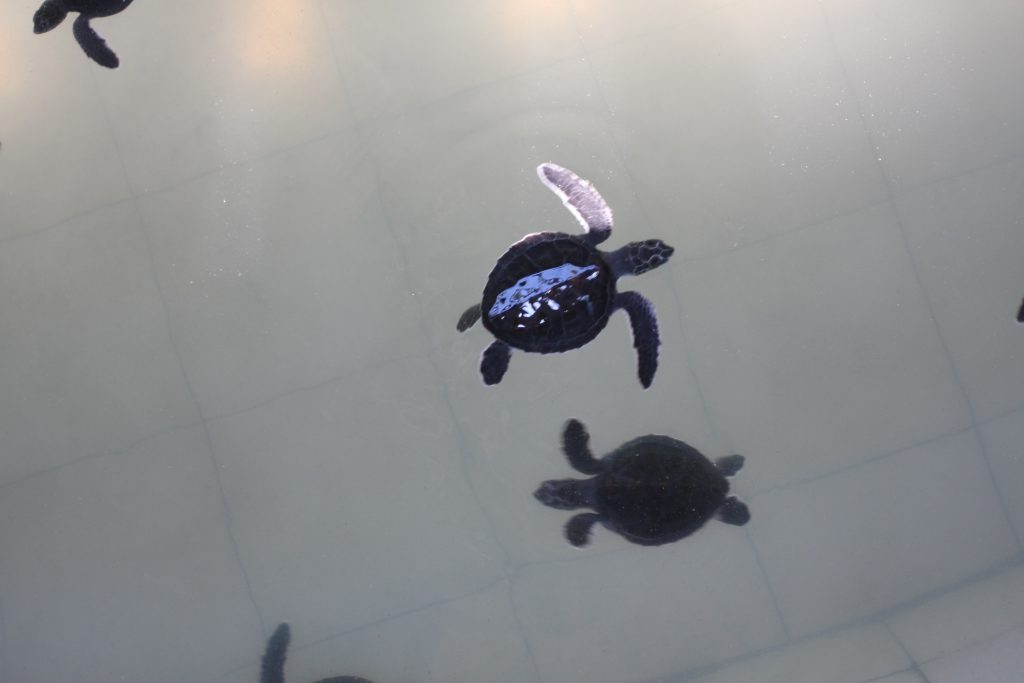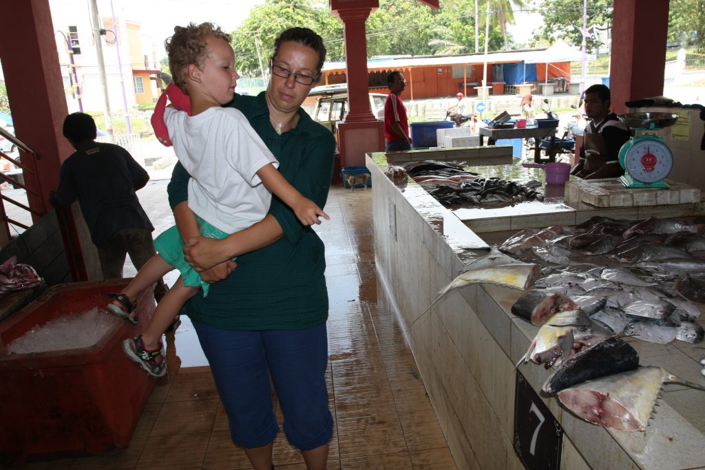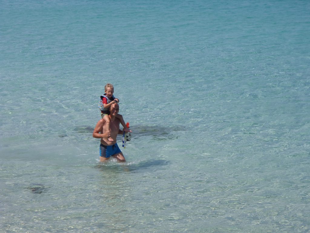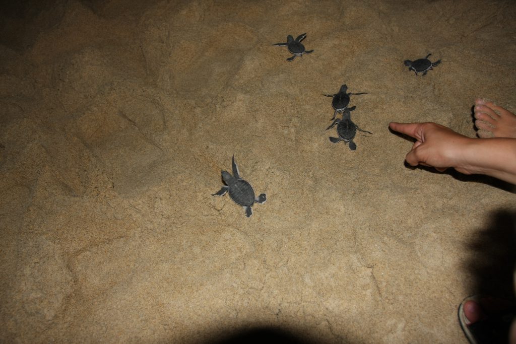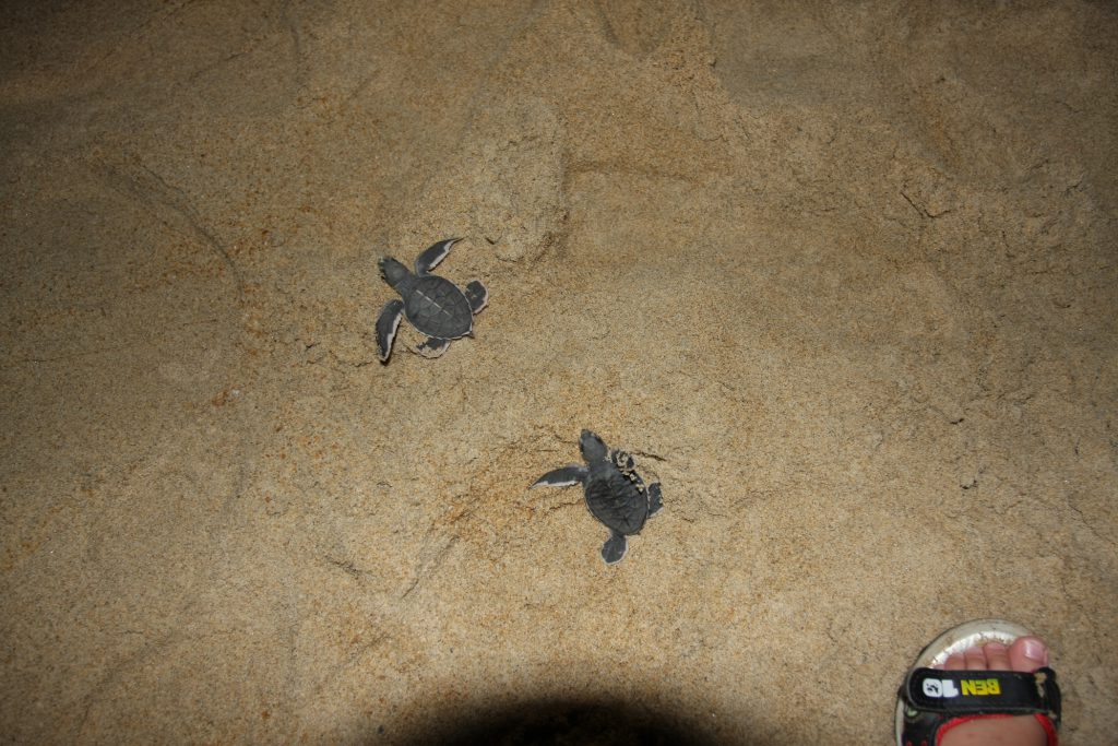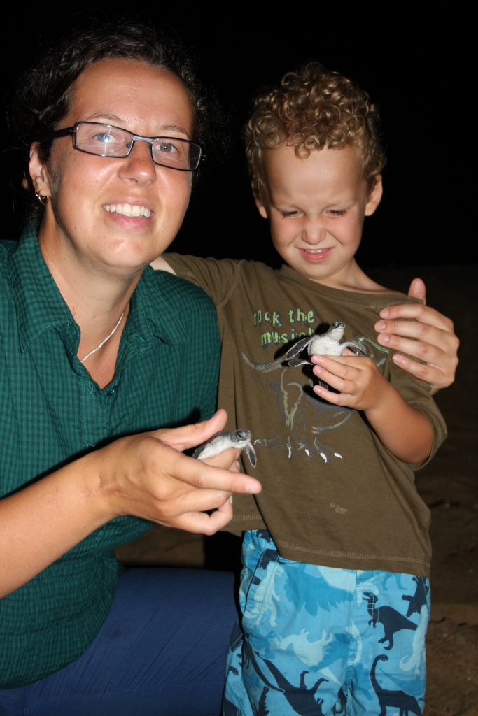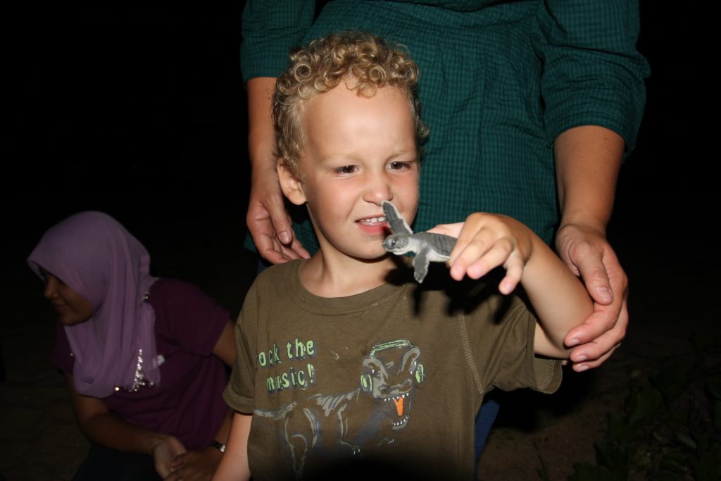 We gaan met een tourtje mee om schildpadden te bekijken. Weer vaag wachten bij een reisbureautje. En dan komt een vol busje voorbij rijden. En er wordt nog een chauffeur geregeld zodat wij die bus met een personenwagen kunnen volgen naar een strand vijftien kilometer verderop. Het voelt als een paar vrijbuiters die de schildpadden uitbuiten, maar dat blijkt helemaal niet het geval te zijn. Er zijn vier groene schildpadden aan land gekomen, en die zijn door de schildpadden bescherming gespot. In kleine groepjes kunnen we de hele grote schildpadden van dichtbij bekijken die het te druk hebben met eieren leggen, en zolang wij rustig zijn gaat zij lekker door. Iedere tien dagen worden er door de zelfde schildpad zo´n honderd eieren gelegd. Deze worden dan weer opgegraven om in een beschermd gebied weer onder de grond te verdwijnen. Anderhalve tot twee maanden later worden komen de babyschilpadjes er dan uit, en die worden dan weer uitgezet op het strand waar ze vandaan komen. Ieder krijgt twee schilpadjes om ze uit te zetten, en ze aan te moedigen om de laatste tien meter over het strand te lopen op weg naar de zee. Twee promiel red het maar van deze schilpadjes, en dat worden natuurlijk de onze. We geven ze allemaal een naam, en Simeon kiest de naam Schippie dat volgens hem “groot en sterk worden” betekent. En zo gaat schippie 1, 2, 3, 4 de zee in om over twintig jaar hopelijk weer op het zelfde strand terug te komen. De volgende dag speelt Simeon dat Schippie even op het strand langskomt als hij een zandkasteel aan het maken is.