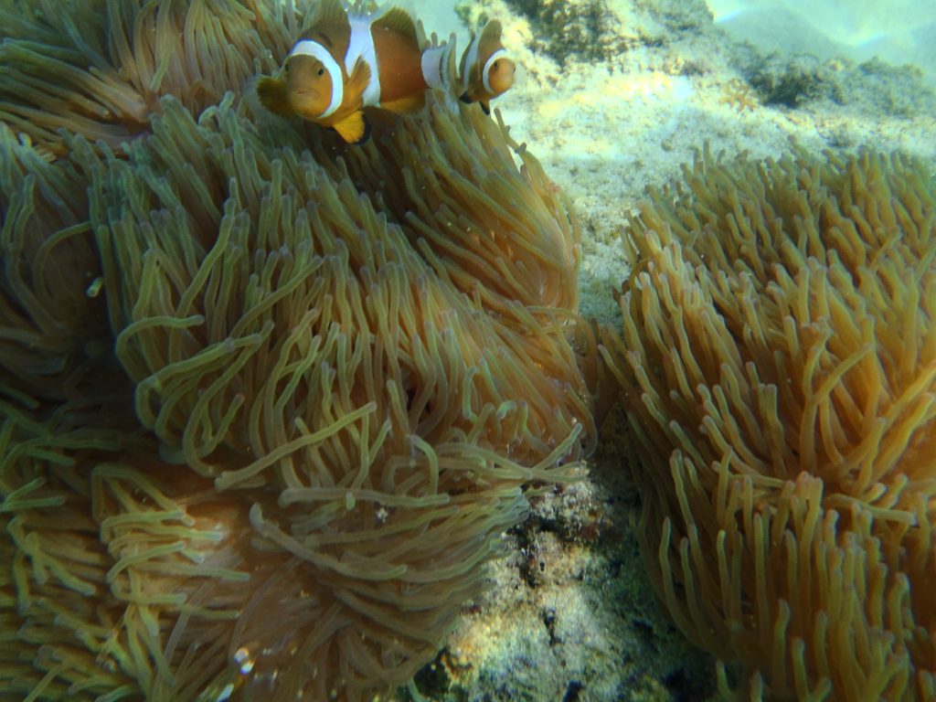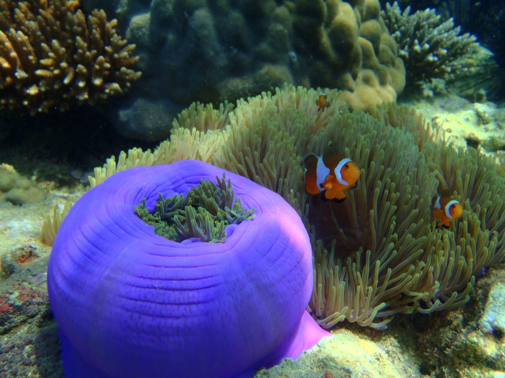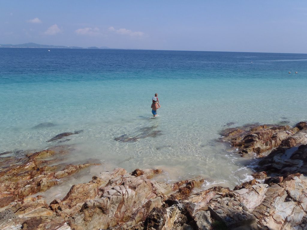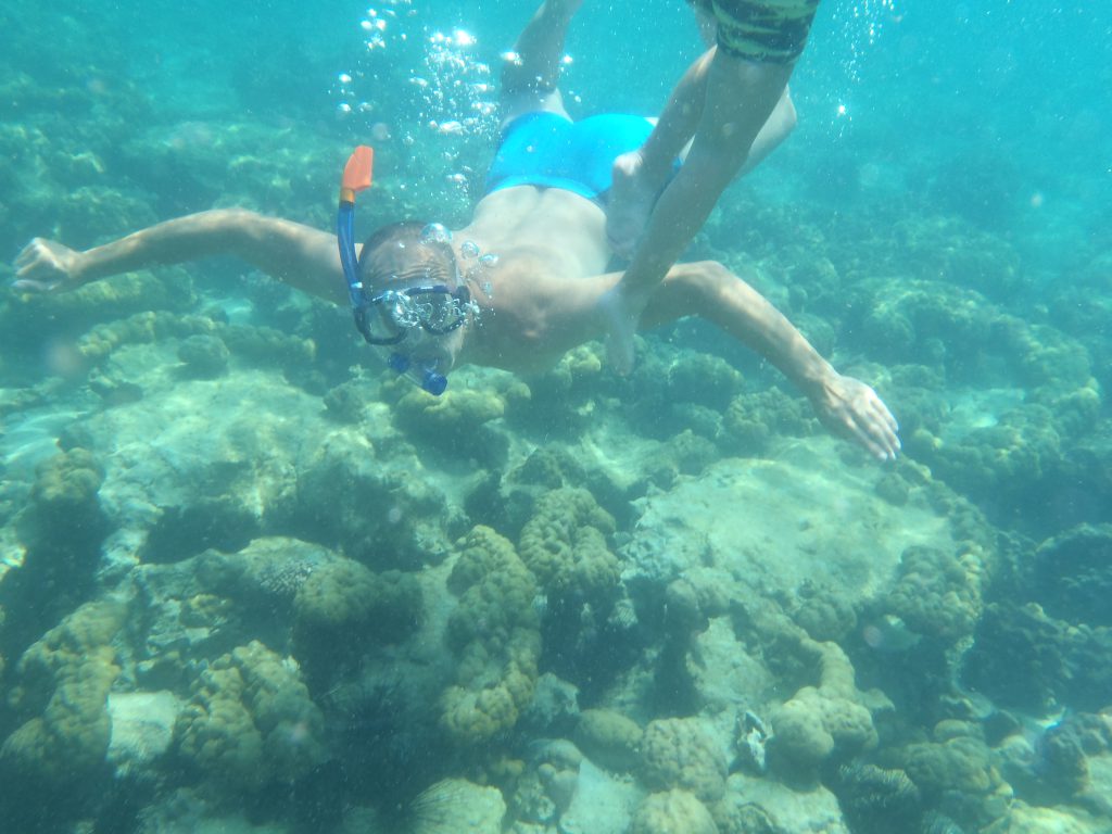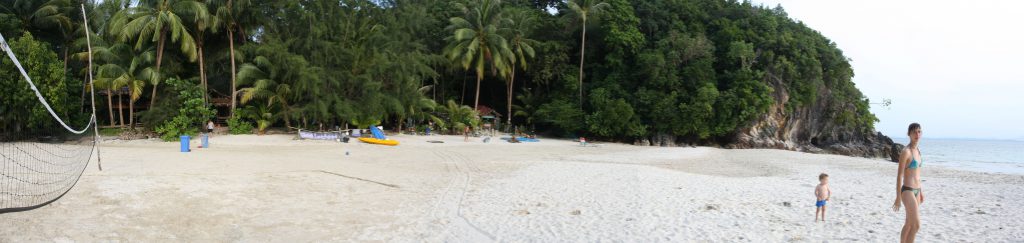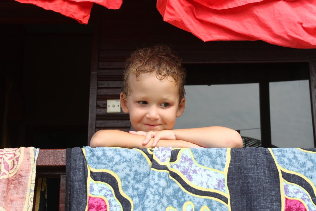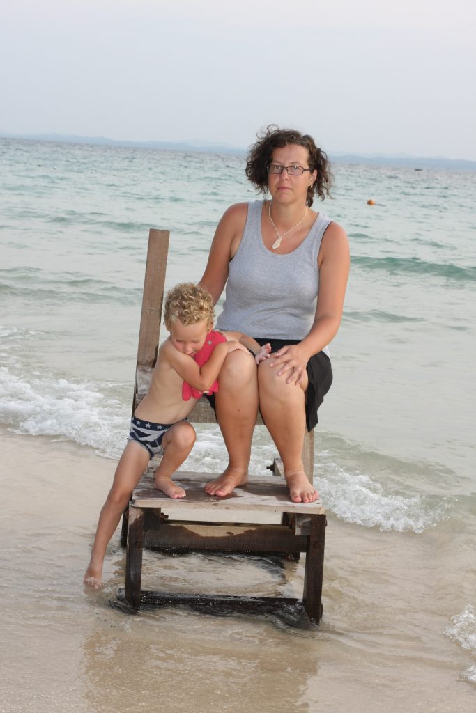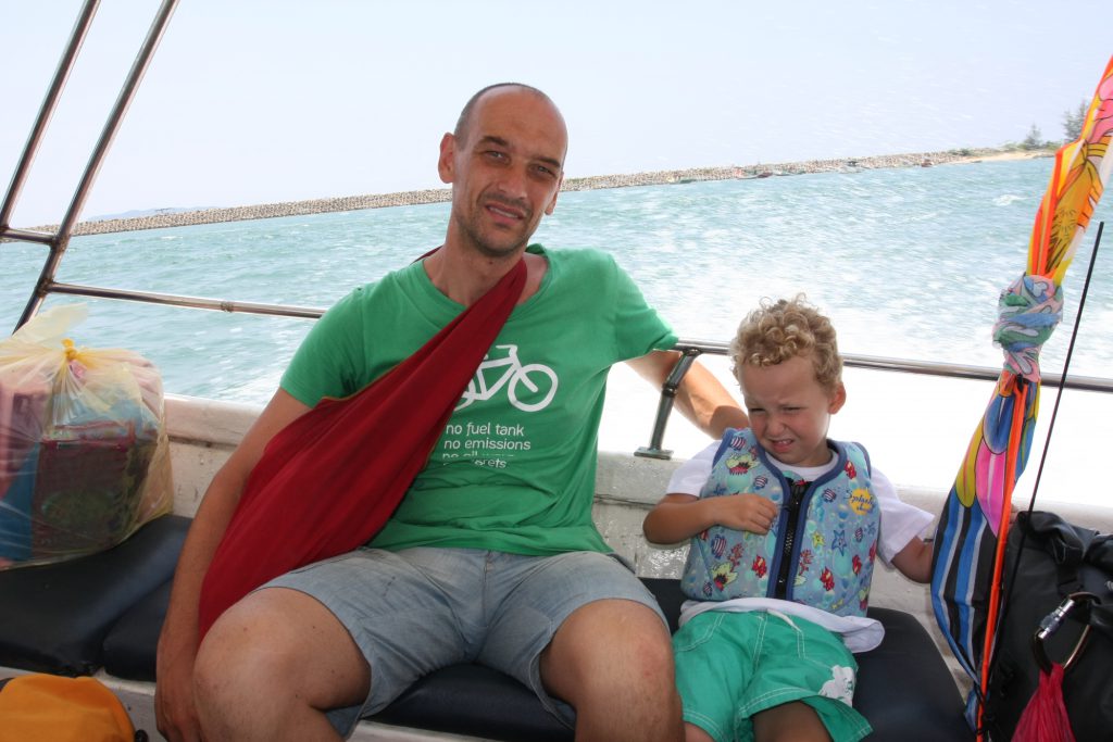 De komende dagen hadden er zo uit kunnen zien. 5 dagen ieder dag tussen de 30 en 40 kilometer langs de highway 3. Voorbijrazende autos en vrachtwagens zorgen ervoor dat ik Simeon niet kan verstaan. Ieder dag zijn we blij als we aan het einde van de rit een vaag hotel kunnen vinden, of in een te duur 4 sterren resort de nacht doorbrengen. Soms zijn we blij dat er even een brommerstrook langs de weg loopt, maar dat is meestal maar een paar kilometer en dan moeten we weer direct naast de autos. De grasstroken in de middenberm worden schoongehouden door opruimploegen en ze zien eruit als golfvelden. Er rijdt nog een brommer rond die de verdwaalde papiertjes opruimt. Als we even van de 3 afkunnen zien we de gedumpte rotzooi weer langs de weg liggen. Olie rafinaderijen kilometers achter elkaar in branderige open gebieden, en aan de kant van de weg tientallen eetstalletjes op een rij die allemaal verlaten zijn want het is Ramadam. Dichterbij Marang wordt het alweer leuker, de bomen staan dichter bij de weg en resorts staan aan de zee. In plaats van 5 dagen met de fiets doen we het in 4 uur met het minibusje van Nasir. Vandaag even geen ramadam voor hem, en wij zijn blij dat de chauffeur gewoon drinkt en eet als hij ons rijdt. De fietsen staan de komende dagen in een klein kantoortje van de rastafari speedboot overtocht verkoper. De speedboot vaart het strand op en we springen op het prachtig witte zandstrand van Pulau Kapas. Ons hotel is een traditioneel longhouse aan het strand, en gelijk in het water is wat koraal waar we Nemo vinden in zijn zee anemoon. In het midden van het longhouse is een grote dorm, maar iedereen zit in de kleine kamertjes aande buitenkant. Een groot terras waar we lekker in een hangmat hangen, en Simeon loopt vrij rond. Als hij van het strand af komt pakt hij zelf een emmer water om zijn voeten mee zandvrij te maken en gaat het gebouw in. De mensen van het hotel zijn alleen iets te relaxed om wat te doen op de dag. Als we eten bestellen duurt het minstens een uur voordat het klaar is. Ze hebben meer de insteek dat ze zelf ook op vakantie zijn, en als ze zelf even tijd hebben willen ze wel wat doen. De meesten eten dan ook bij een van de andere restaurantjes op het eiland. Zelfs om Nemo in het echt te zien wil Simeon zijn duikbril niet meer op doen “Ik zie Nemo wel op de foto, anders zwemt ie weg.” Na een paar keer meezwemmen wil Simeon opeens wel onder water. “Mama! Mama! Ik zie Nemo!” en Simeon is niet meer het water uit te krijgen. Hij probeert zich zelf zwemmen te leren en wil grote “Open en dichtschelpen” dicht zien gaan, en vind christmastrees pesten zo leuk als ze zich intrekken. Als Simeon ook nog Storm, een Nederlandse jongetje, tegenkomt om mee te spelen wil hij eigenlijk niet meer weg.