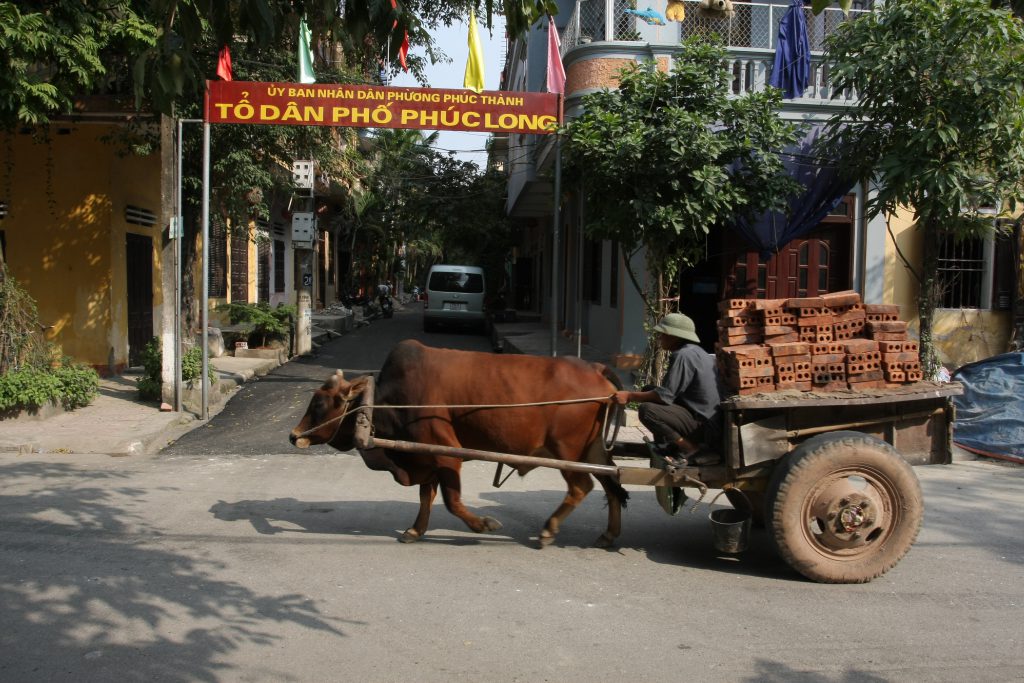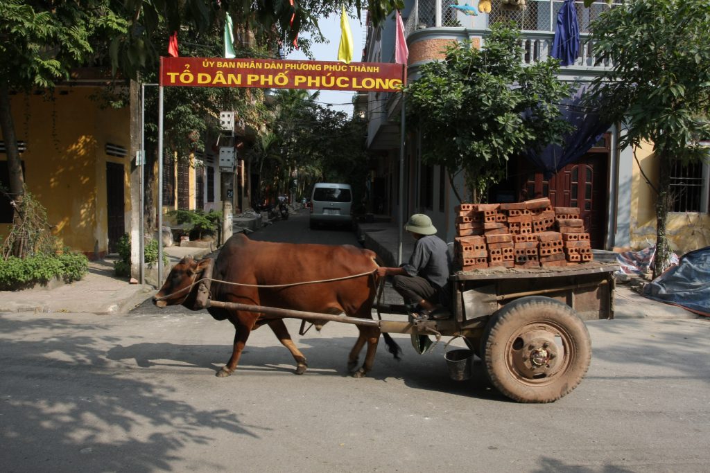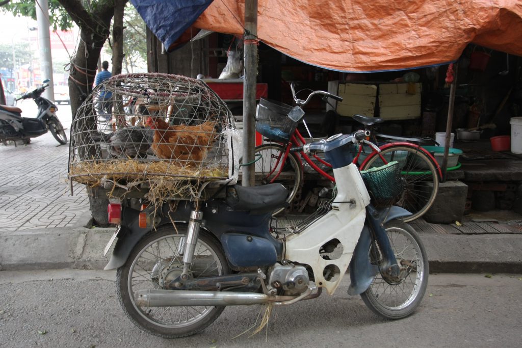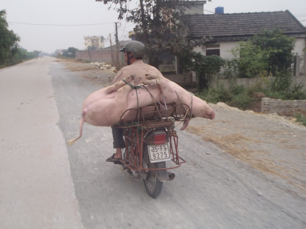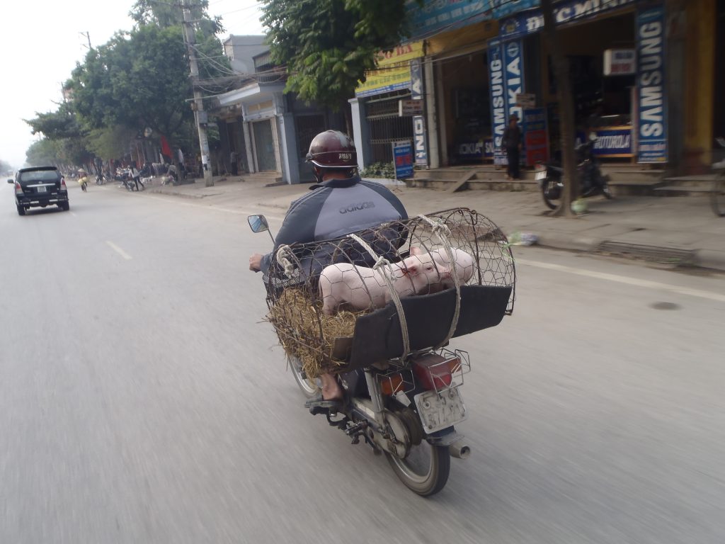 We gaan met z´n drieen weer op de motor op pad. Als we eenmaal Ninh Bình uit zijn moeten we een kaarsrechte asfaltweg volgen. Dit lijkt heel saai, maar een asfalt weg is hier ook geregeld een hobbelweg. De weg loopt een groot stuk langs een kanaal dat vol met planten staat met gammele bamboe bruggetjes eroverheen. Dan weer een lint van markten waar allerlei fruit, groenten en vlees verkocht wordt. Alle spullen moeten zo vers mogelijk met de brommer naar huis gebracht worden. Grote manden hangen aan de brommers en de kippen zitten in een kippenhokje, en de biggetjes in een biggen hok achterop.