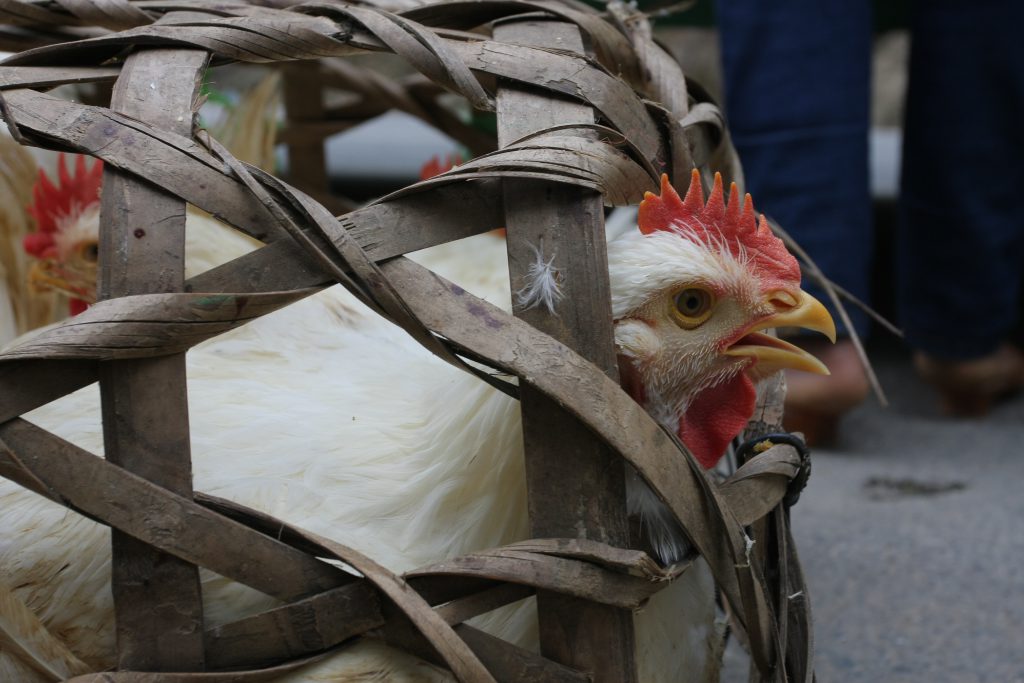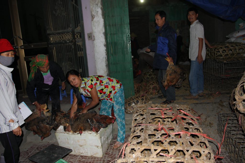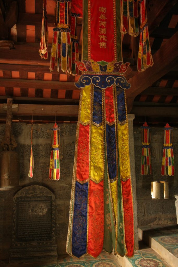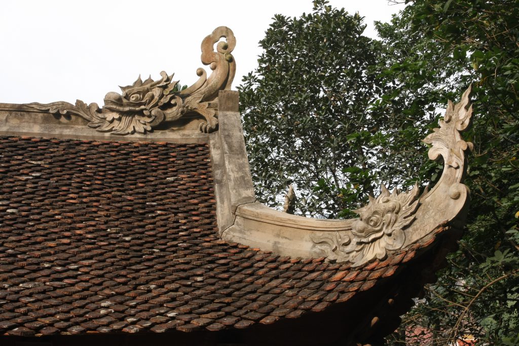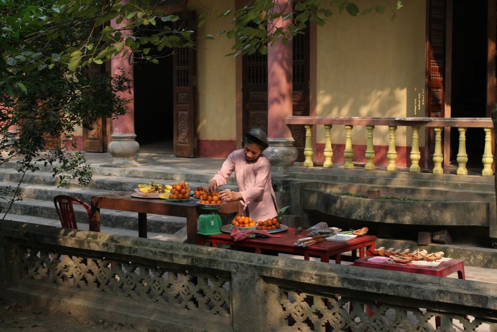 We gaan met z´n drieen weer op de motor op pad. Als we eenmaal Ninh Bình uit zijn moeten we een kaarsrechte asfaltweg volgen. Dit lijkt heel saai, maar een asfalt weg is hier ook geregeld een hobbelweg. De weg loopt een groot stuk langs een kanaal dat vol met planten staat met gammele bamboe bruggetjes eroverheen. Dan weer een lint van markten waar allerlei fruit, groenten en vlees verkocht wordt. Alle spullen moeten zo vers mogelijk met de brommer naar huis gebracht worden. Grote manden hangen aan de brommers en de kippen zitten in een kippenhokje, en de biggetjes in een biggen hok achterop.