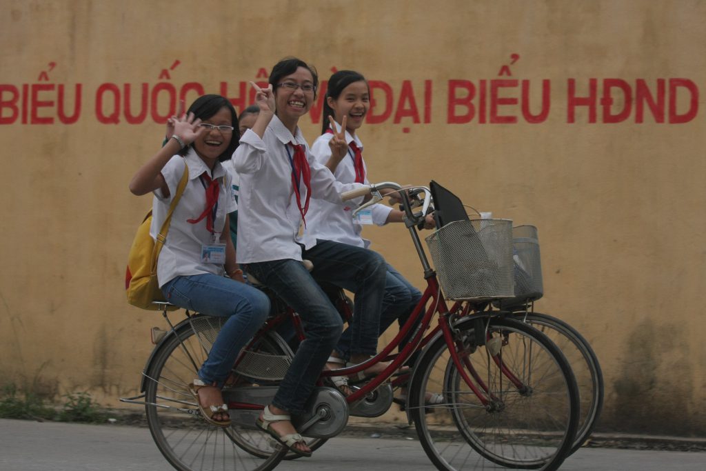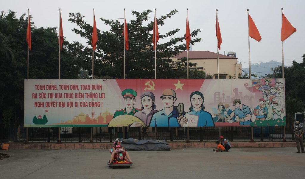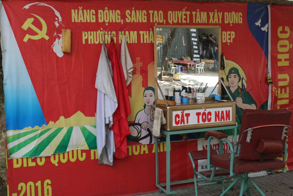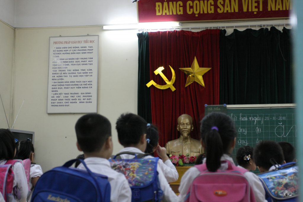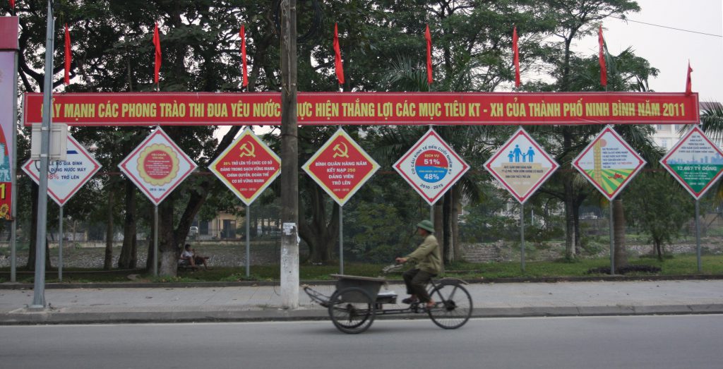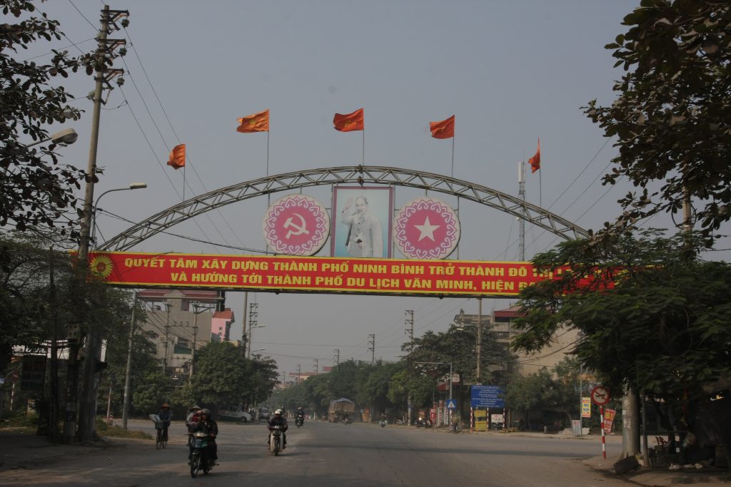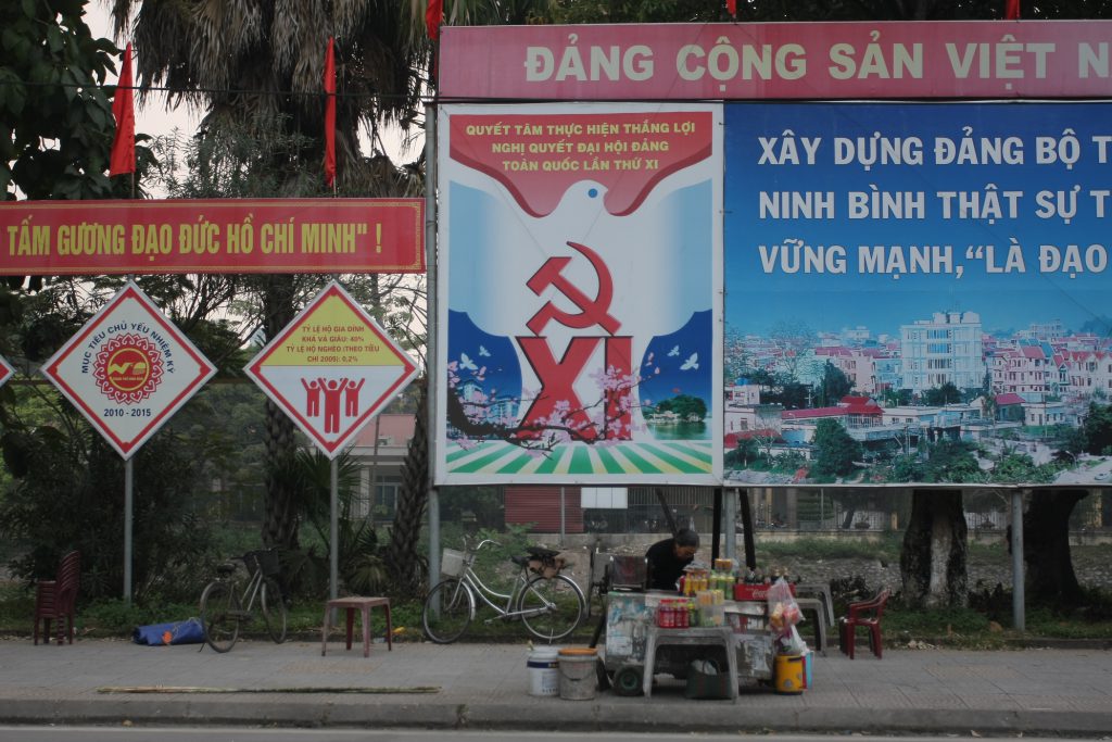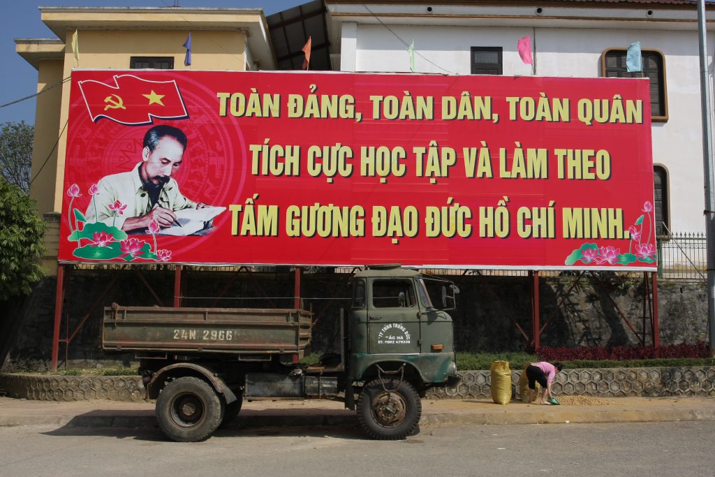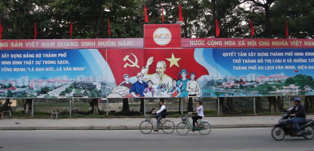 De mooiste en best onderhouden gebouwen die we tegenkomen zijn de kerken, banken en de gebouwen van de communistische partij. De rode vlag van Vietnam met de gele ster wappert naast de een rode vlag met hamer en sikkel in de straat en bovenop de gebouwen. In de straten staan kleine en grote buitenreclameborden met de beeltenissen van Ho Chi Min en de communistische model werknemers met leuzen. Het rood van de kapitalistische multinational Coca Cola is nog niet te zien. Tegen de avond zie je de kinderen met rode sjaaltjes met de fiets terug naar huis rijden na hun avond brainwash sessie bij de partij. Hoe communistisch is Vietnam? Naast China is Vietnam een van de snelst groeiende economieën, en naar chinees model hebben ze een partij geleide markteconomie. De communistische partij is de enige toegestane partij en die houd zich bezig met waar communistische partijen goed in zijn namelijk partijleden voortrekken, Facebook deblokkeren, en meningen van burgers worden goed in de gaten houden.