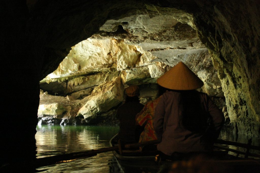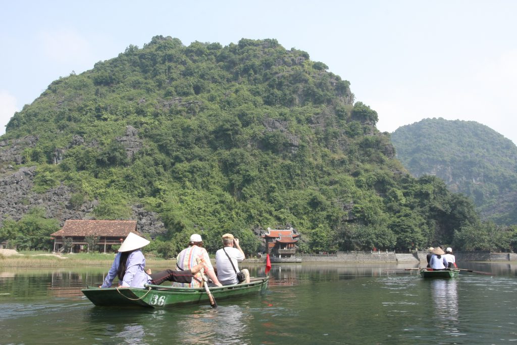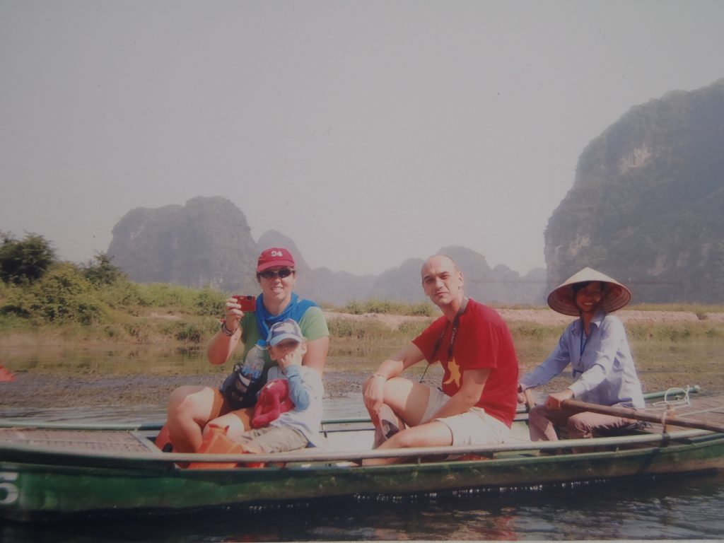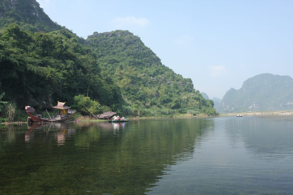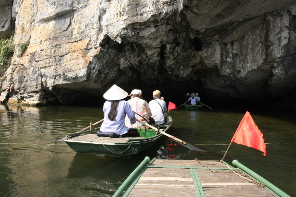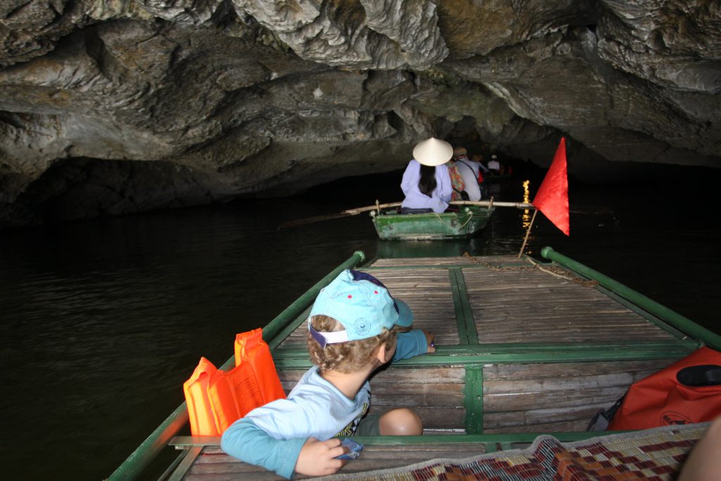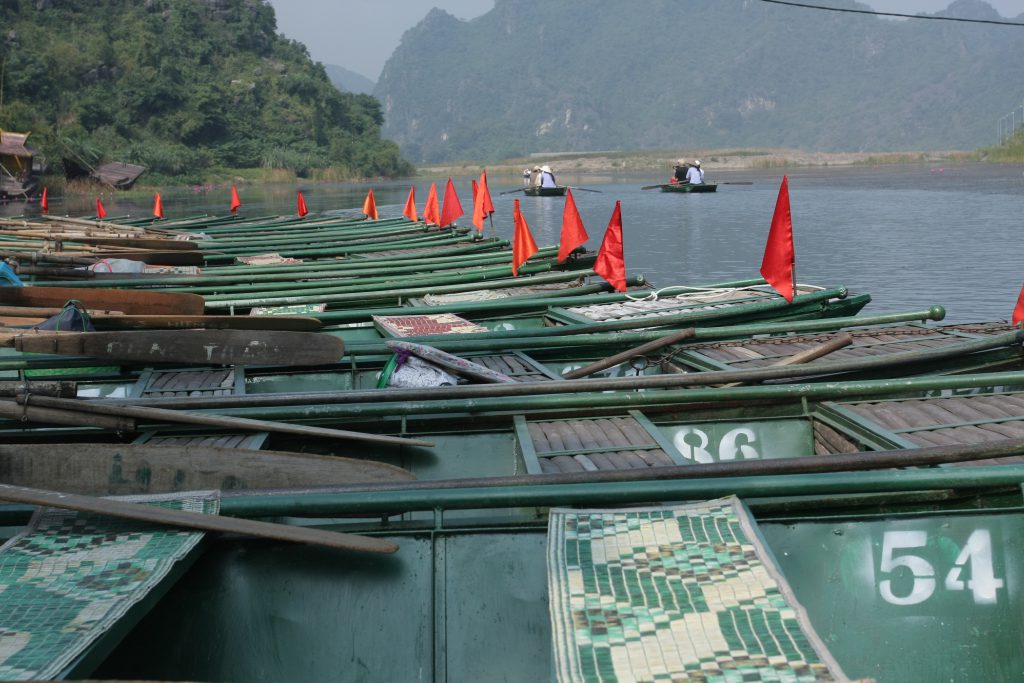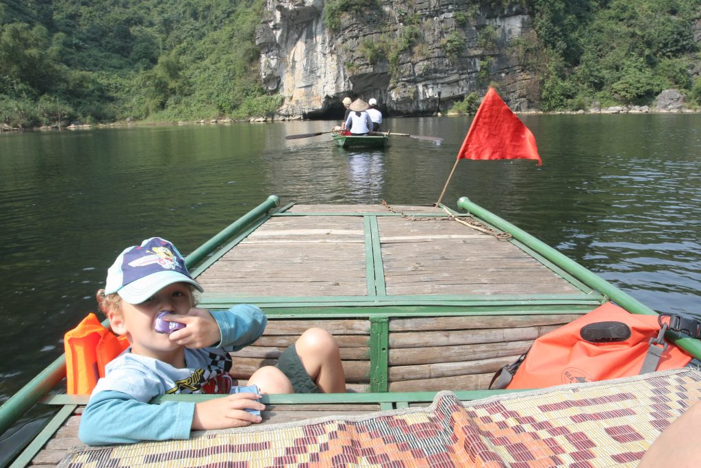 Met de motor gaan we naar Trang An. Hetzelfde verhaal natuurlijk, 20.000 Ðong voor de stalling, 10.000 Ðong voor een WC bezoek. Het is weer leuk geprobeerd maar we hebben er geen zin in, dus we betalen wat wij zien als redelijke prijzen. Voor 80.000 Ðong per persoon nemen we een boottocht, Simeon gaat weer gratis mee. Maar er moeten 3 personen in een boot zitten, dat vinden wij wel goed, maar we willen wel een zwemvest voor Simeon. Opeens is de bootvrouw verdwenen, en andere boten vertrekken met toeristen die na ons kwamen. Vreselijk irritant weer, maar dan komt de bootvrouw met de drijfvesten en hoeven we geen derde in de boot erbij. Ze wilden alleen maar aardig zijn dit keer, maar soms weet je het niet meer. De roeivrouw wil wel bij haar twee vriendinnen blijven die net weg zijn gevaren. Roeien gaat hier niet alleen met de handen, maar ook voor de afwisseling met de voeten. Over de vijver, langs limestone rotsen en langs de waterlelies, en dan door de grotten waar we net doorheen kunnen. Het is een mooie rustige plek.