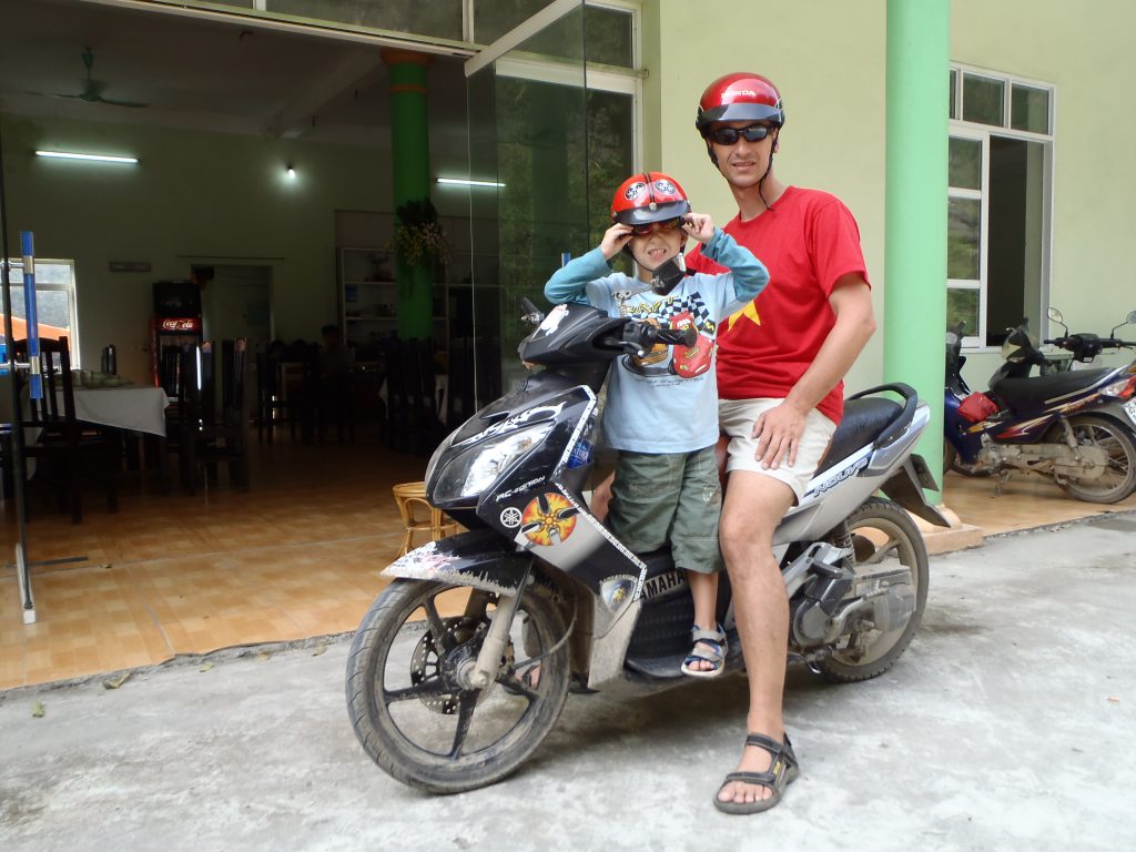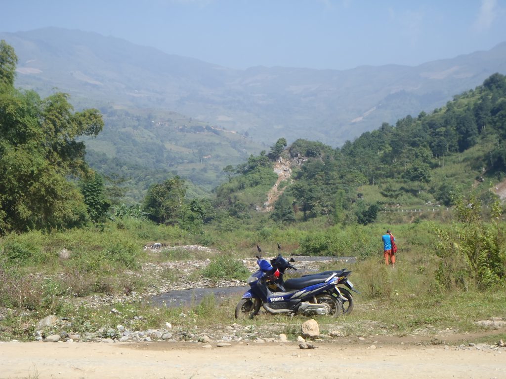Om tien uur s avonds gaan we hier slapen, en dan is alles al dicht in het dorp. De volgende morgen is het: “Gooooooooood morning Vietnam!!!”, maar in dit dorp gaat het iets anders. Boven het dorp staat een gebouw van de communistische partij, en iedere ochtend om exact zes uur gaat de radio over de luidsprekers om het dorp wakker te maken met slaapverwekkende praat. Gelukkig moeten we er vandaag ook vroeg uit. Oorspronkelijk hadden we voor 7:00 twee motors afgesproken, maar als we om 7:30 bij de motoren zijn moeten we wachten want de motorverhuurder is er nog niet, en ze willen ook meer dan dat we gisteren betaalden. Bij de benzinepomp tankt iedereen voor 40.000 Ðong, en Arjan geeft aan dat we ook dat willen. De pompbediende kijkt met een ongeïnteresseerde blik, en gooit er bij Arjan voor veel meer in. We roepen, wijzen, maar ze gaat gewoon door en bij 70.000 Ðong stopt ze, en bij Els herhaalt ze hetzelfde nog eens. Dat gaan we dus niet betalen, haal het er maar uit. In eerste instatie weigert ze dat, tja dan geven we wel 100.000 Ðong en rijden we weg. Ze grijpt een brommersleuteltje en rent wat weg. Als anderen haar een beetje tot bedaren hebben gebracht wordt de benzine weer uit de tank gehaald, en willen we weer opnieuw beginnen. Nu weigert ze ons nog benzine te geven, maar gelukkig is ze niet de enige die er werkt en kunnen we toch op pad.