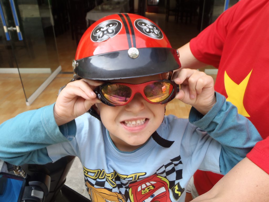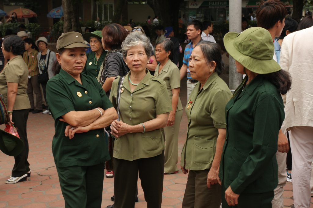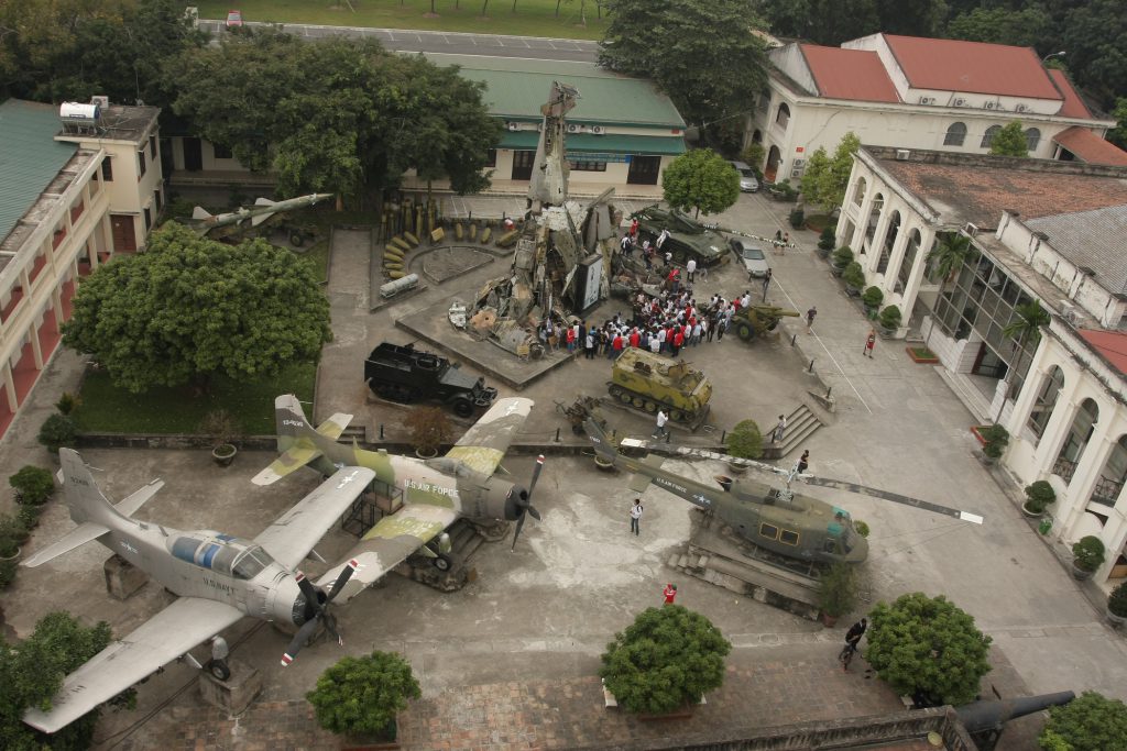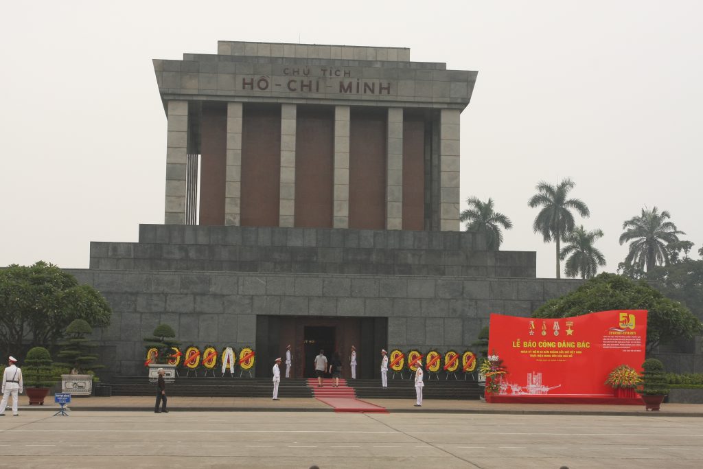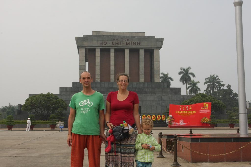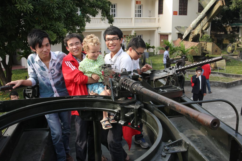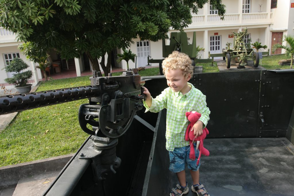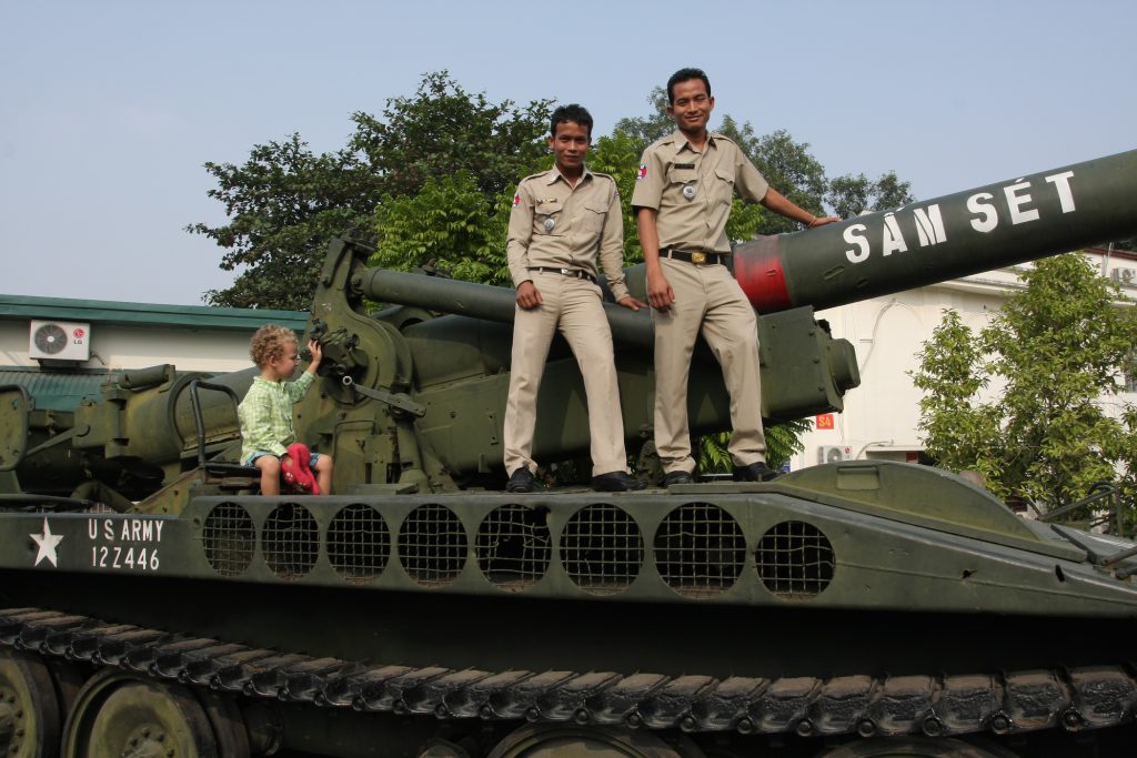 Kwartet roept Arjan als we het mausoleum uit lopen. Binnen was hij te schijterig om dat te doen. Daar lag de gebalsemde Ho Chi Minh met daarnaast 4 bewakers die er net zo levenloos uitzagen. Na Lenin in Moskou, Mao in Beijing is Ho Chi Minh in Hanoi de derde communistische leider die we gebalsemd zien liggen in zijn mausoleum. Soeche Bator in Ulan Bator konden we niet bezoeken omdat hij niet in de etalage lag. Maar wat is nou een Mongoolse communist als je om een echt kwartet te maken ook nog Kim Il-Sung in Pyongyang kunt bezoeken. Iedereen staat in zijn mooie kleren in de rij, want dit is een bijzondere dag. Er is ook een veteranen uitje van oude vrouwen in hun militaire pakje en hun vele onderscheidingen, en er is een bedrijfsuitjegroep mannen in pak. Wij hebben ook onze netste kleren aangetrokken, maar vallen toch een beetje uit de toon. Twee aan twee lopen we over de straat, en er is een lange rij, langs de bewakers en dan naar binnen het mausoleum in. We hebben geluk dat Ho er vandaag is, want deze maand is hij normaal op onderhouds-vakantie is Rusland. Oom Ho ligt er vredig bij, en 2 minuten later staan we weer buiten. Er is een groot respect, maar dit wordt minder afgedwongen zoals bij Lenin waar er heel scherp, en voor het gevoel met scherp, werd gekeken hoe je je gedroeg. Het bezoek verliep ook respectvoller dan bij Mao, waar er geen gaten in de rij mochten ontstaan. Indien er een gat ontstond werden de achterblijvers gemaand tot sneller lopen, waardoor erachter weer een gat ontstond en dus overal rennende mensen in de rij. Mao was wel zijn tijd het verste vooruit, want gelijk om de hoek kon de merchandise van Mao gekocht kon worden, hier is het kapitalisme toch iets verder op afstand gehouden. Hoe leg je aan een vierjarige uit wat een opgebaarde man is. We hebben maar gezegd dat het een pop is van de man die op al het Vietnamese geld staat. Een stuk verder staat het beeld van Lenin over een plein uit te kijken, en aan de andere kant van de straat ziet Arjan de toren van Hanoi. Er zijn niet zoveel torens in Hanoi omdat er niets hoger gebouwd mocht worden dan het koninklijk paleis, en als je iets hoopt te zien, dan zie je het ook. Naast de toren is het leger museum waar we, na een heerlijke cheese cake, vanaf het terras van Highland Coffee gratis inlopen. Het is de ideale speelplaats voor een zoon van redelijk pacifistische ouders. Want hier kan Simeon klimmen op allemaal in beslag genomen militaire voertuigen en vliegtuigen van de Amerikaanse oorlog. In tegenstelling tot het War Remnant museum in Saigon, waar de nadruk lag op het anti-amerikaanse en de gruweldaden , is de toon van dit museum meer “na-na-na-na-na jullie hebben verloren”. En de hedendaagse jeugd klimt ook op de voertuigen om foto’s te maken alsof ze zelf het voertuig hebben geconfisqueerd.