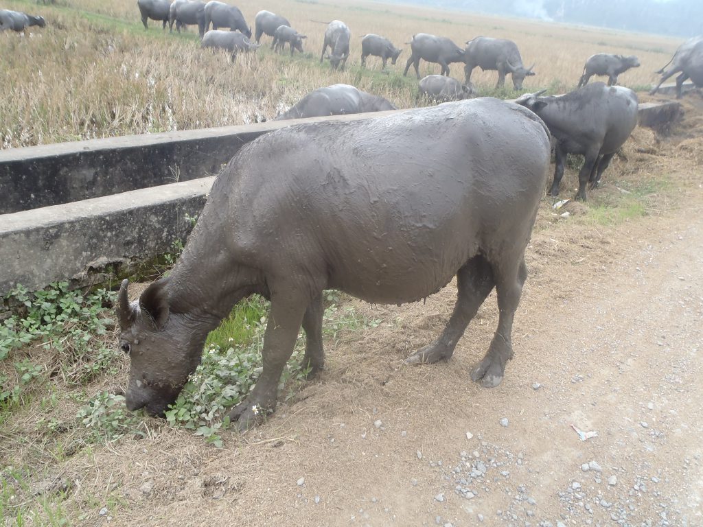 Rijstvelden, landerijen waar mensen op aan het werk zijn, en dan een katholieke begraafplaats, en een dorpje met een grote protserige kerk. We zitten hier in een stukje bible belt in Vietnam. Het zou allemaal een prachtig gezicht zijn als het niet heel de dag lijkt alsof het nacht aan het worden is. De wegen zijn stoffig, de waterlelies zijn uitgebloeid, de rijstvelden zijn helemaal bruin en de landerijen worden platgebrand wat een dikke smog veroorzaakt. Onze gezichten zijn zwart en de holtes zitten vol stof. We zijn blij als we weer in een stad komen en de frisse lucht van een stad kunnen snuiven.