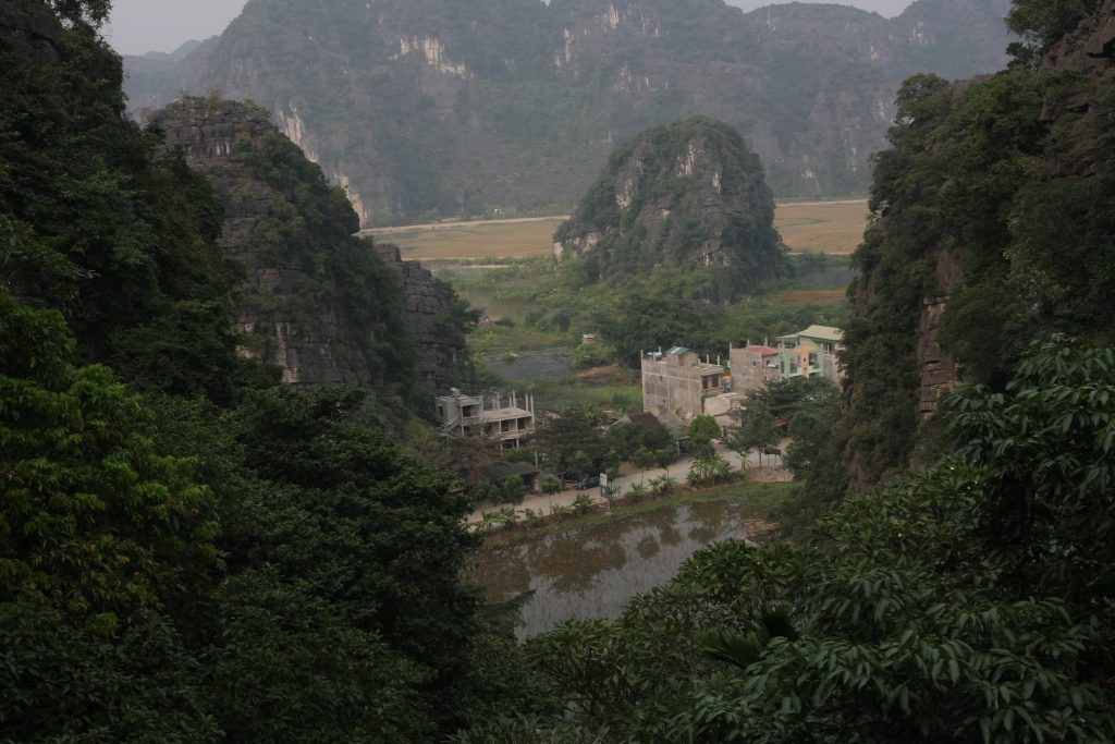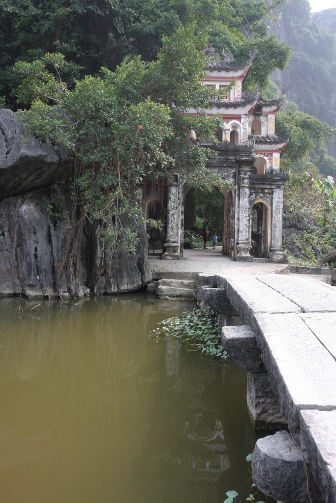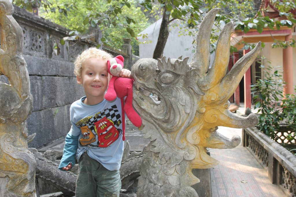 Met de brommer rijden we verder door het rotslandschap en komen bij de populairdere wat minder rustige plek Tam Coc. Hier druk met toeristen, winkeltjes, verkoopsters en mensen die je in een boot willen hebben. We kunnen nog iets verder doorrijden naar de Pagoda Bich Dong. We komen er nu achter dat pagoda gewoon een tempel is, en niet een Chinese pagoda zoals we in Hue hebben gezien. De tempel zit tegen een rots aan, en ook in de rots. Voor Simeon is het klimmen, en klimmen. Maar als de trappen voorbij zijn vindt Simeon dat we nog verder door kunnen klimmen, maar dan over de rotsen.