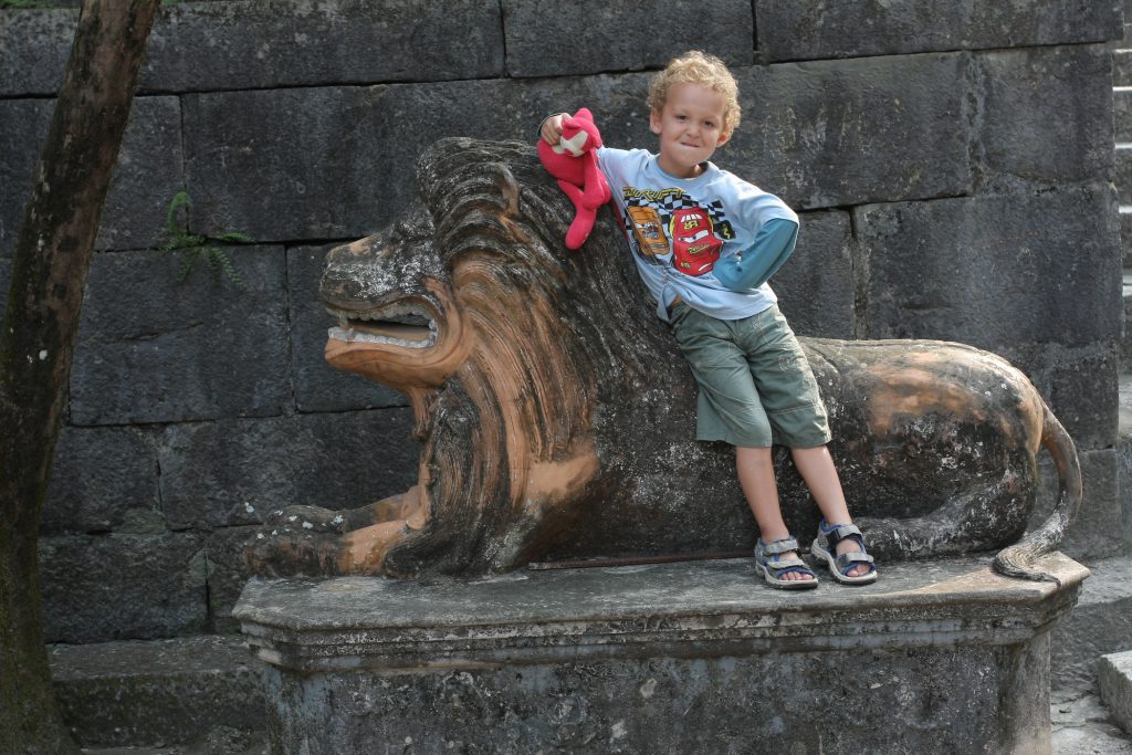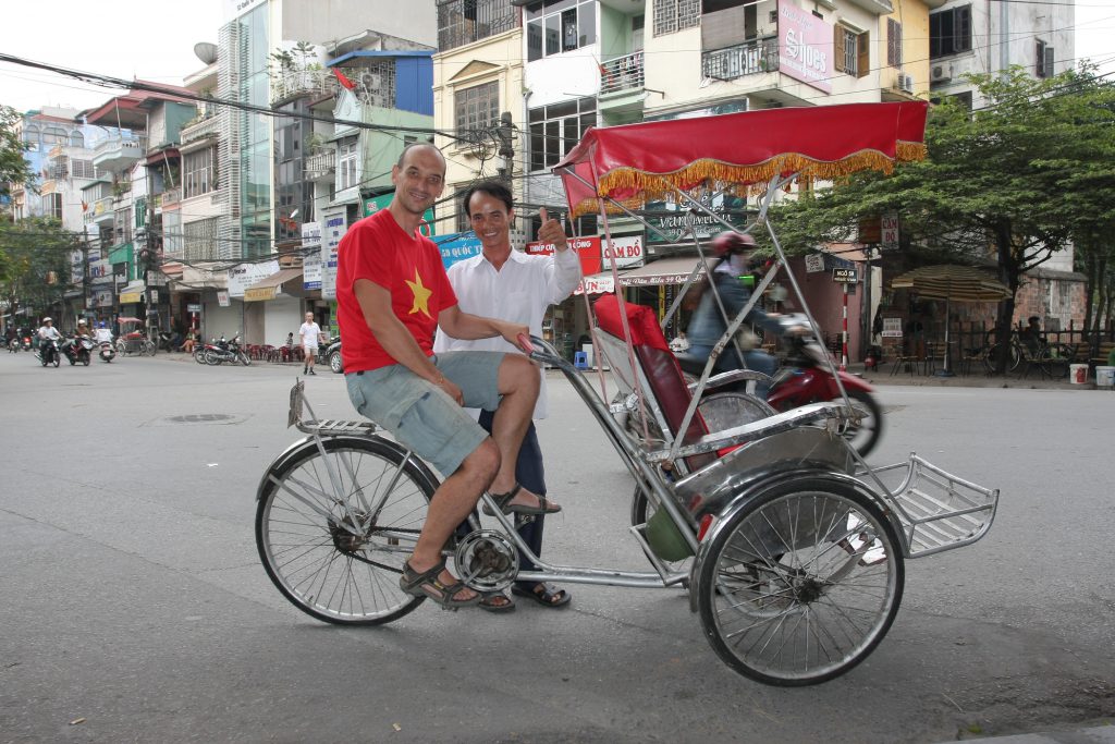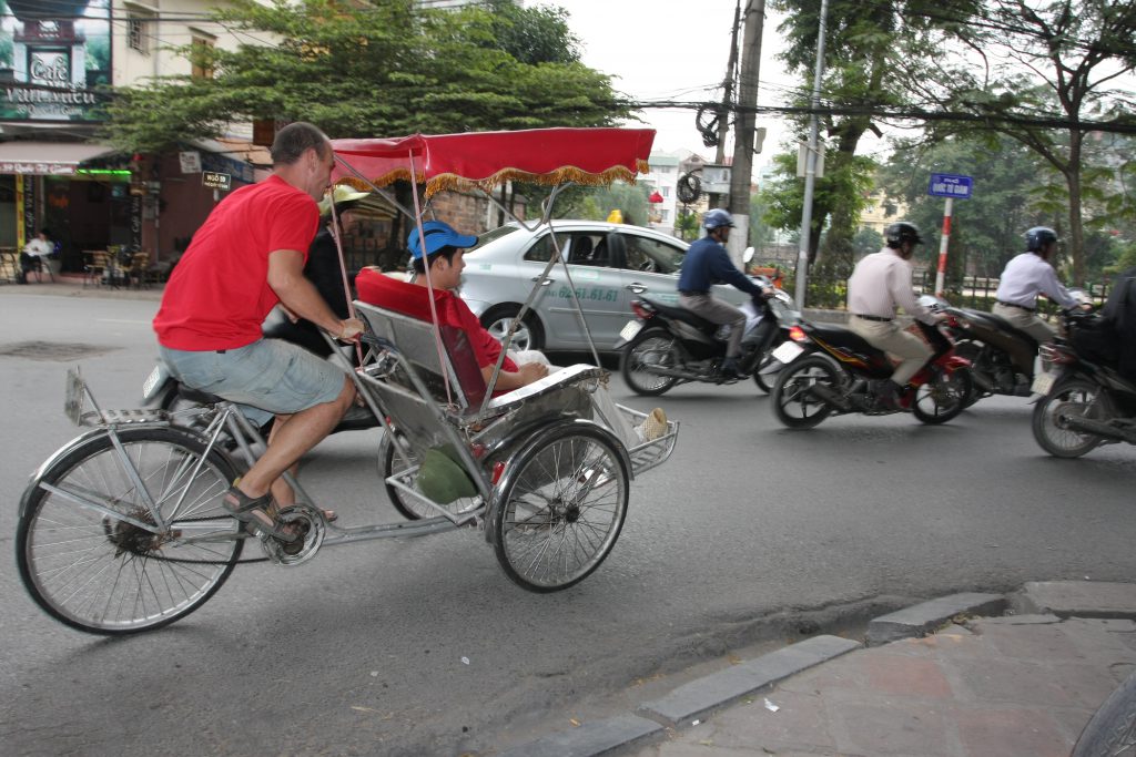 Wat Els en Arjan niet lukte, lukte de goed heiligman wel. In de straat met alleen maar speelgoed was er precies één Professor Z. te vinden. Simeon en Professor Z. zijn de volgende dag onafscheidelijk, en in één dag weet Simeon er een echte barrel van te maken. We doen verder de toeristische dingen in Hanoi, en in ons backpack hotel worden we er weer eens op de feiten gedrukt dat wij al heel oud zijn. Els kan zich amper bedwingen om de andere backpackers schoon te poetsen met een luierdoekje als ze vette handen hebben van het broodje gebakken ei bij het ontbijt. Ze geef ze uiteindelijk een servetje. Het water poppen theater is erg leuk maar bij de vis die in een draak verandert zie Simeon problemen ontstaan. “Als de draak niet weer in een vis terug kan veranderen, kunnen ze de voorstelling niet meer doen.” Met de fiets rickshaw worden we door de straten van de oude stad naar de literatuur tempel gebracht. Ik had verwacht dat de fietsers van de rickshaws beresterke fietsers zouden zijn, maar omdat het rondje een uur duurt, waarom zou je dan hard fietsen. Als Arjan een stukje op de fiets rickshaw rijdt gaat het gelijk harder, en wordt de fietser wel erg benauwd of dat wel goed gaat in het drukke verkeer. Met de Zee-post versturen we voor $30 weer een pakketje van 10 kilo naar huis. Nadat we het pakketje perfect hadden ingepakt en met een hele rol plakband hadden dichtgemaakt moet het pakketje weer open om te controleren wat er allemaal inzit. De literatuur tempel is een mooie afsluiter van Hanoi en Vietnam. Hanoi is een leuke stad om te verblijven, en we vinden er eindelijk Miss Saigon, ze was gewoon verhuisd.