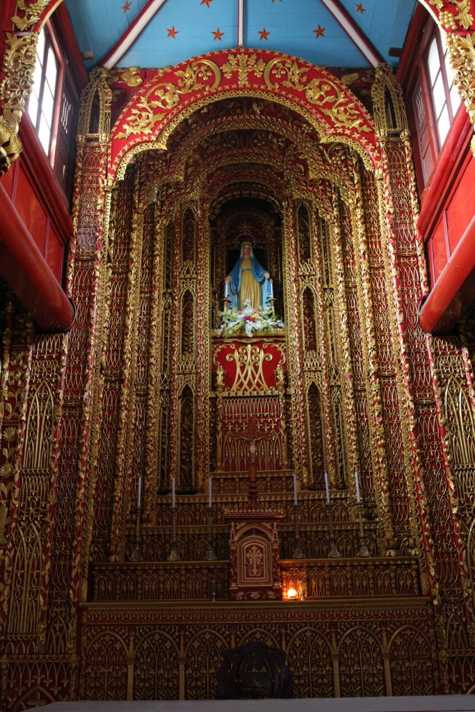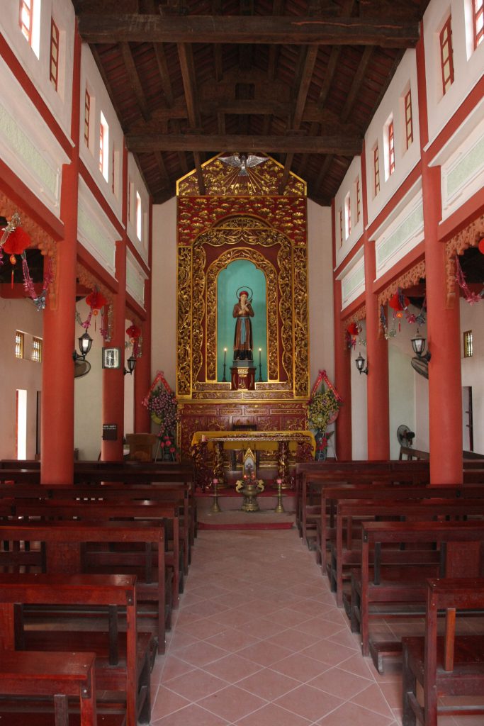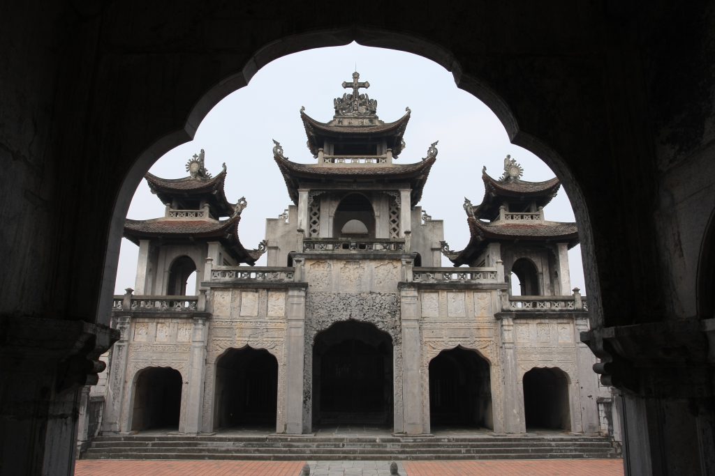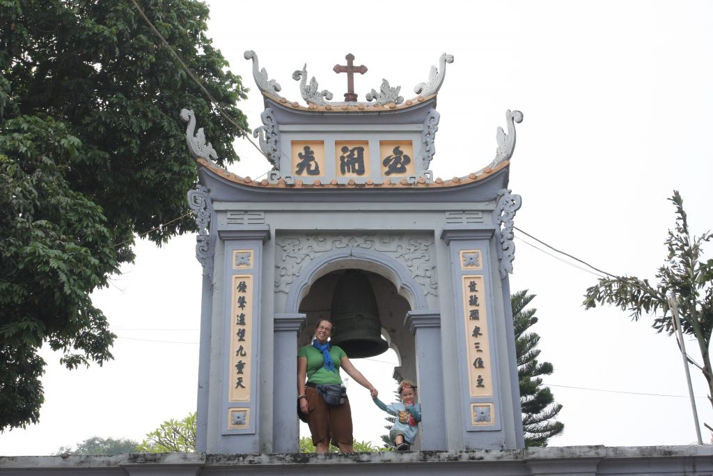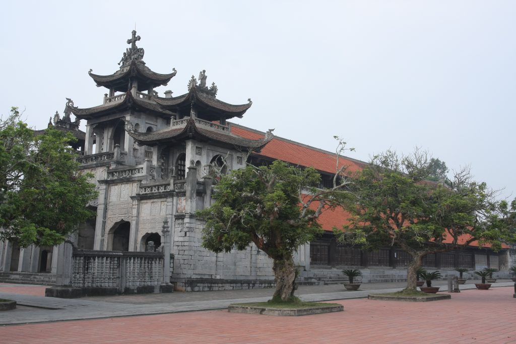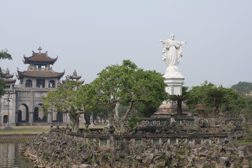 Uiteindelijk komen we aan bij de kathedraal van Phat Diem. Deze kerk lijkt op het eerste oog op een Chinese tempel, maar als je steeds beter kijkt zie je toch duidelijk dat het een kerk is. Het grote beeld van Jezus gaf al een een hint, en midden op het Chinese dak staat een groot kruis. We komen alleen precies als de kathedraal dicht gaat, en we moeten 2 uur wachten voordat de man die bij de deur zit terug is van van zijn Lunch.