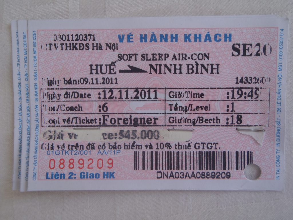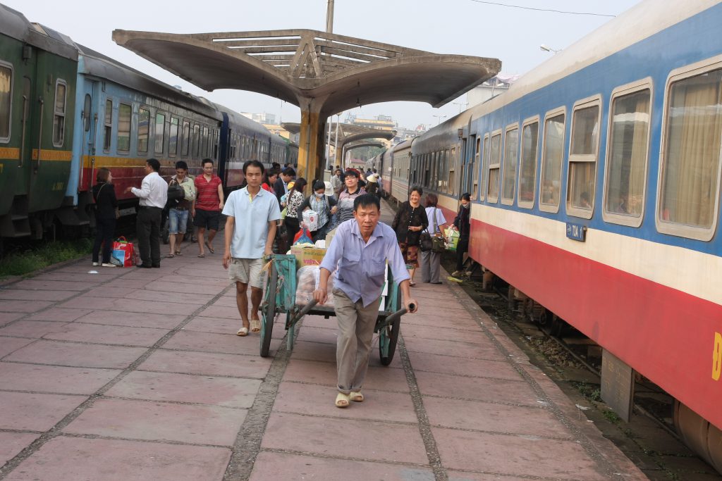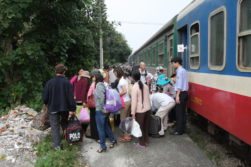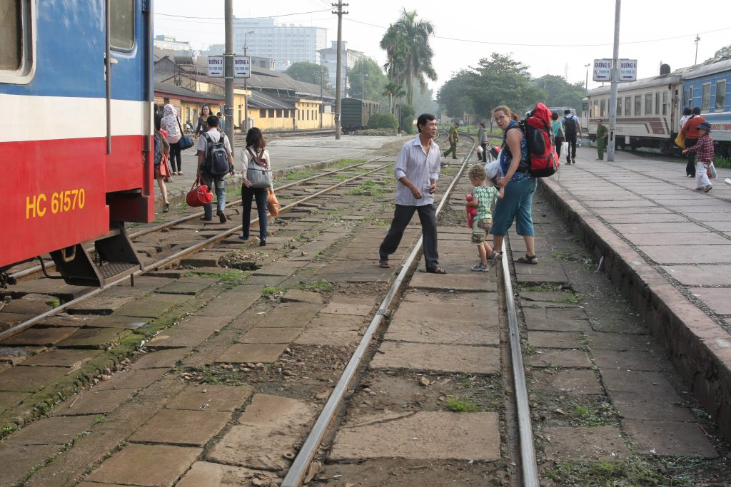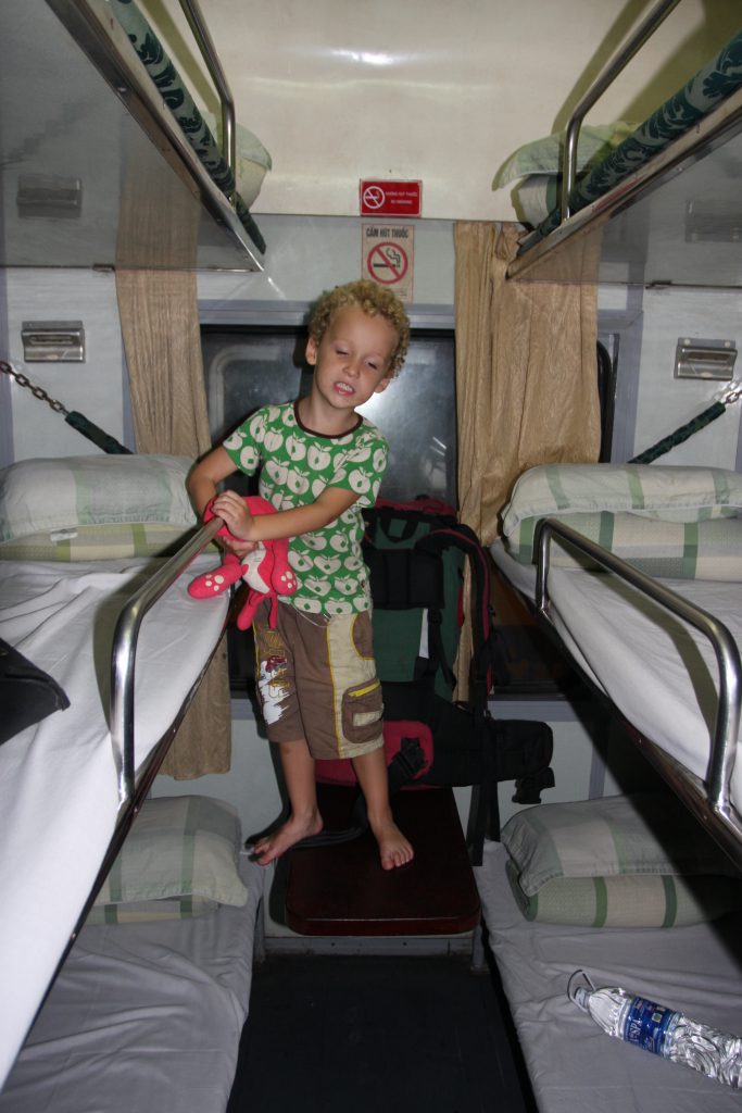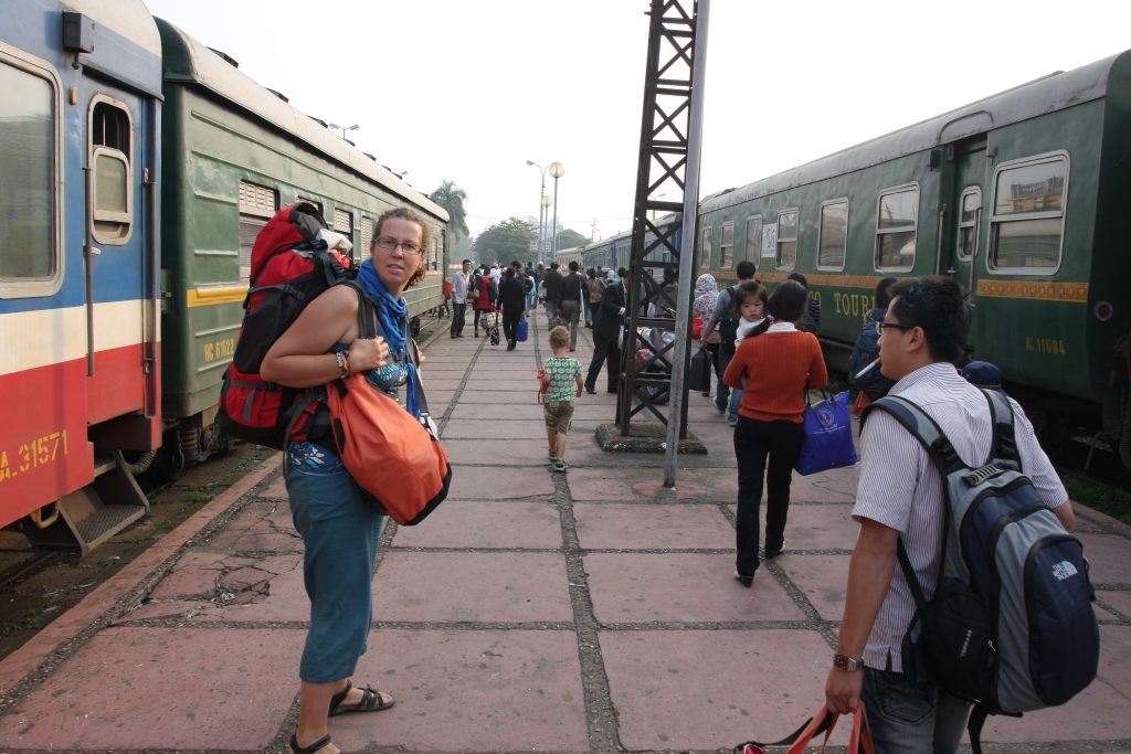 “2nd class hard sleeper is niet te doen voor westerse toeristen. Je moet 1st class soft sleeper nemen. Met z´n drieen in een coupe, en misschien het andere bed erbij kopen” wordt ons geadviseerd door een andere reiziger. Met een dagtrein reizen we van Ninh Bìhn naar Hà Nôi in drie uur. We willen de zelfde nacht nog verder naar Lao Cai en dan Bac Ha, aan de Chinese grens. Op het station zijn alleen nog stoelen voor de trein te koop, dus we zoeken verder bij wat reisbureaus. Voor een reisbureau dat alleen in vluchten doet zit een vrouw die wel aan een eerste klas kaartje kan komen. Als we vertellen dat we die kaartjes wel willen, gaat ze druk bellen en wil ze een miljoen Ðong voorschot, en is ze met de brommer weg. Na een half uur is ze terug en geeft ons het geld weer terug, en maakt ons duidelijk dat ze wel aan tweede klas kaartjes kan komen, voor de zelfde prijs. Die kunnen we zelf wel goedkoper regelen. Als we weglopen haalt ze ons weer terug : “Ik heb de kaartjes, andere trein en goedkoper” Die willen we natuurlijk wel, en dan begint ze weer druk te bellen. Nog 10 minuten, en een kwartier later heeft ze zeker over een kwartier kaartjes. We zijn het helemaal zat en kopen een paar winkels verderop 2ns class hard sleeper. Een half uur voor vertrek van de trein zijn de kaartjes er, met daarop de prijs van 0.000 Ðong. Wat het echt hoort te kosten blijft een raadsel. Over het spoor lopen van naar perron 10, en helemaal achteraan staat onze wagon. We passeren 10 wagons allemaal met toeristen met grote koffers op wieltjes en komen bij de vietnamezen met grote dozen en een paar backpackers. We hebben de bedden 37, 39 en 41, drie bedden boven elkaar in een coupe van 6. Er is natuurlijk maar 1 bed waar Simeon genoegen mee neemt, en dat is het bovenste. Arjan stelt Els nog gerust voor het slapen gaan, als hij naar beneden valt moet ie eerst langs hem. Er zijn nog 4 vrouwen voor de andere 3 bedden, want er is een kaartje dubbel verkocht. Er wordt gelijk naar Simeon gekeken want een 4 jarige mag gratis reizen als hij bij z’n ouders in bed ligt, maar voor hem hebben we een eigen bed betaald. 2nd class hard sleeper is wat krapper boven je hoofd maar verder ligt het lekker en is de coupe minder muf dan de 1st class van een paar dagen geleden en minder saai. Er wordt een matras tevoorschijn gehaald en de overtallige vrouw kan in het gangpad slapen, en op het balkon ligt nog een hele familie te slapen. Om 05:00 als we het perron oprijden worden we wakker gemaakt. We laten eerst de vrouwen alles inpakken, en dan worden we door de conducteur opgejaagd dat we er snel uit moeten. Een lange stoet mensen loopt in het donker het station uit.