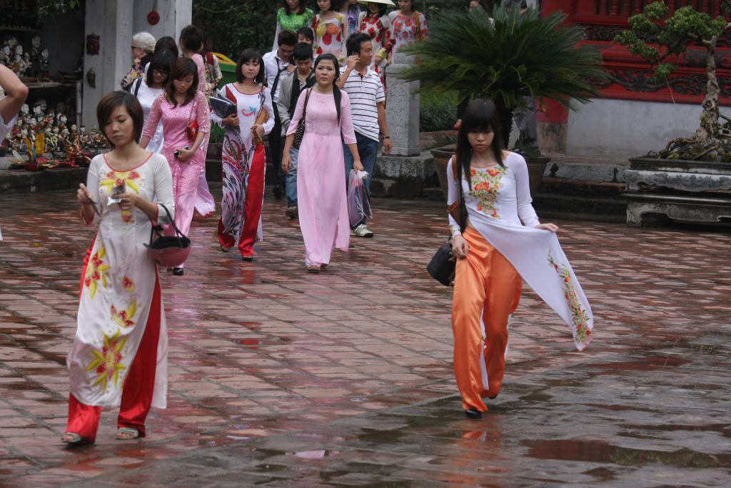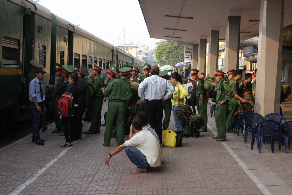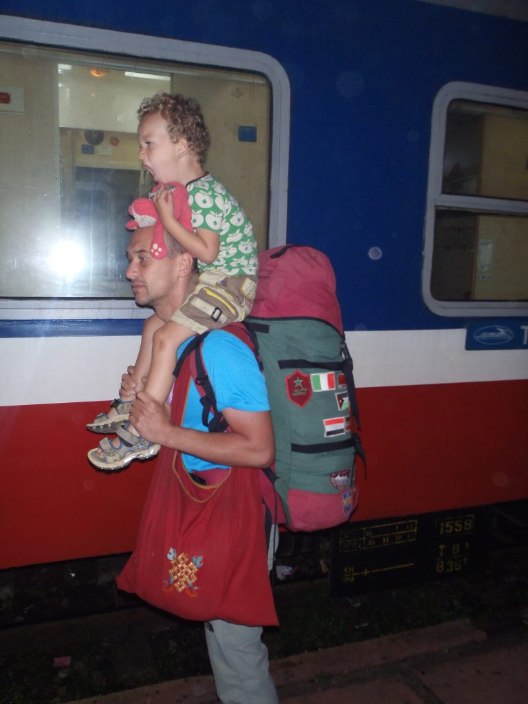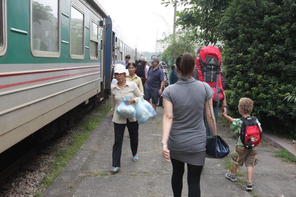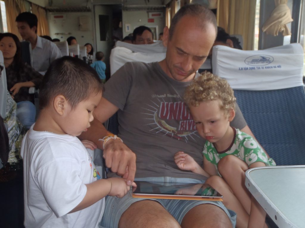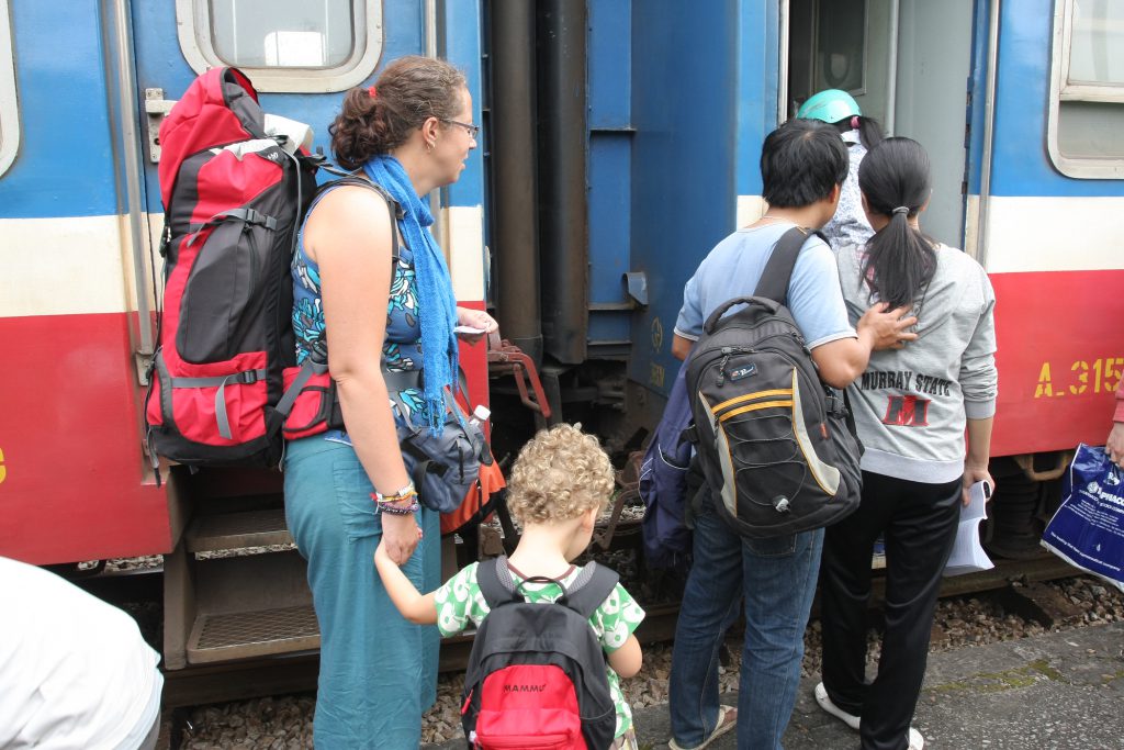 “2nd class hard sleeper is niet te doen voor westerse toeristen. Je moet 1st class soft sleeper nemen. Met z´n drieen in een coupe, en misschien het andere bed erbij kopen” wordt ons geadviseerd door een andere reiziger. Met een dagtrein reizen we van Ninh Bìhn naar Hà Nôi in drie uur. We willen de zelfde nacht nog verder naar Lao Cai en dan Bac Ha, aan de Chinese grens. Op het station zijn alleen nog stoelen voor de trein te koop, dus we zoeken verder bij wat reisbureaus. Voor een reisbureau dat alleen in vluchten doet zit een vrouw die wel aan een eerste klas kaartje kan komen. Als we vertellen dat we die kaartjes wel willen, gaat ze druk bellen en wil ze een miljoen Ðong voorschot, en is ze met de brommer weg. Na een half uur is ze terug en geeft ons het geld weer terug, en maakt ons duidelijk dat ze wel aan tweede klas kaartjes kan komen, voor de zelfde prijs. Die kunnen we zelf wel goedkoper regelen. Als we weglopen haalt ze ons weer terug : “Ik heb de kaartjes, andere trein en goedkoper” Die willen we natuurlijk wel, en dan begint ze weer druk te bellen. Nog 10 minuten, en een kwartier later heeft ze zeker over een kwartier kaartjes. We zijn het helemaal zat en kopen een paar winkels verderop 2ns class hard sleeper. Een half uur voor vertrek van de trein zijn de kaartjes er, met daarop de prijs van 0.000 Ðong. Wat het echt hoort te kosten blijft een raadsel. Over het spoor lopen van naar perron 10, en helemaal achteraan staat onze wagon. We passeren 10 wagons allemaal met toeristen met grote koffers op wieltjes en komen bij de vietnamezen met grote dozen en een paar backpackers. We hebben de bedden 37, 39 en 41, drie bedden boven elkaar in een coupe van 6. Er is natuurlijk maar 1 bed waar Simeon genoegen mee neemt, en dat is het bovenste. Arjan stelt Els nog gerust voor het slapen gaan, als hij naar beneden valt moet ie eerst langs hem. Er zijn nog 4 vrouwen voor de andere 3 bedden, want er is een kaartje dubbel verkocht. Er wordt gelijk naar Simeon gekeken want een 4 jarige mag gratis reizen als hij bij z’n ouders in bed ligt, maar voor hem hebben we een eigen bed betaald. 2nd class hard sleeper is wat krapper boven je hoofd maar verder ligt het lekker en is de coupe minder muf dan de 1st class van een paar dagen geleden en minder saai. Er wordt een matras tevoorschijn gehaald en de overtallige vrouw kan in het gangpad slapen, en op het balkon ligt nog een hele familie te slapen. Om 05:00 als we het perron oprijden worden we wakker gemaakt. We laten eerst de vrouwen alles inpakken, en dan worden we door de conducteur opgejaagd dat we er snel uit moeten. Een lange stoet mensen loopt in het donker het station uit.