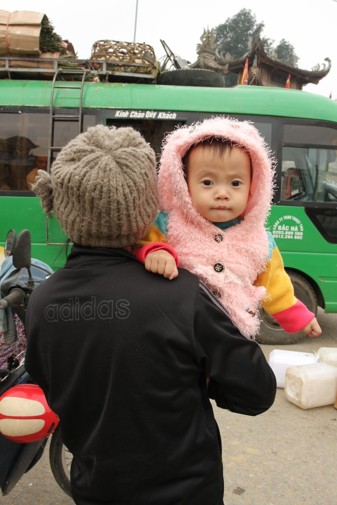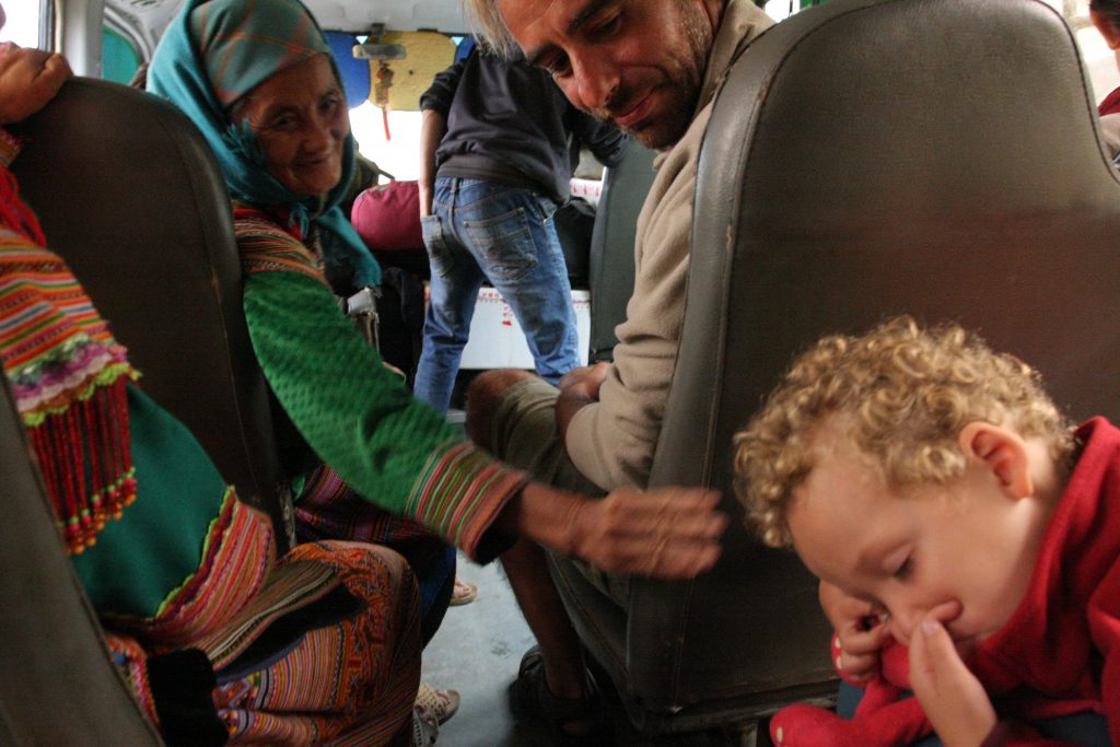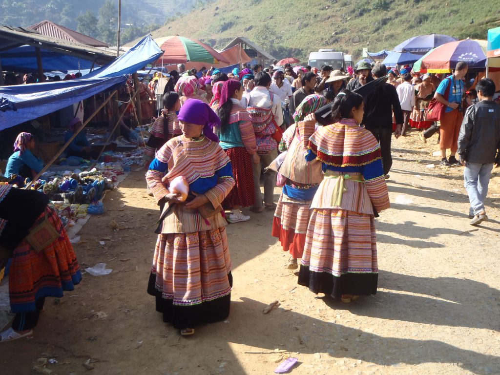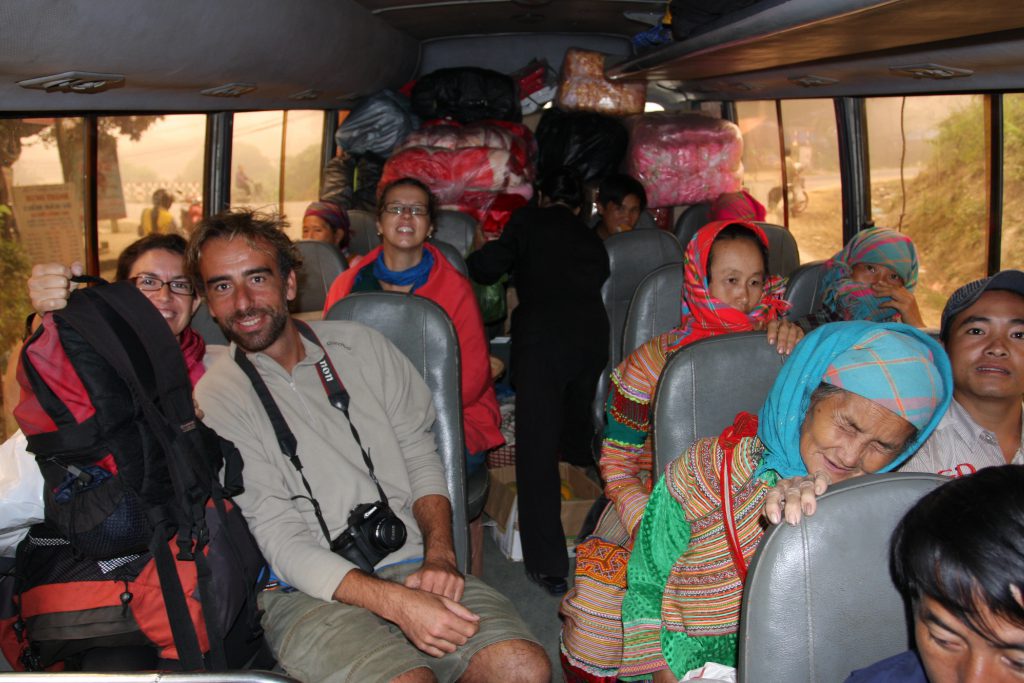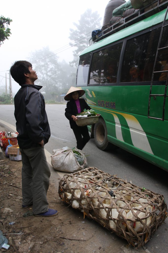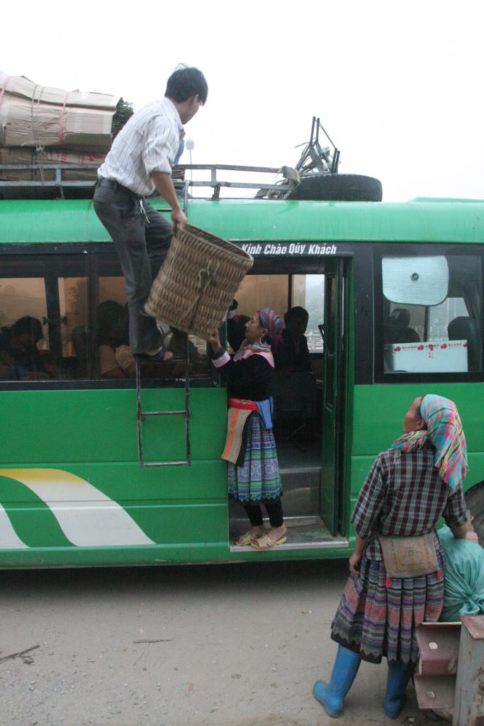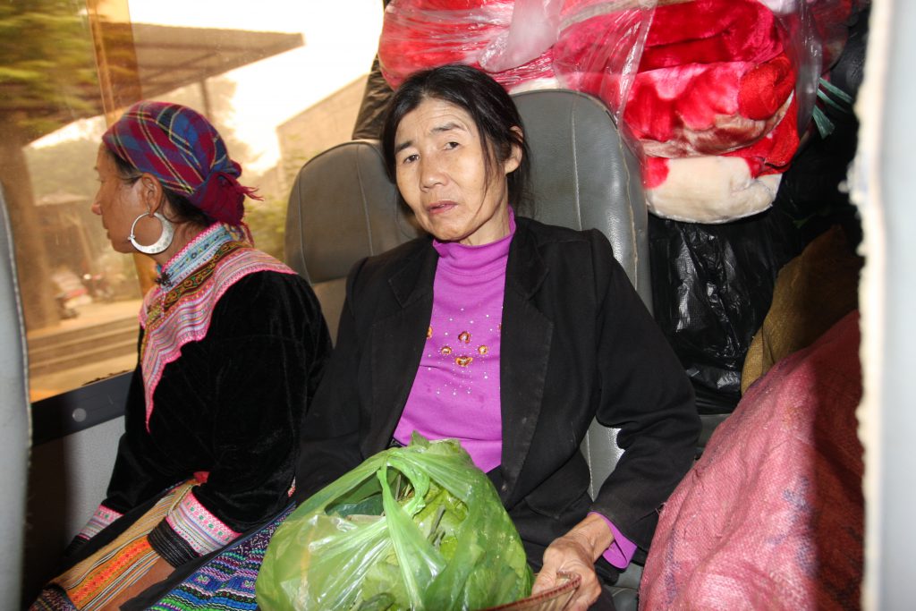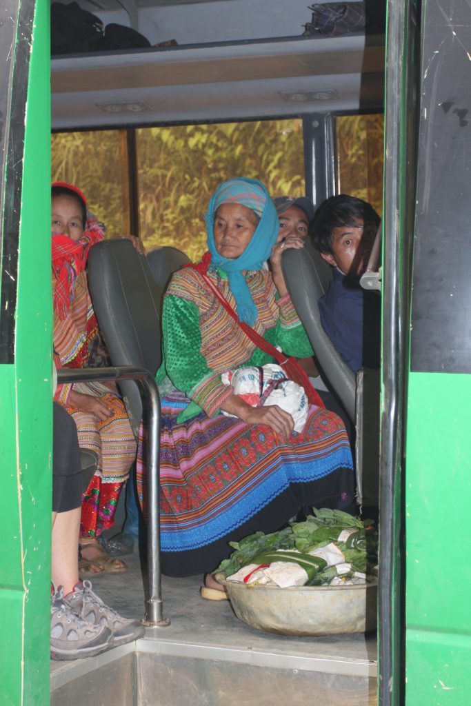 Er is vanaf hier maar een logische bestemming en dat is Sapa, en als je vraagt waarom dan krijg je het antwoord omdat alle toertjes daar naartoe gaan. Met nog een Italiaans/Spaans stel zoeken wij transport naar Bac Ha. Het moet ongeveer 80.000 Ðong per persoon zijn maar de prijs begint op 200.000 Ðong. De minibusjes en taxi’s gaan liever voor hogere bedragen naar Sapa, maar iemand wil ons wel voor 600.000 Ðong voor alle 5 meenemen. We moeten even aan de andere kant van de weg wachten, en dan komt een oude gammele bus met passagiers voorrijden. De onderhandelingen gaan weer verder en uiteindelijk betalen we 450.000 Ðong. Ondertussen is de volgende trein ook al aangekomen vanuit Hà Nôi, maar niemand die naar Bâc Hà gaat, dus gaan we rustig op pad. Er moeten eerst nog wat dozen bloemen, kippen, groenten en jerry cans opgehaald worden, en dan begint de tocht. Na nog een paar stops zitten er al meer minderheden in klederdracht in onze bus dan dat we in Noord-Thailand totaal hebben gezien. De lange dag en korte nacht zijn we alweer vergeten, want dit is wat we toch het mooist vinden.